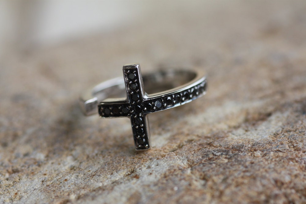 Cross ring with black diamonds mounted on White Gold K18, a statement ring for men and women.