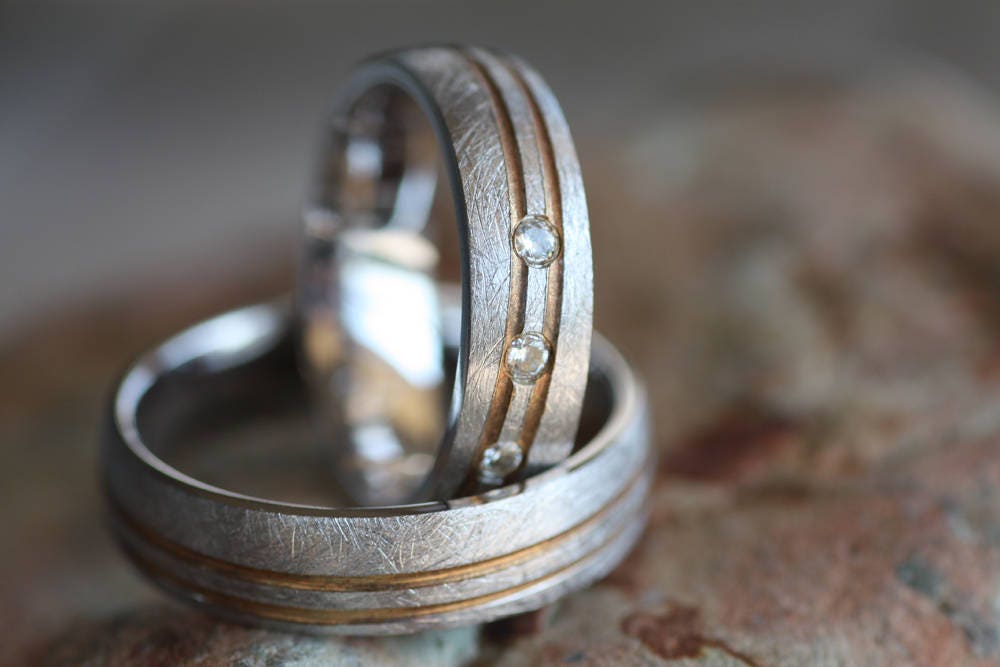 Gold Wedding ring made of White Gold 9K, 14K or 18K, simple, brushed finish, originally made at 5mm wide and 1.4mm thick, but they can be custom made thinner or wider for you. You can choose diamonds, (white, black or cognac), or sapphires (yellow or pink), share your idea and desire with me and we will find the best choice for you.