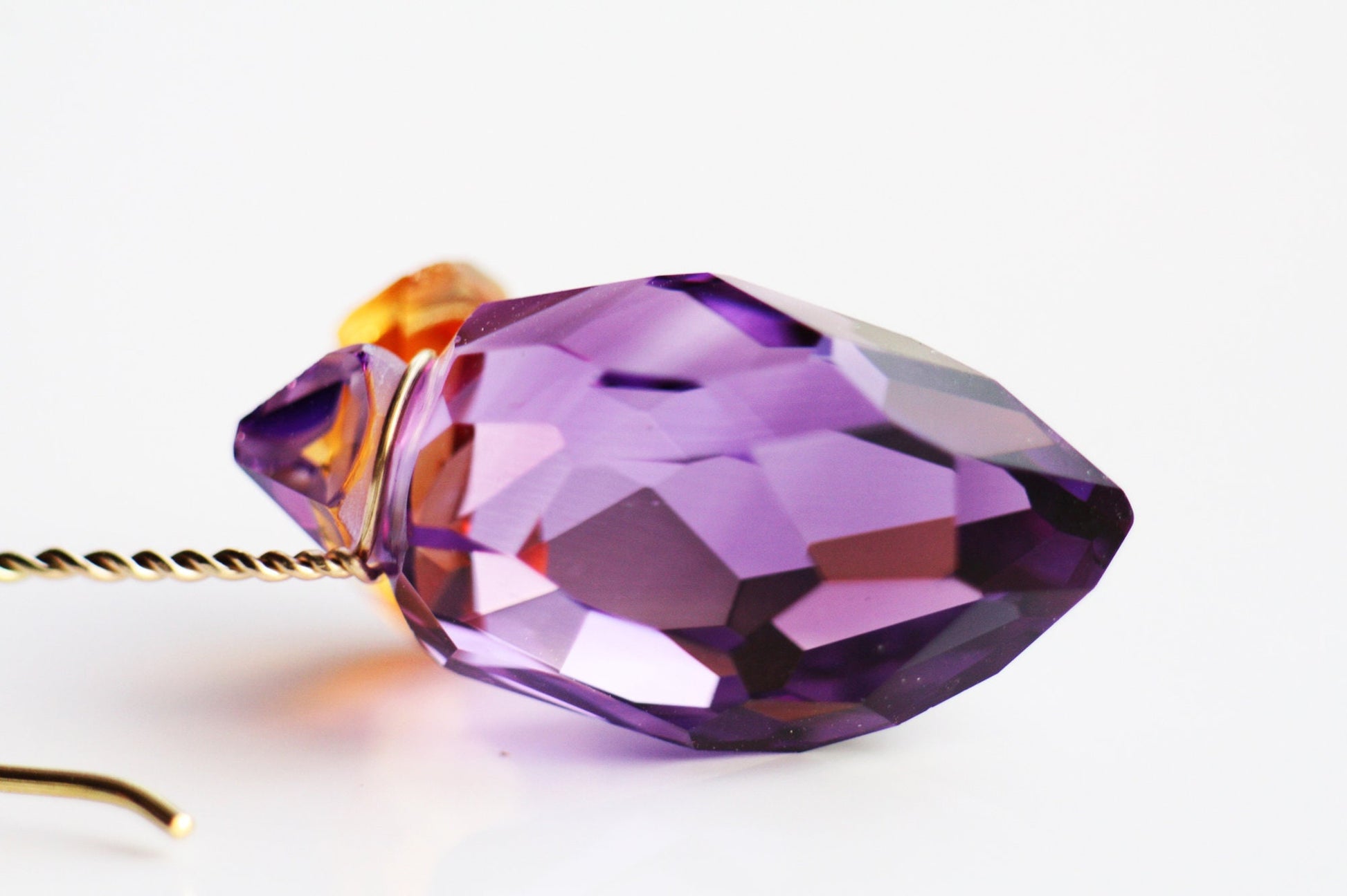 This handcrafted piece features K18 golden wire, a 21-carat amethyst, and a 9.20-carat citrine. All gems are natural and hand-cut to enhance light reflection, making each stone unique.