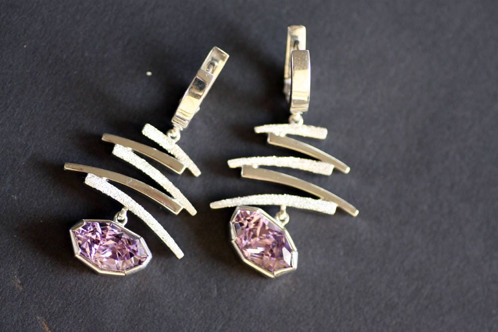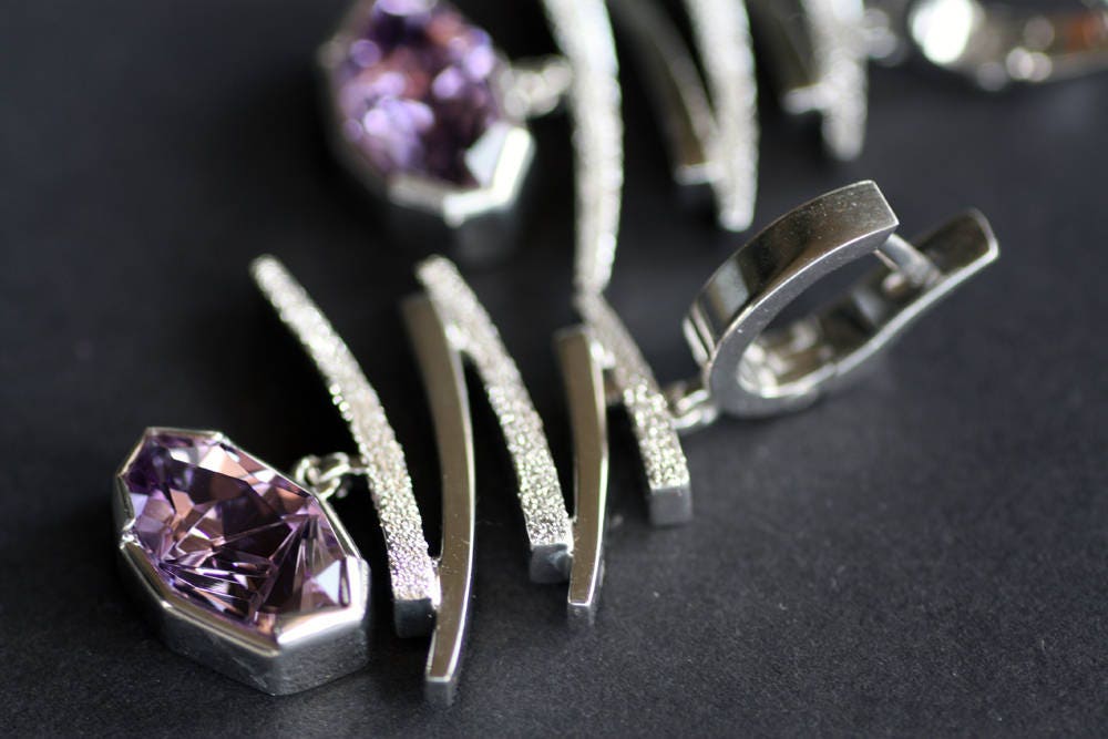 Unique piece of jewellery, Amethysts handcrafted set on Sterling Silver white-gold plated earrings.
