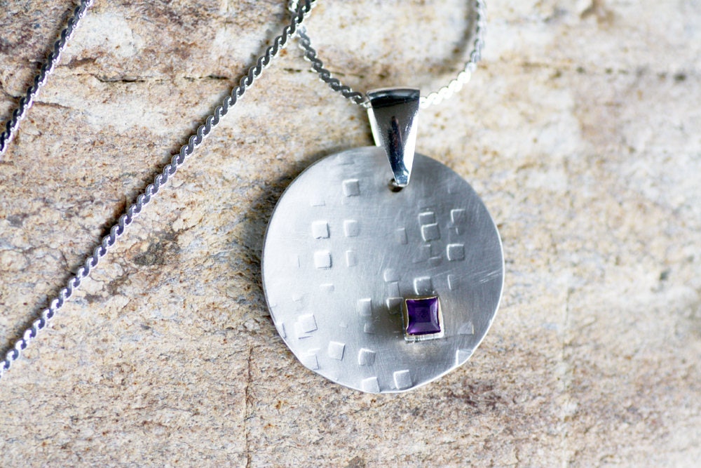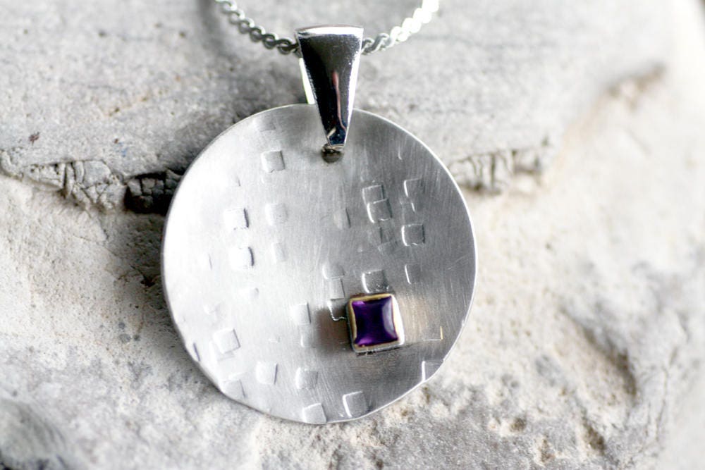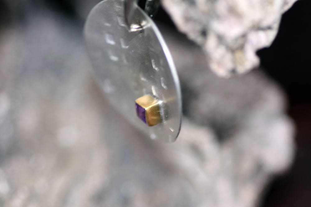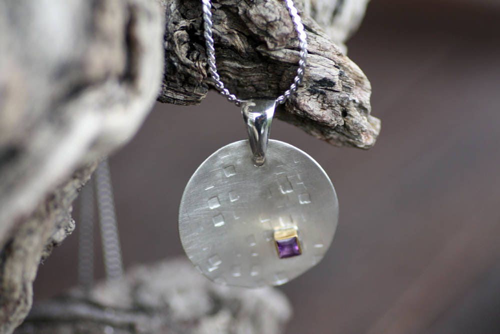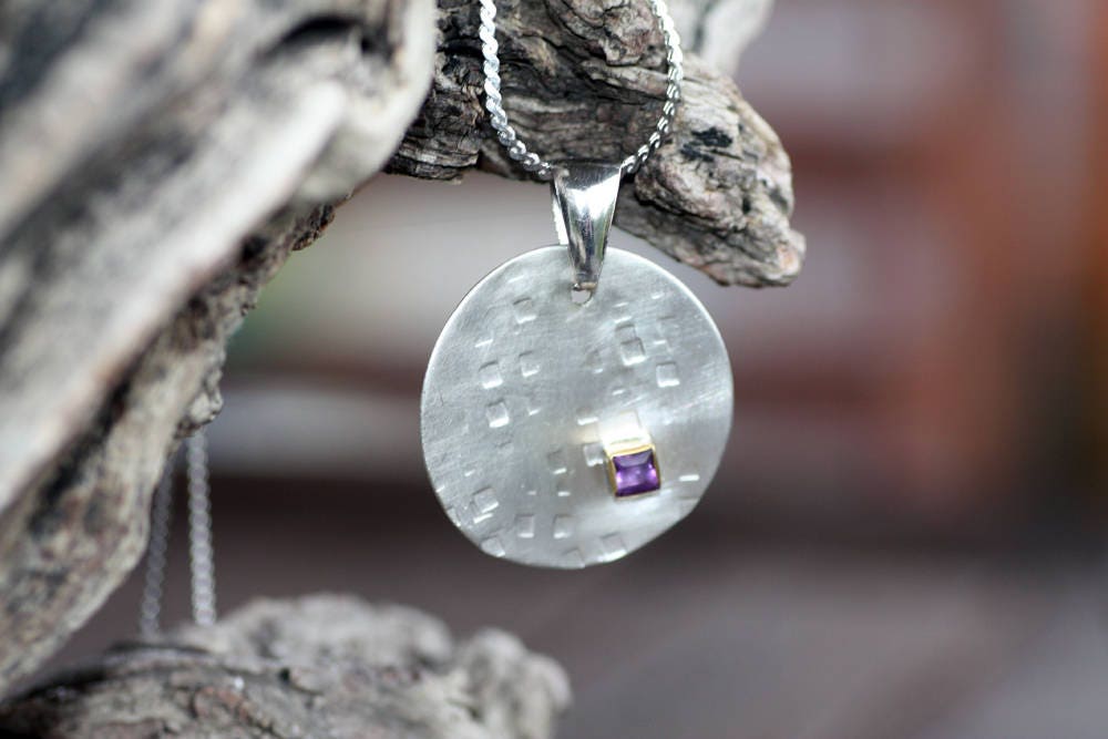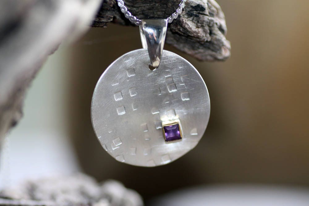 A very carefully hammered round pendant made of Sterling Silver, white-gold plated, an Amethyst 5x5mm dimensions and 0,52ct weight mounted on a Gold 14k bezel making a plain and simple combination of the two precious metals for every day use.