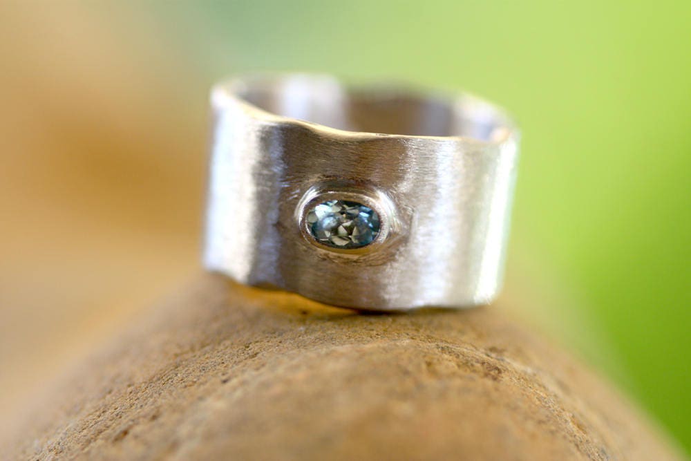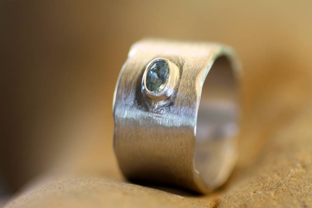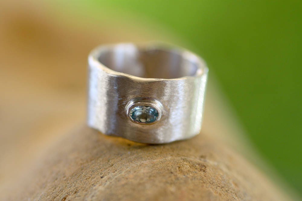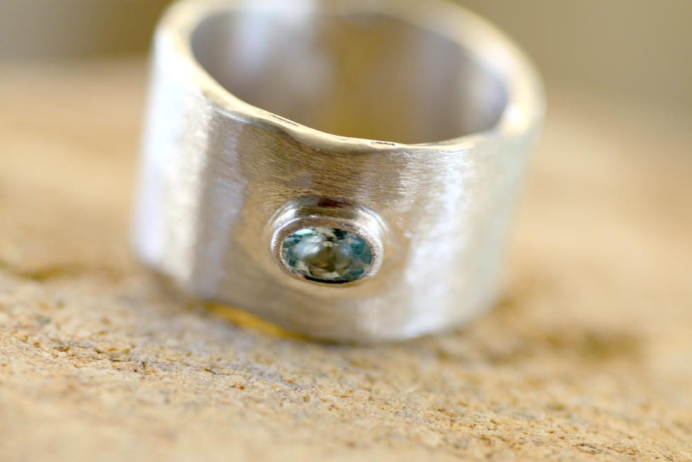 Wide ring made of Sterling Silver with a beautiful Oval Aquamarine, white gold plated.