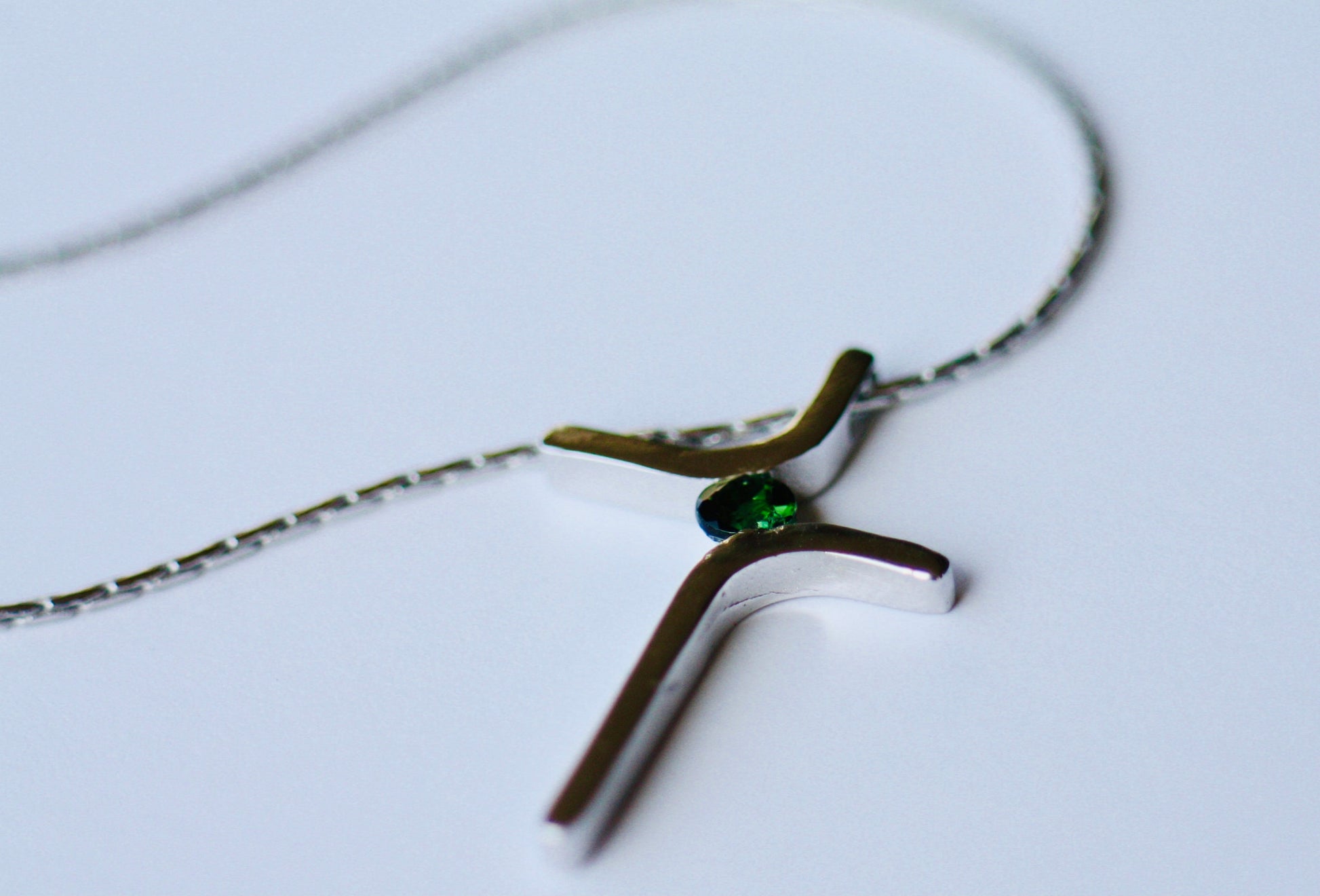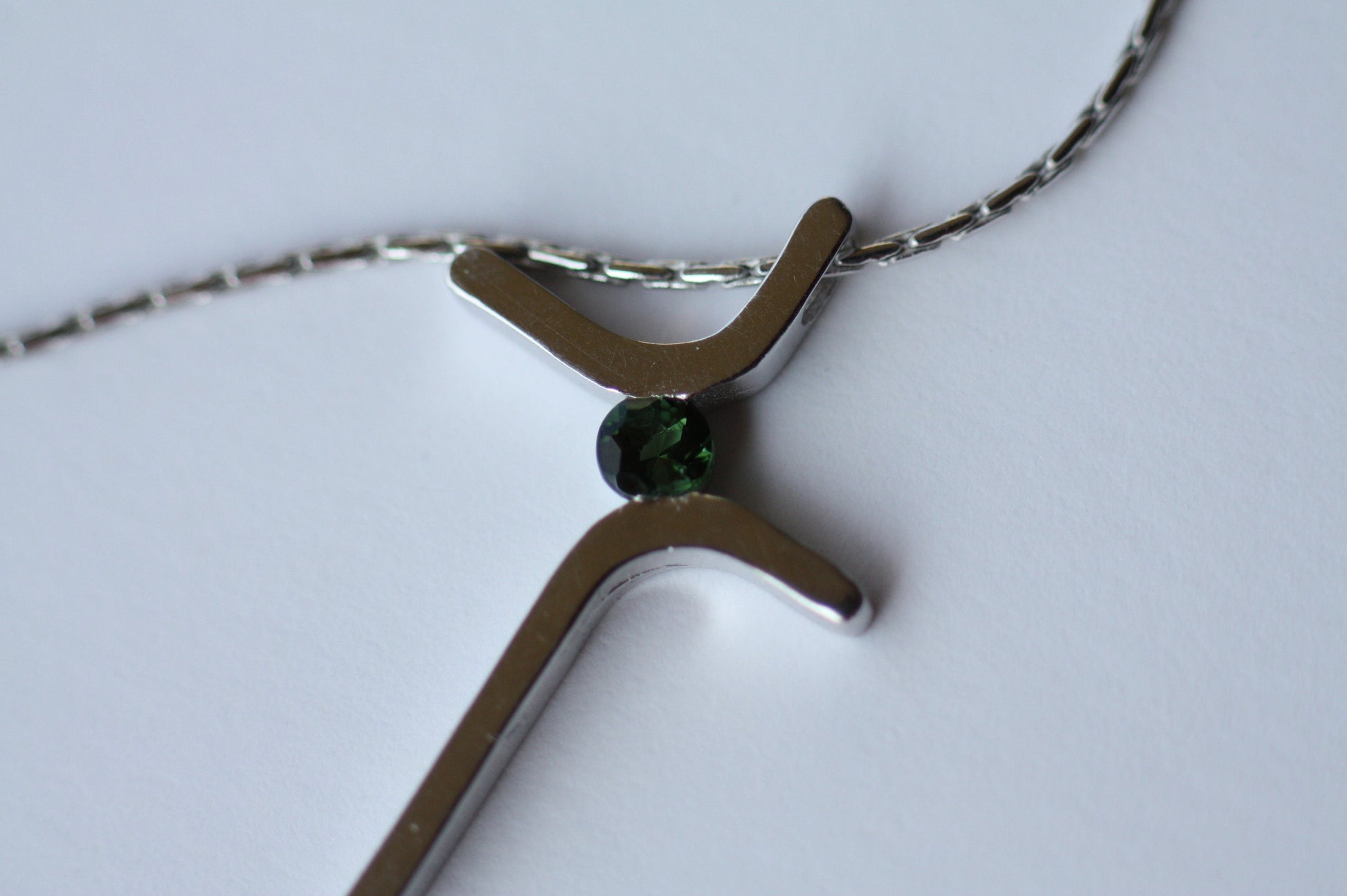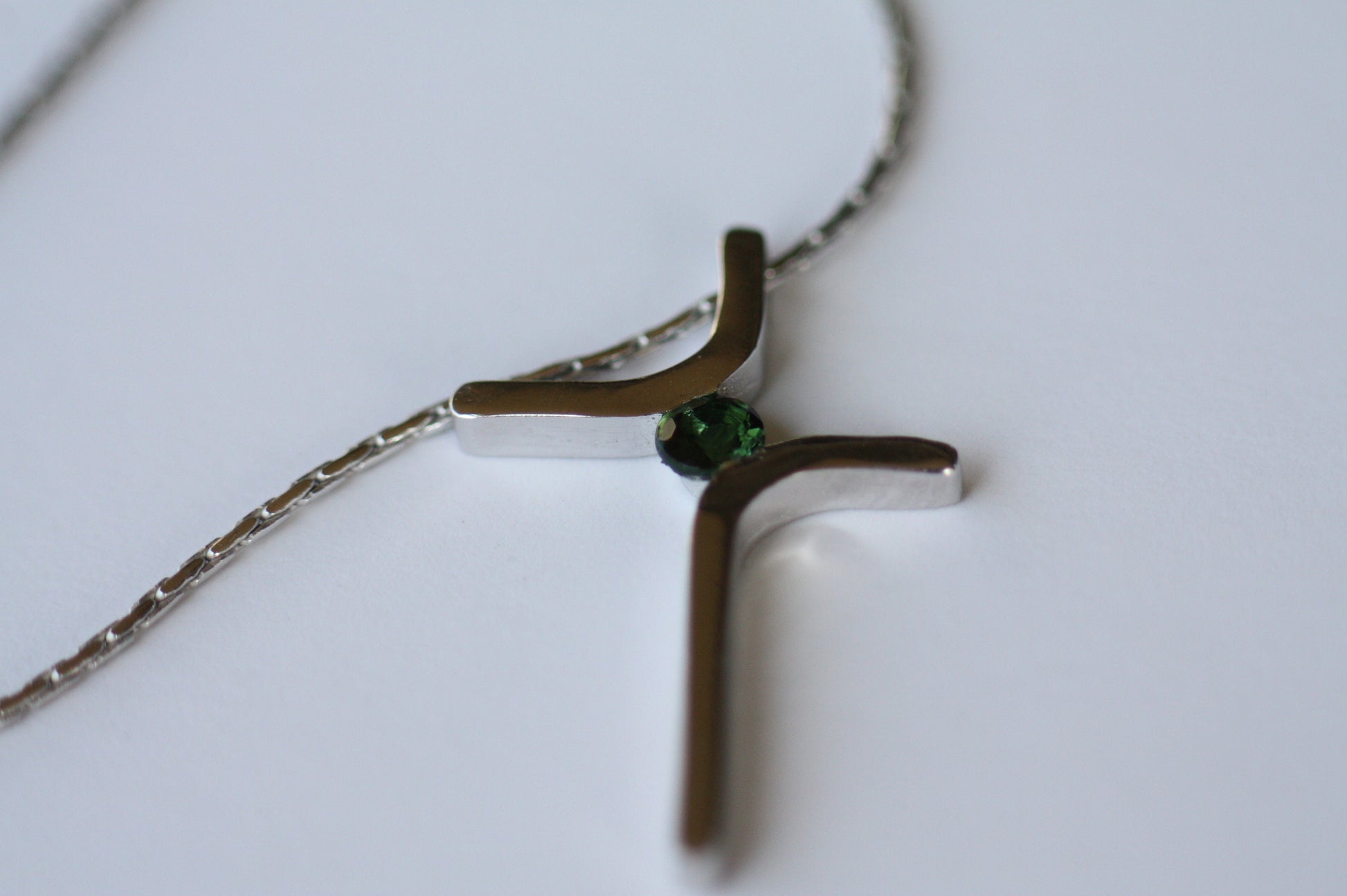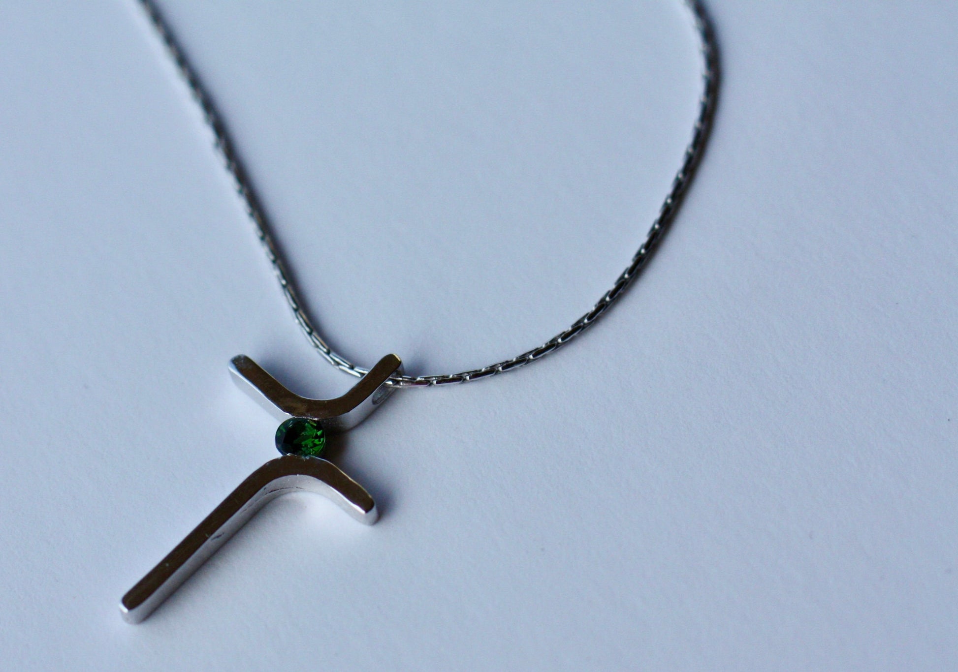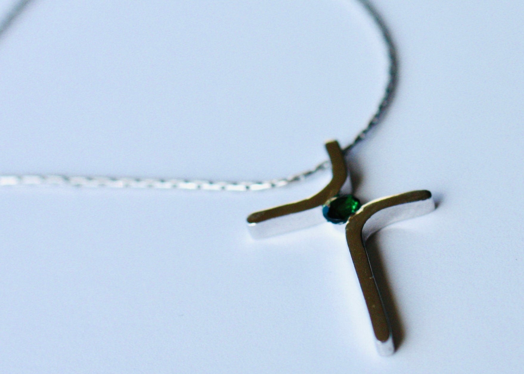 This elegant K18 white gold cross contains a round green tourmaline. Baby jewellery christening.