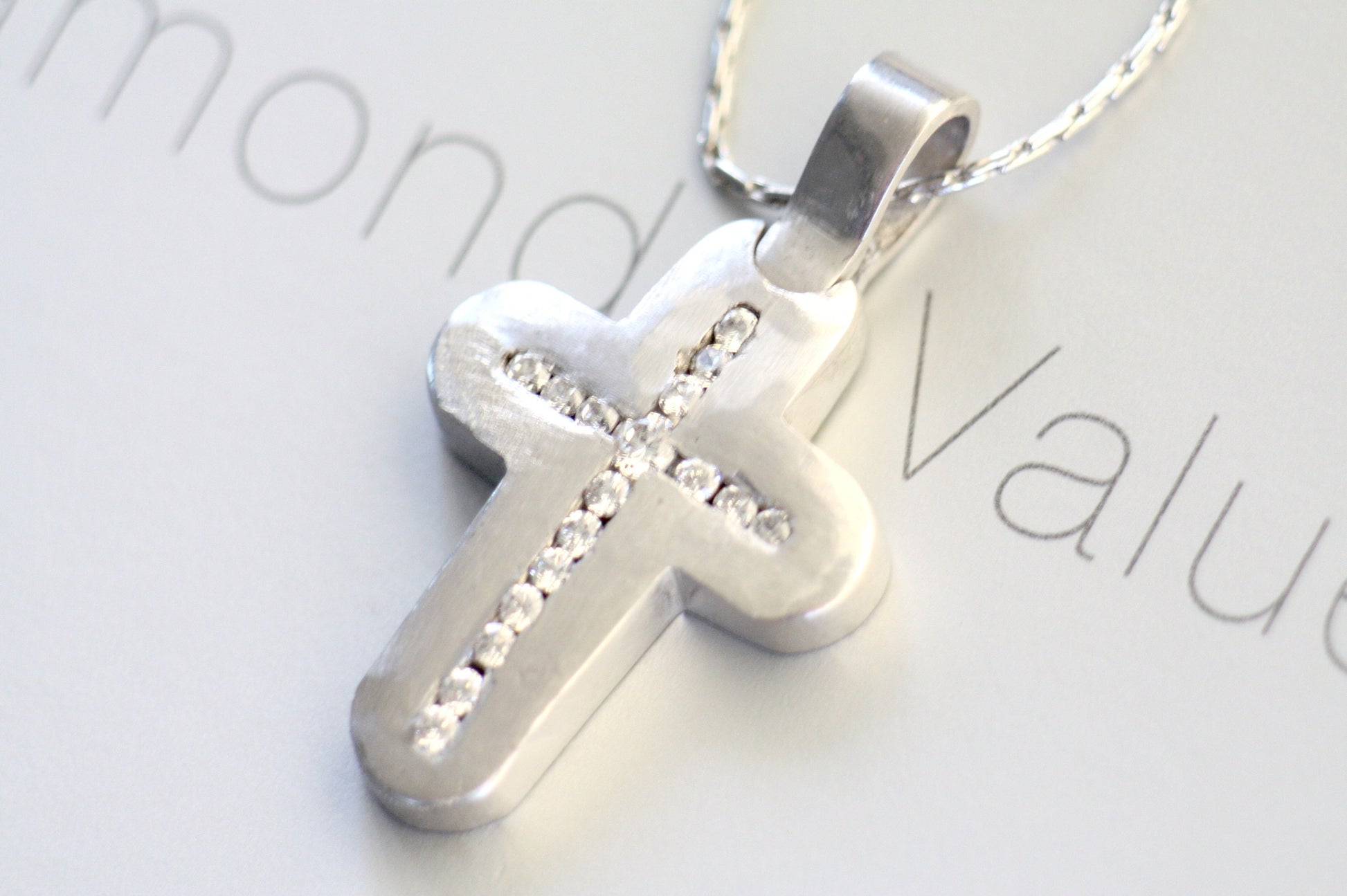 White Gold k18 Cross for women, plain and simple lines, byzantine style, 18 round diamonds (0,01ct each) total weight 0,18ct, F colour, Vs Clarity, Excellent Cut