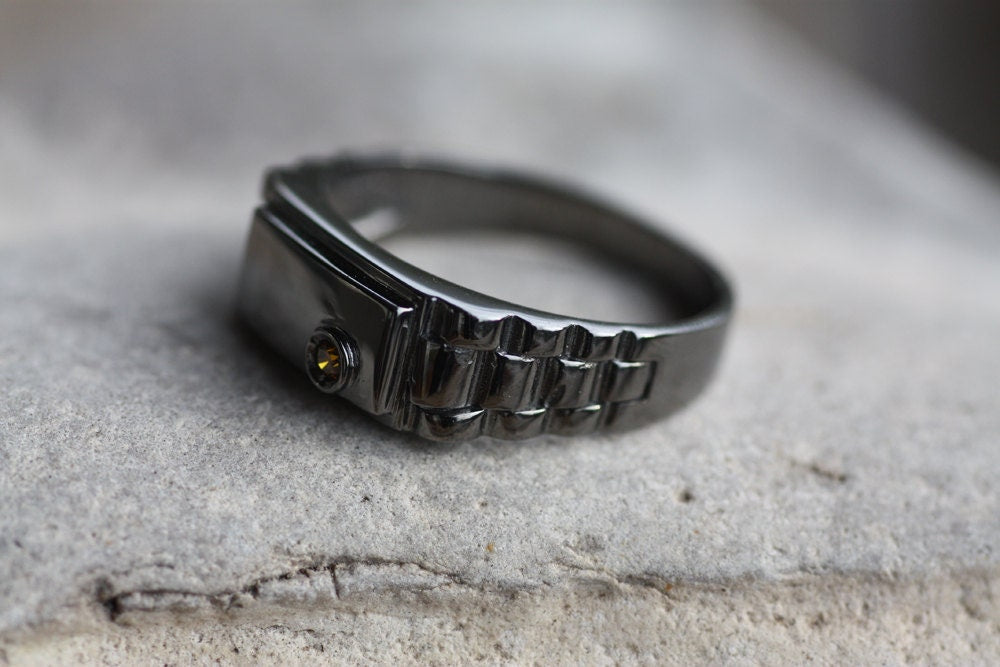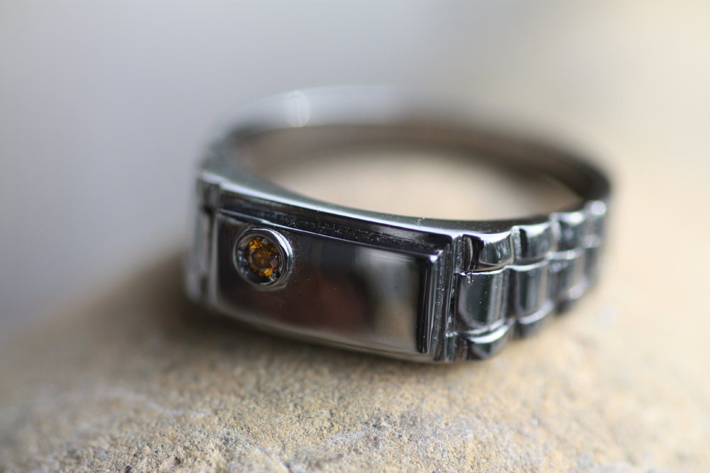 Sterling Silver or White Gold ring, Black Rhodium plated with a Cognac Diamond 0,03ct or a Yellow Sapphire. A unique, unusual design for men with Cognac diamond mounted on this beautiful shade of grey metal gives you a beautiful contrast, a design very hard to find, very easy to wear.