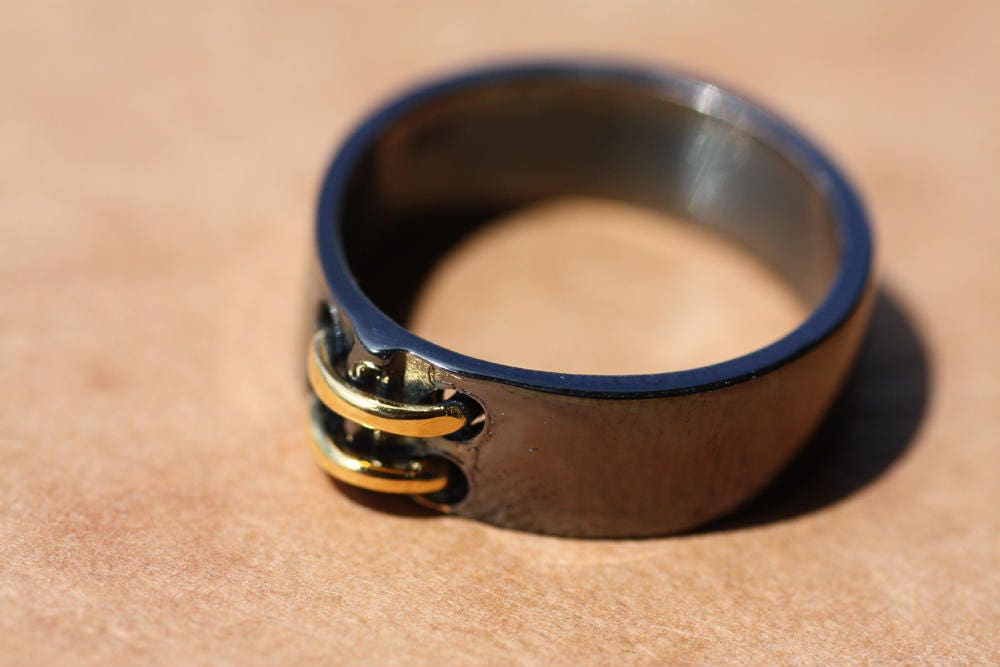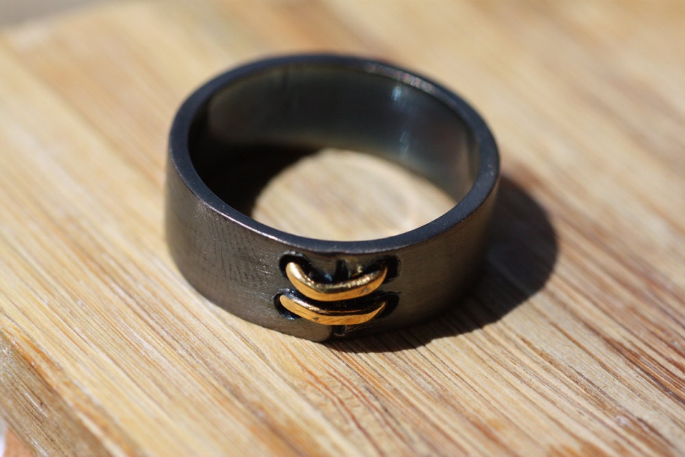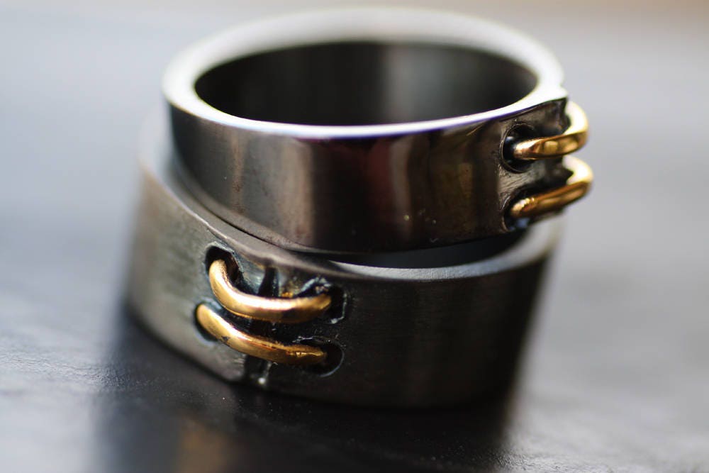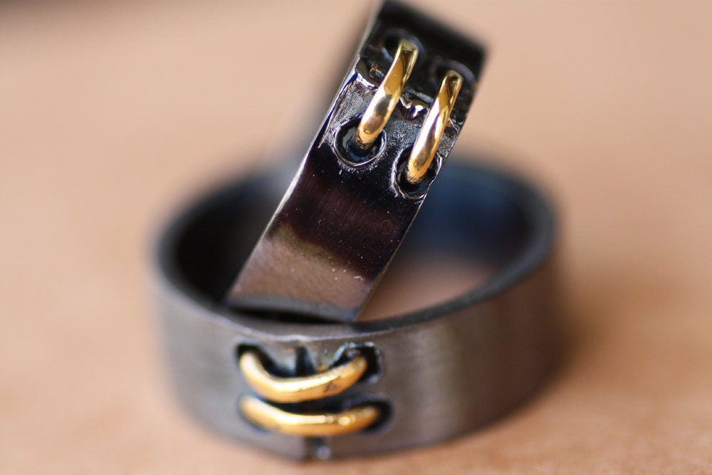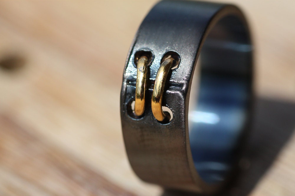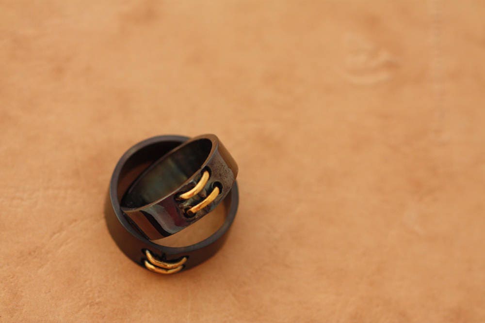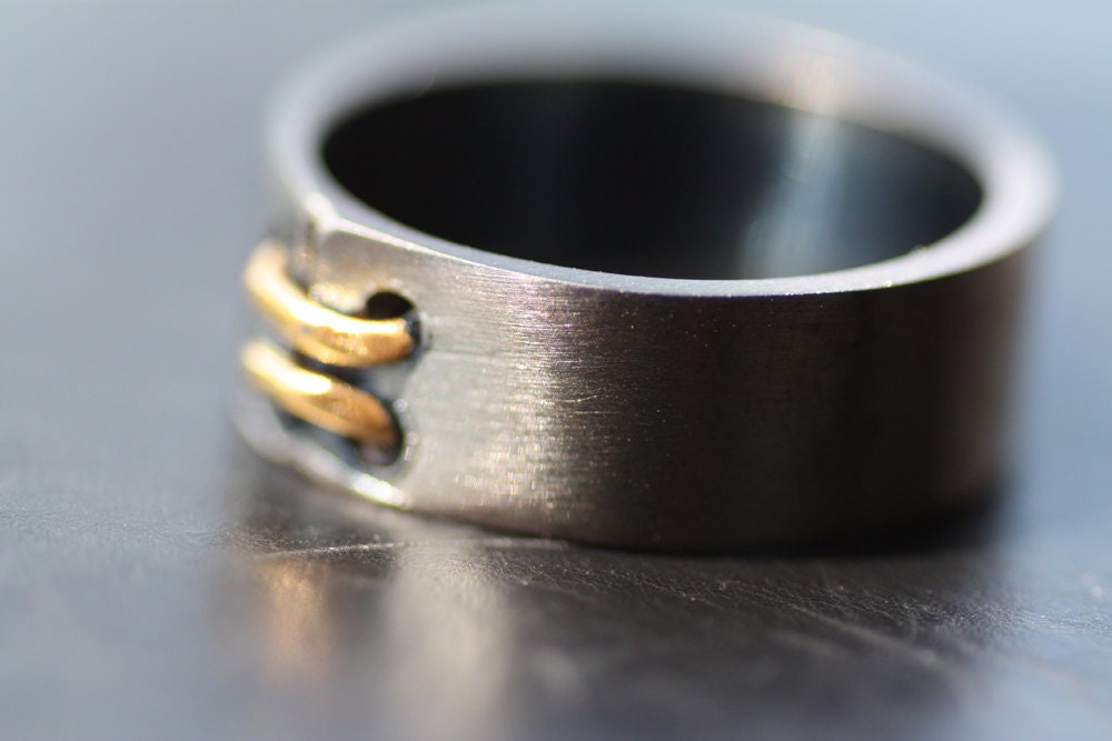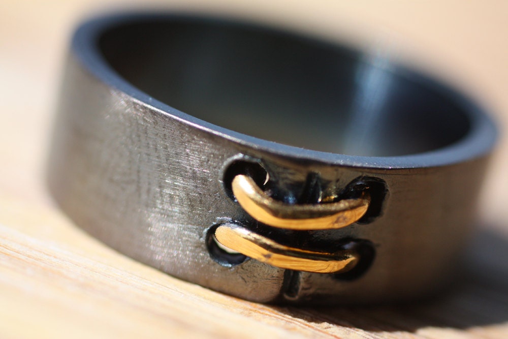 A beautiful hand crafted wedding band made of solid sterling silver that has been black rhodium plated with matte finish which gives it a dark matte appearance. Two gold plated stripes sweeps across the front of the ring, make it looks like laces. The stripe measures 1.10mm wide and sits up above the band. The gold plated stripes stands out against the black rhodium plated sterling silver.