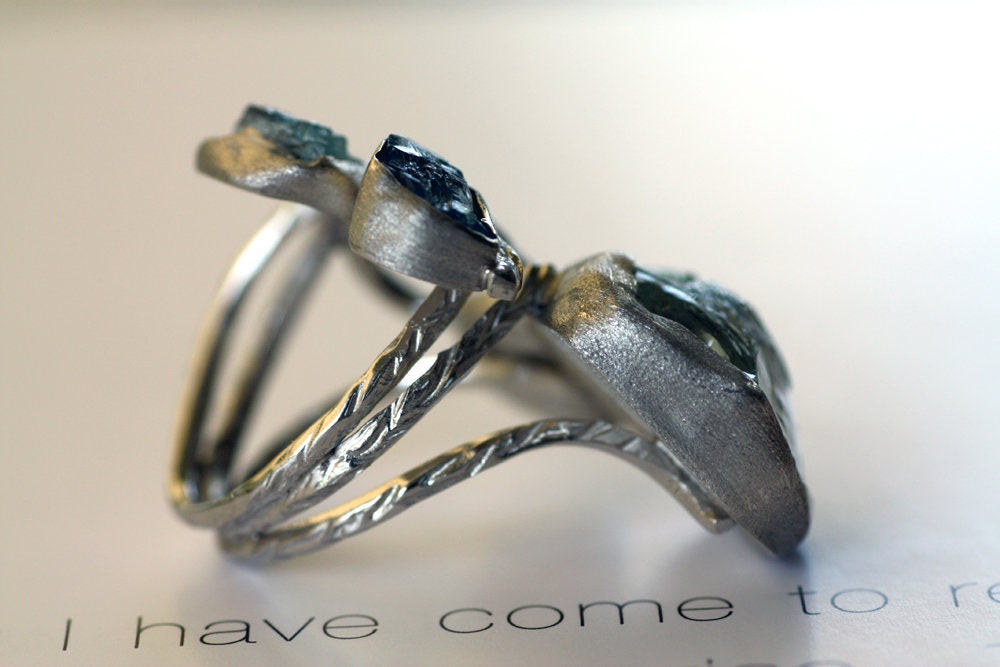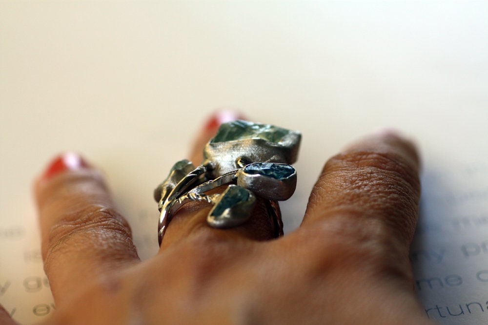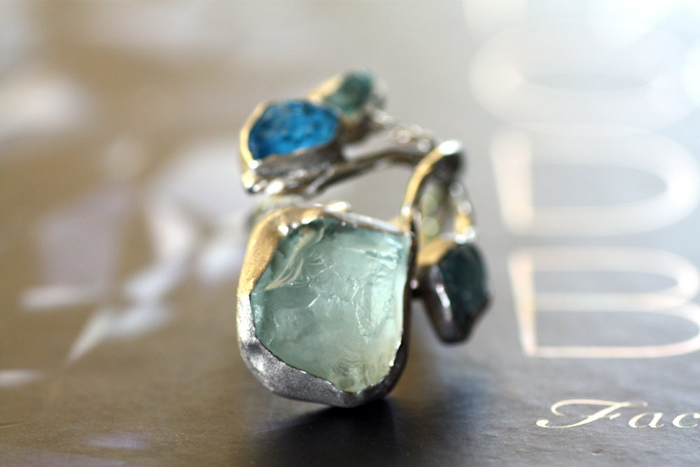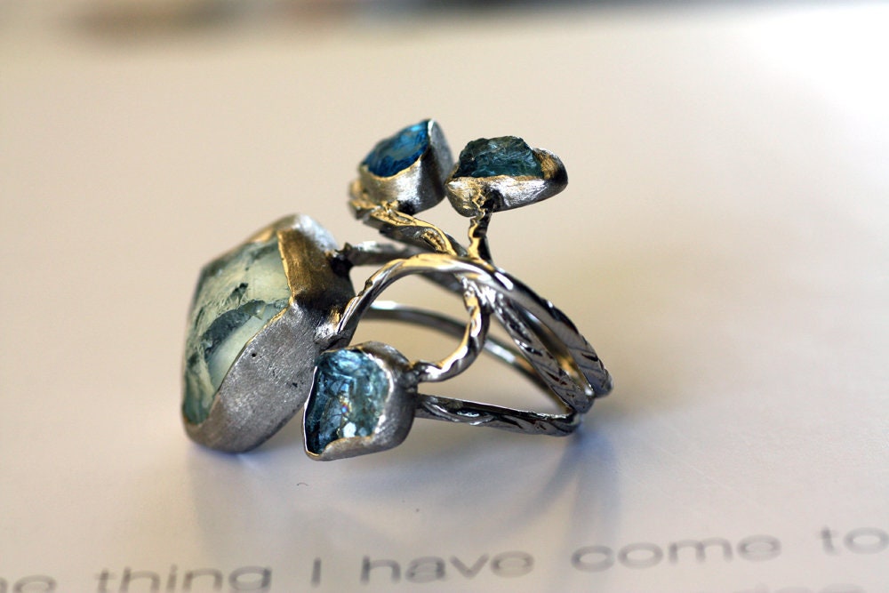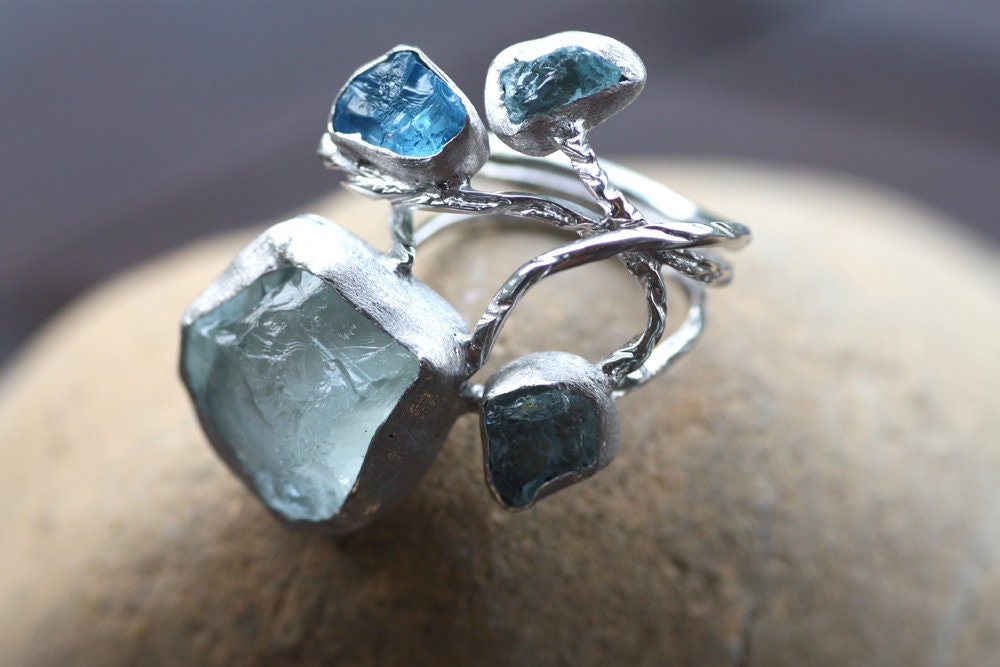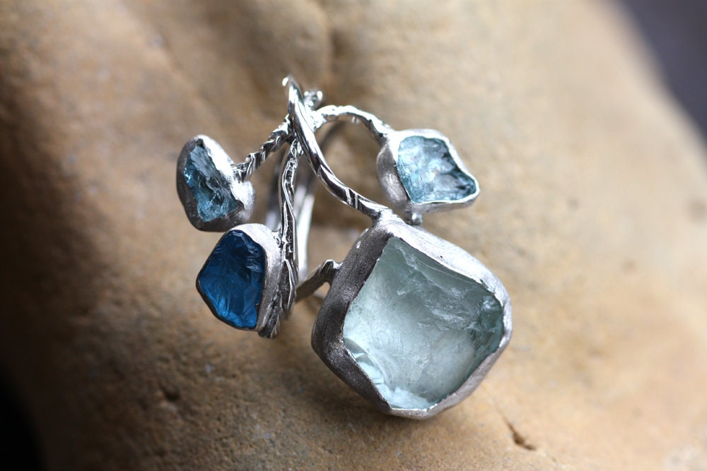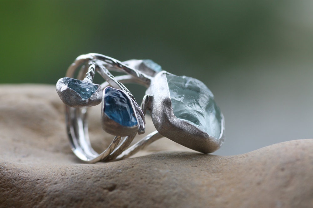 Aquamarine 19,45 ct rough and Blue Topaz 2,6 ct rough set on Sterling Silver making this ring really one of a kind.
