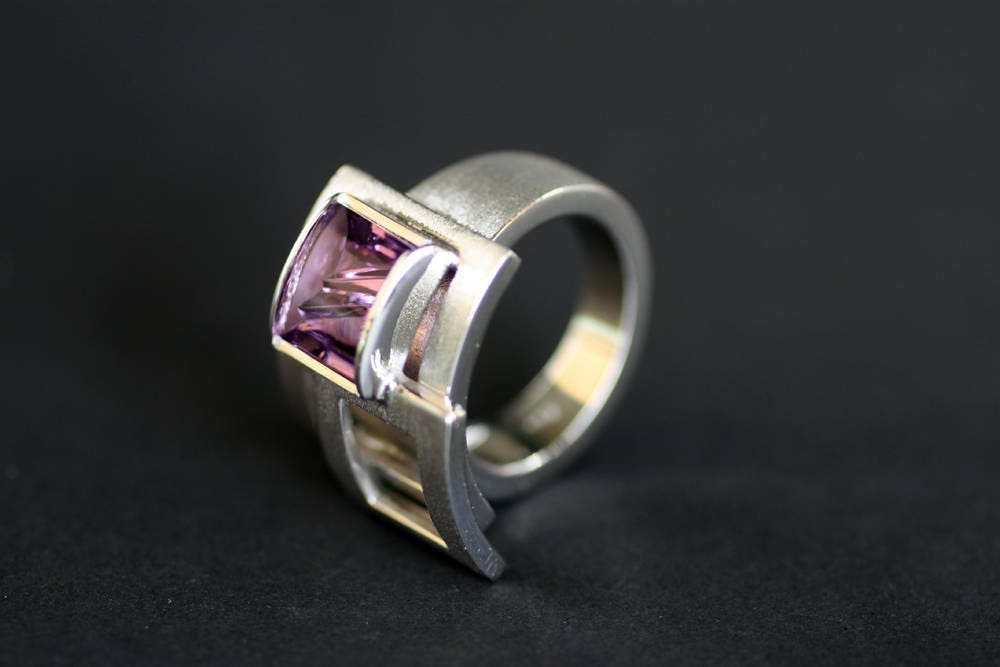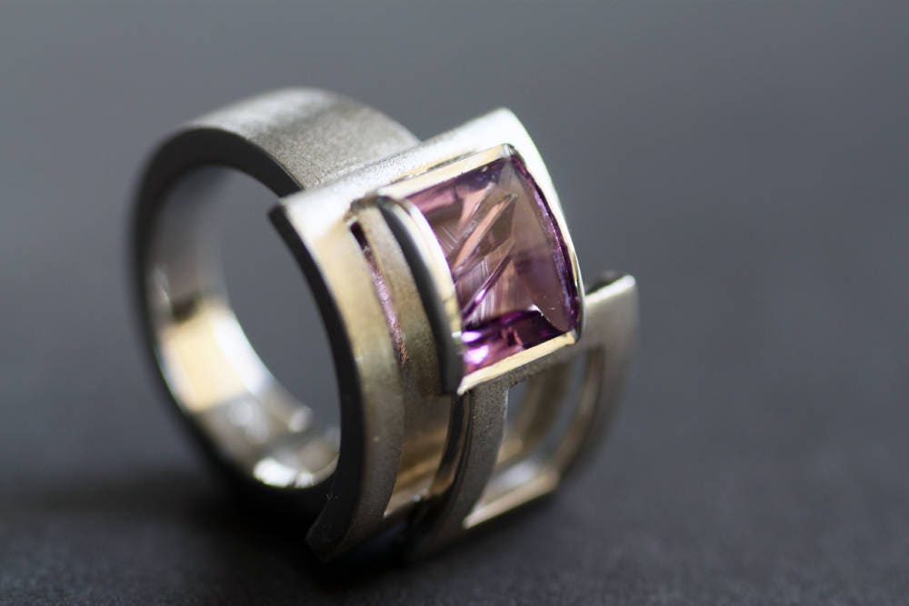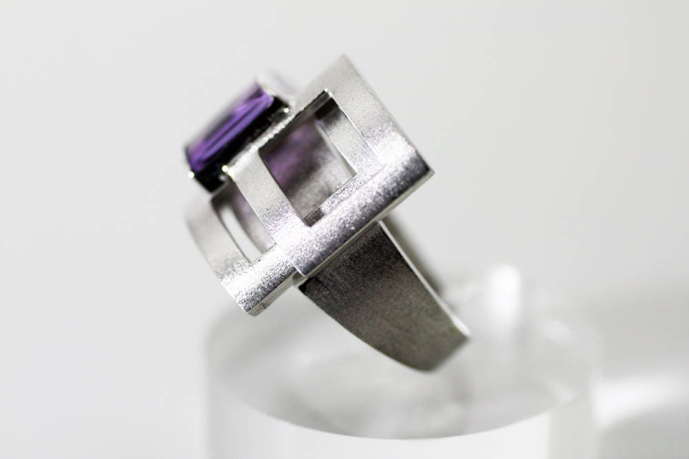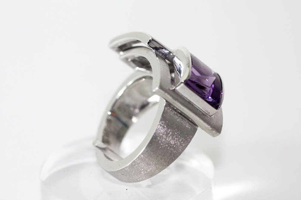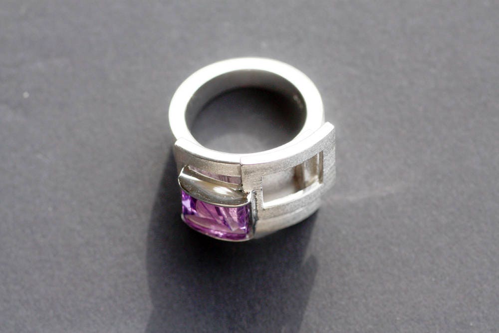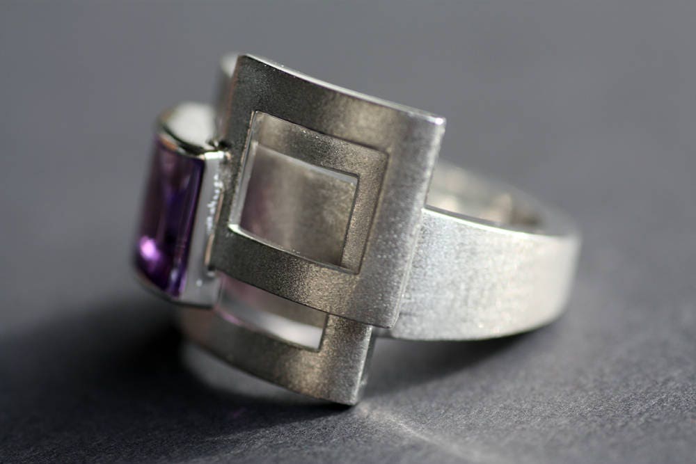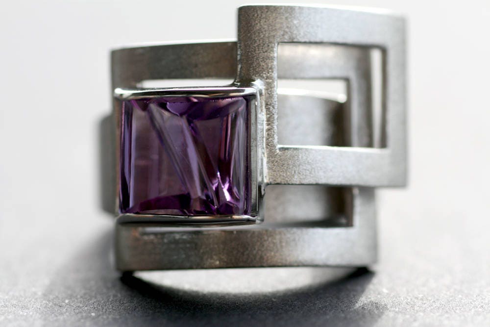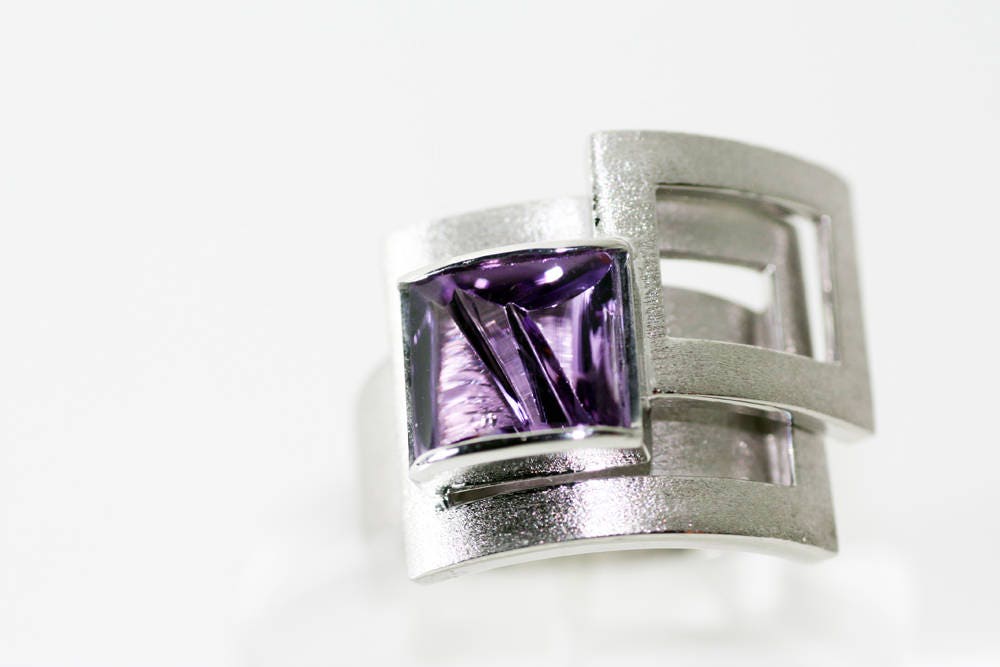 Remarkable gemstone, an Amethyst 10x7mm and weight 3,85ct set on this bold, amazing geometric design, made of Sterling Silver with shiny and matte finish.