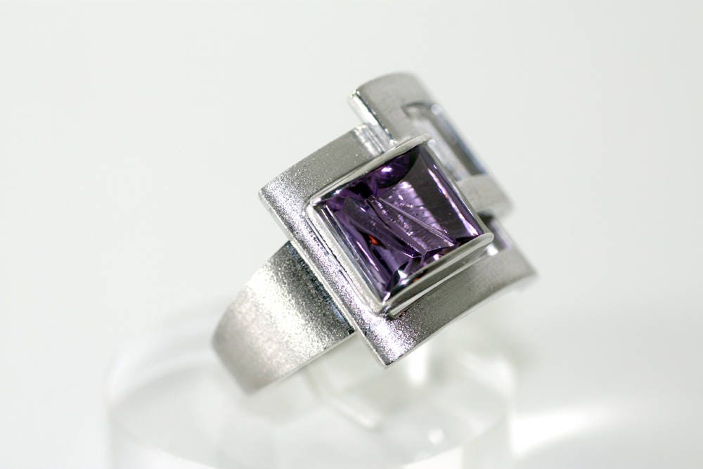 Woman's unique piece of jewellery, Amethyst "square" cut, ultra violet handcrafted beautifully, set on Sterling Silver white-gold plated.