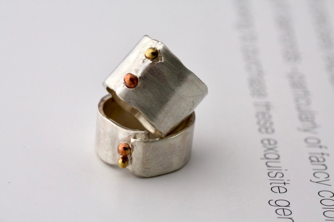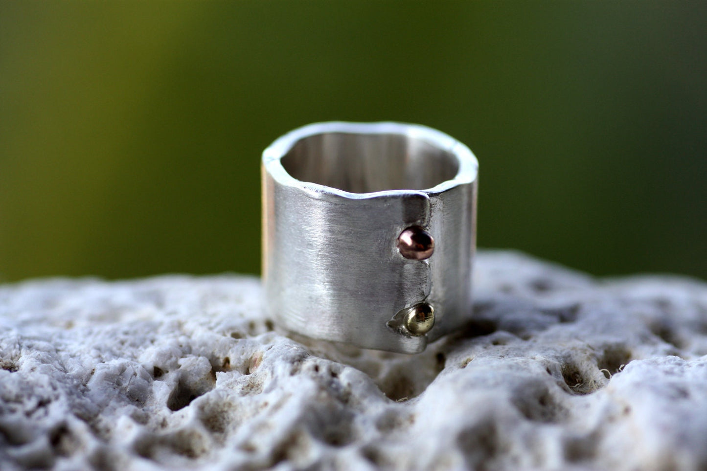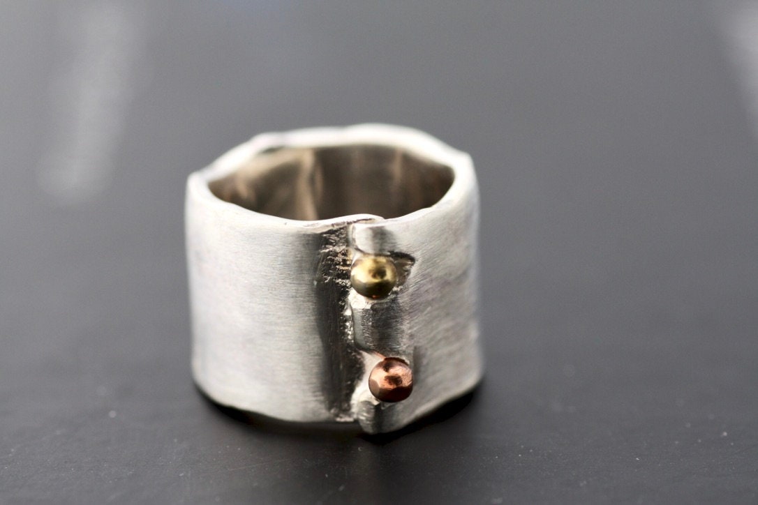 This style of handmade wedding ring is designed with a combination of sterling silver, copper, and brass, creating a unique touch. The 10mm wide and 2mm thick band can be personalized with an engraved message for a special occasion, such as a graduation or Father's Day. Materials used are only sterling silver and brass and copper details with a sterling silver stamp guarantee. An ideal gift to show your appreciation.