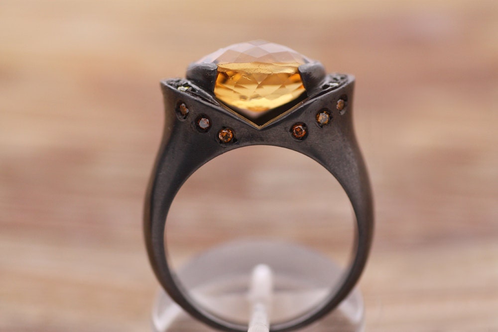A 4ct Citrine, 10-12mm beautifully faceted, yellow sapphires 0,03 ct & cognac or yellow diamonds 0,02 ct, all mounted on Sterling Silver black-rhodium plated.