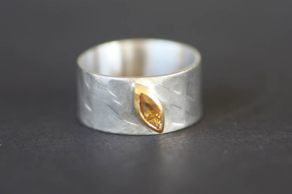 Citrine 6x3mm dimensions , Marquise cut and 0,26 ct weight set on Sterling Silver band 10 mm wide and 1 mm thick