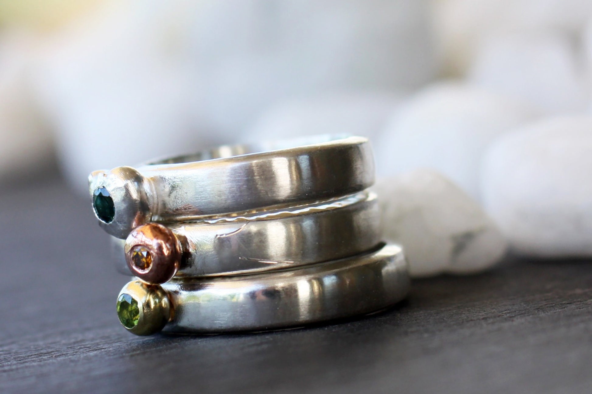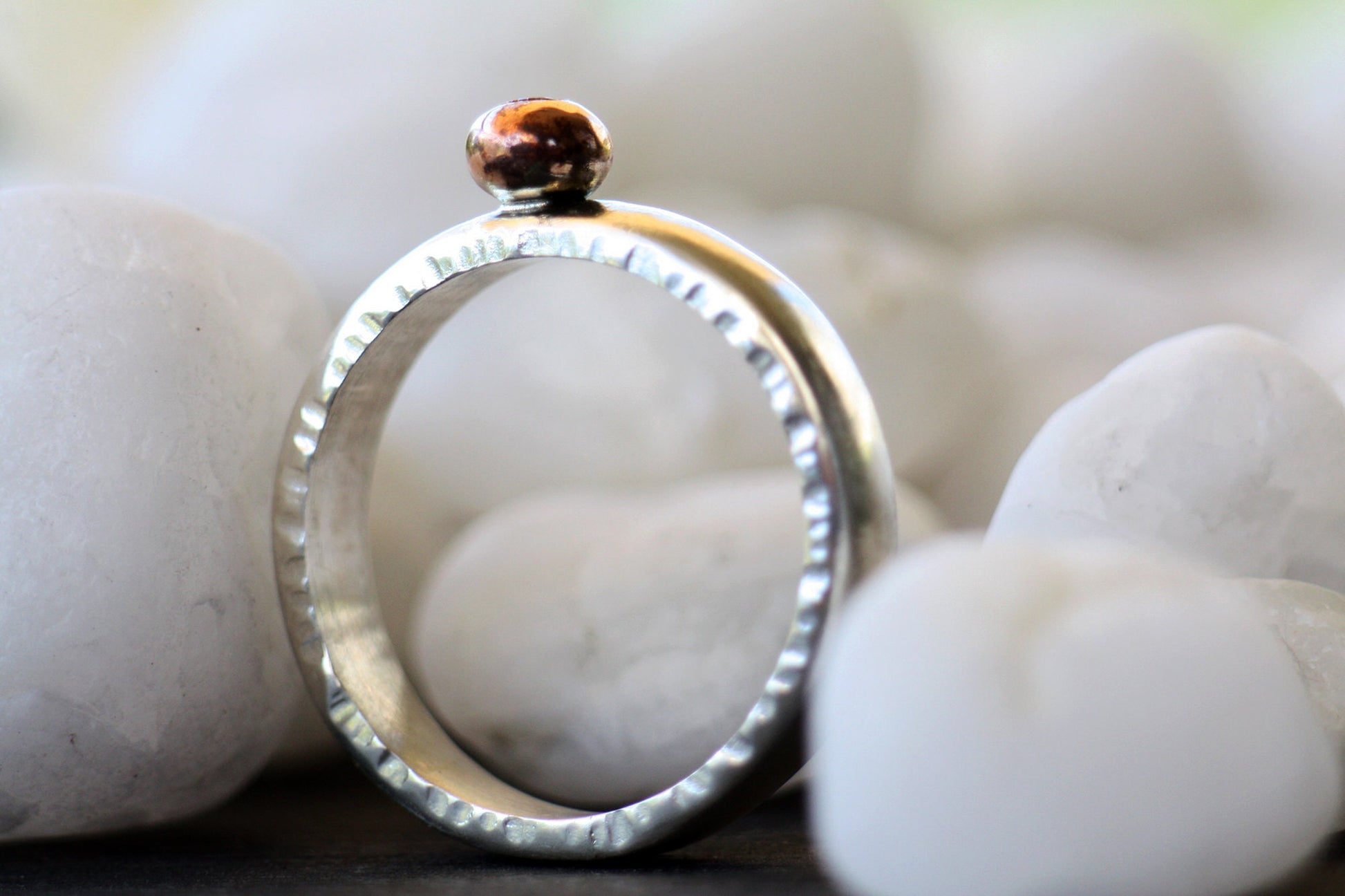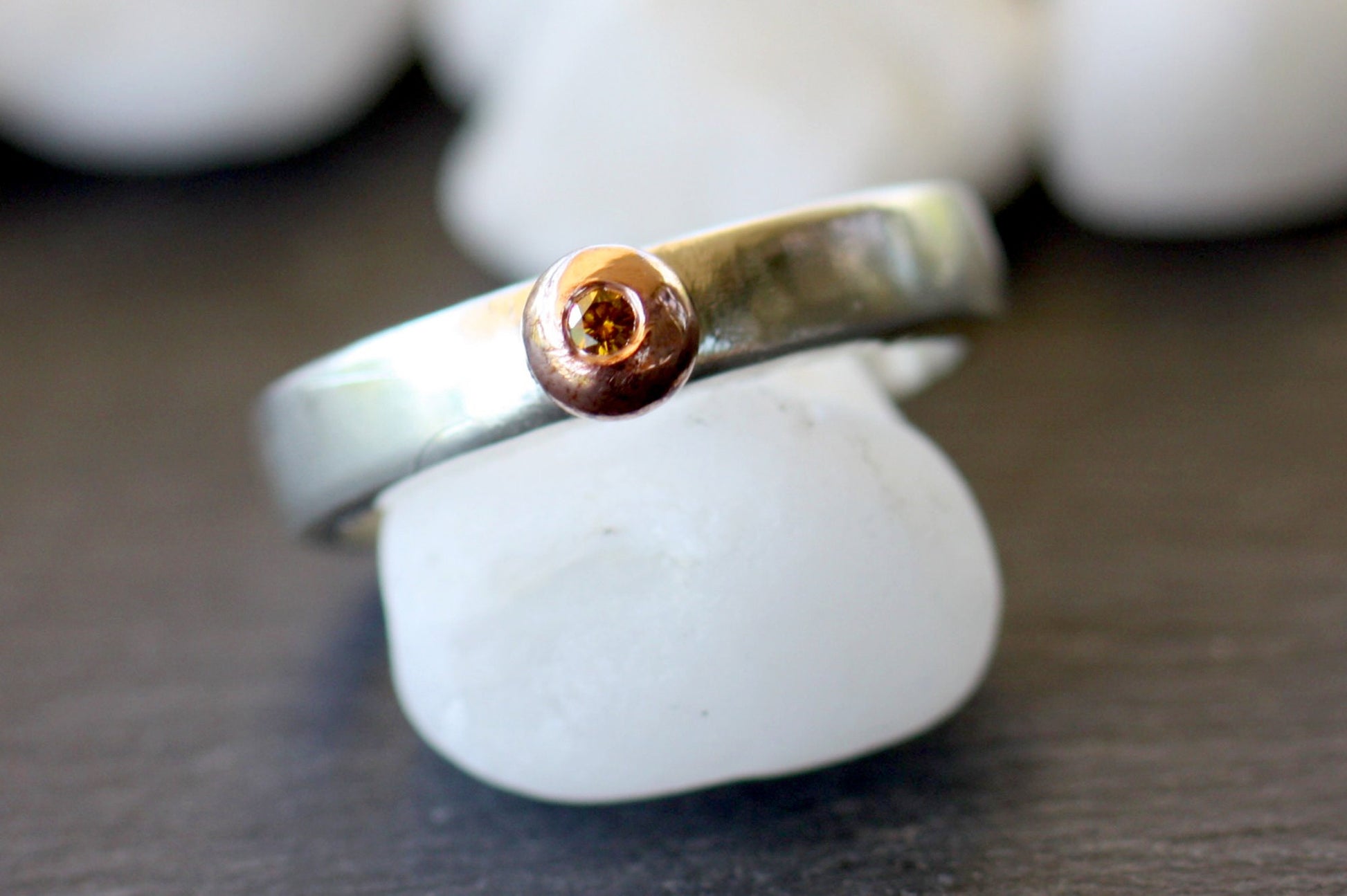 Dainty diamond ring with an amazing colour combination of the cognac diamond and copper bezel.
