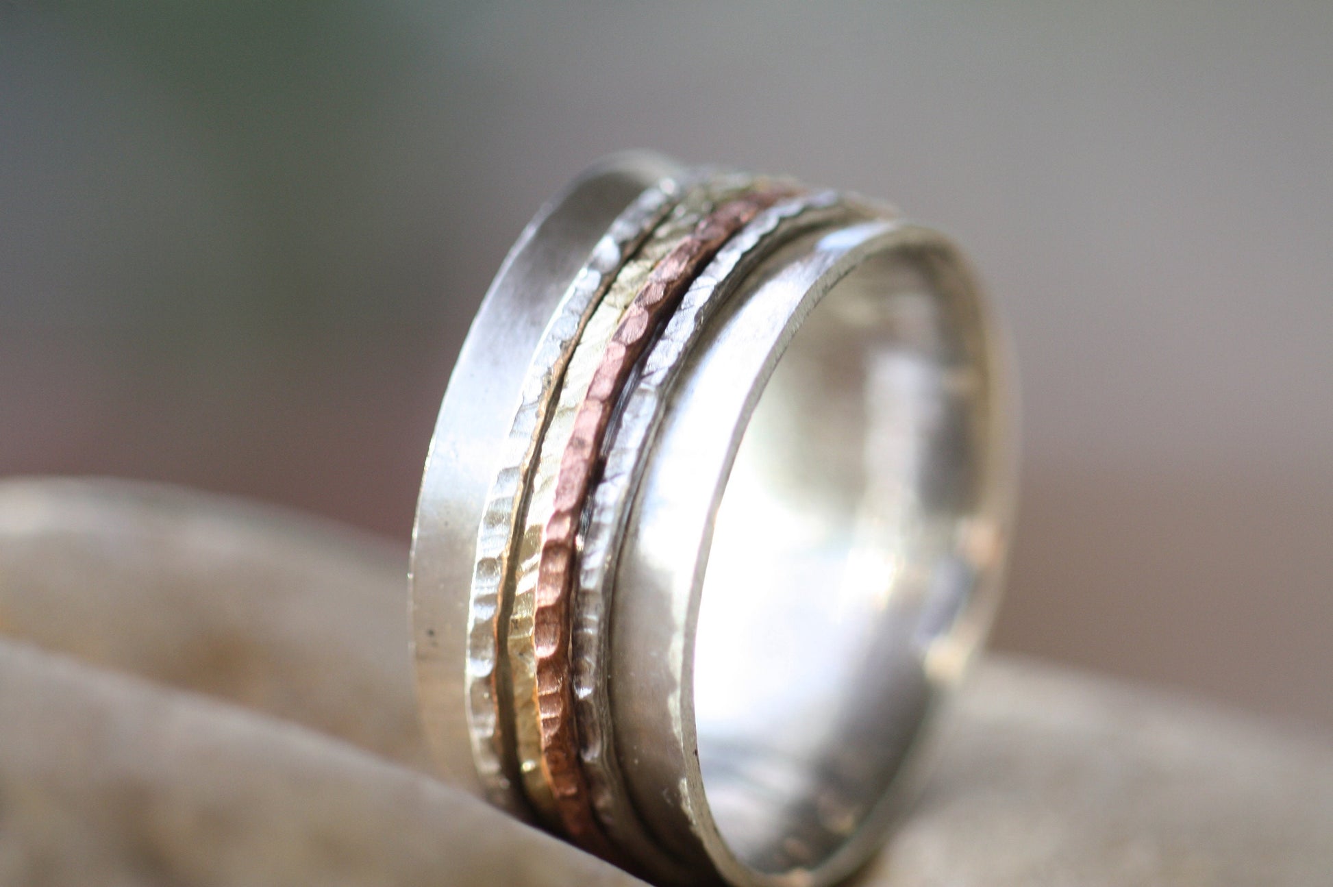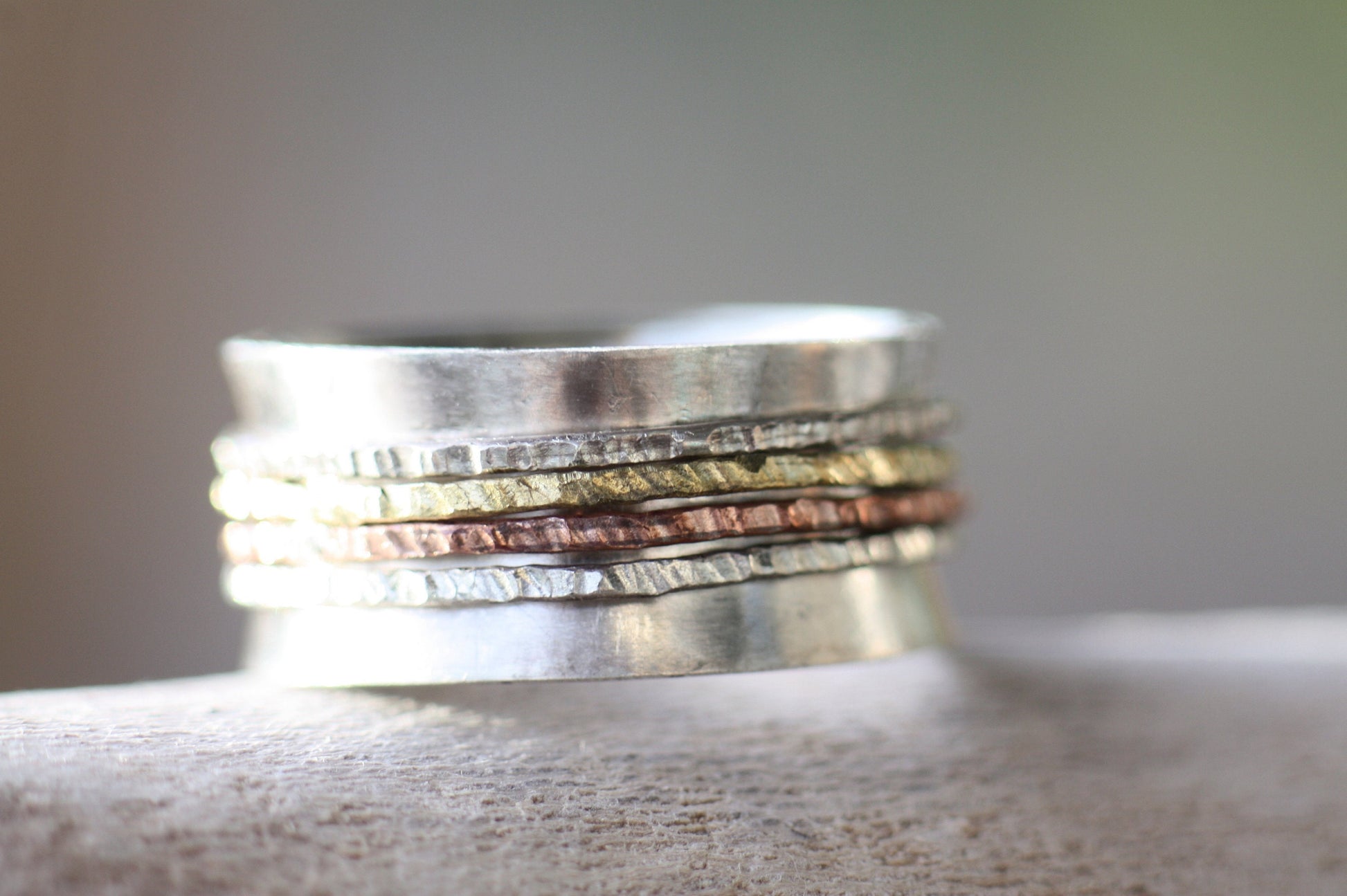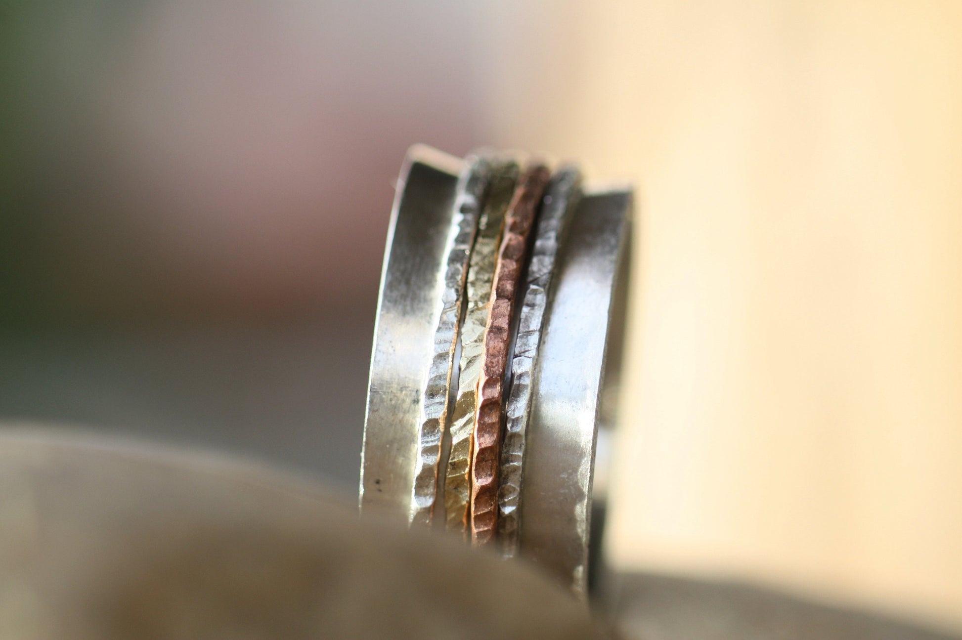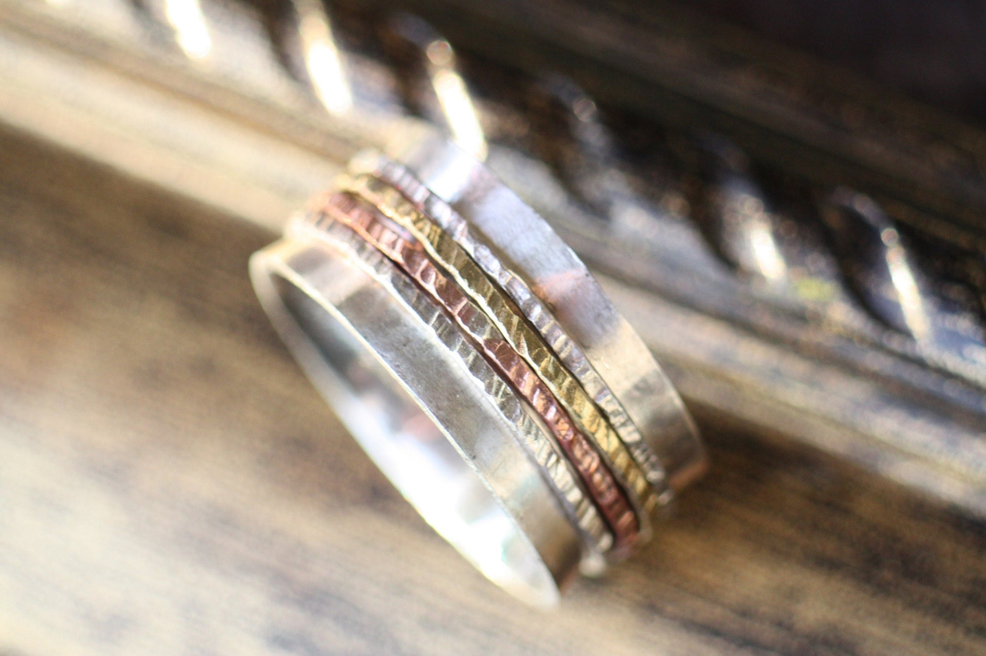 The main band is made of sterling silver with a sterling silver stamp guarantee, while the spinners are composed of copper and brass layers. Measuring approximately 10mm wide and 1mm thick, this ring is a statement piece that is sure to catch everyone's attention. But if you prefer a different width, just reach out to me and I will gladly accommodate your request.