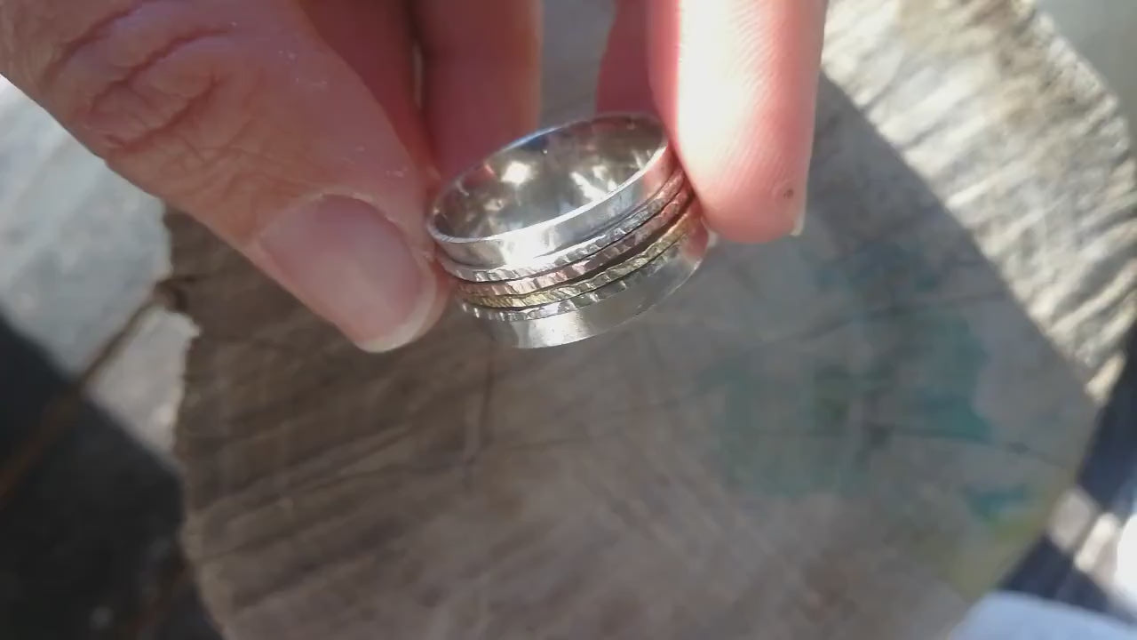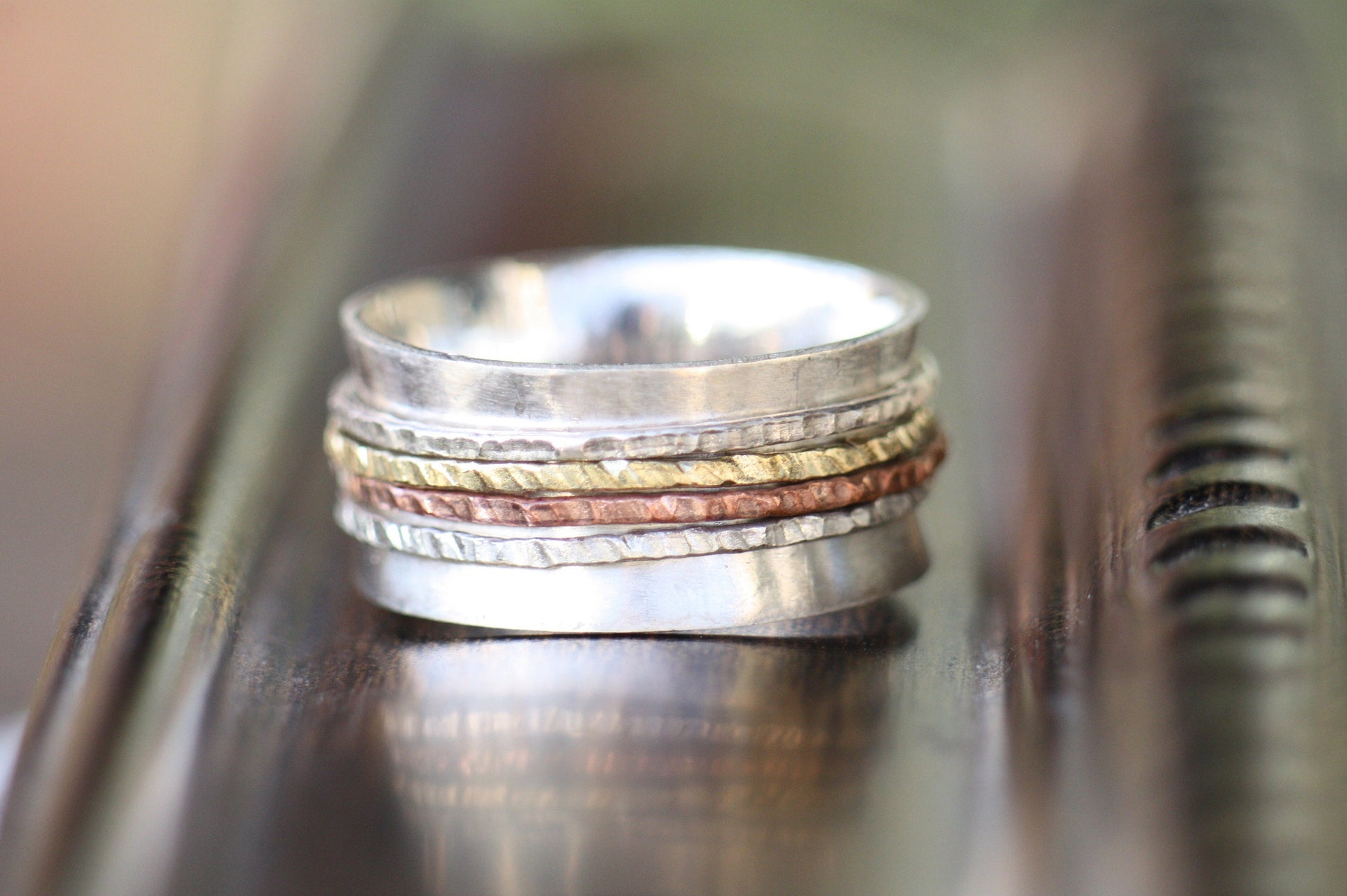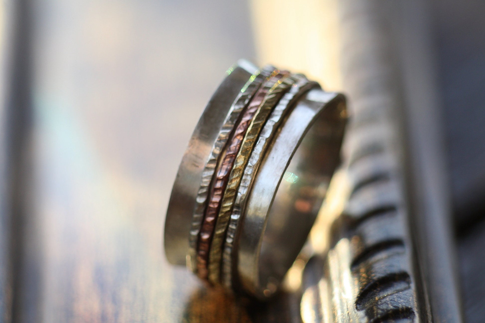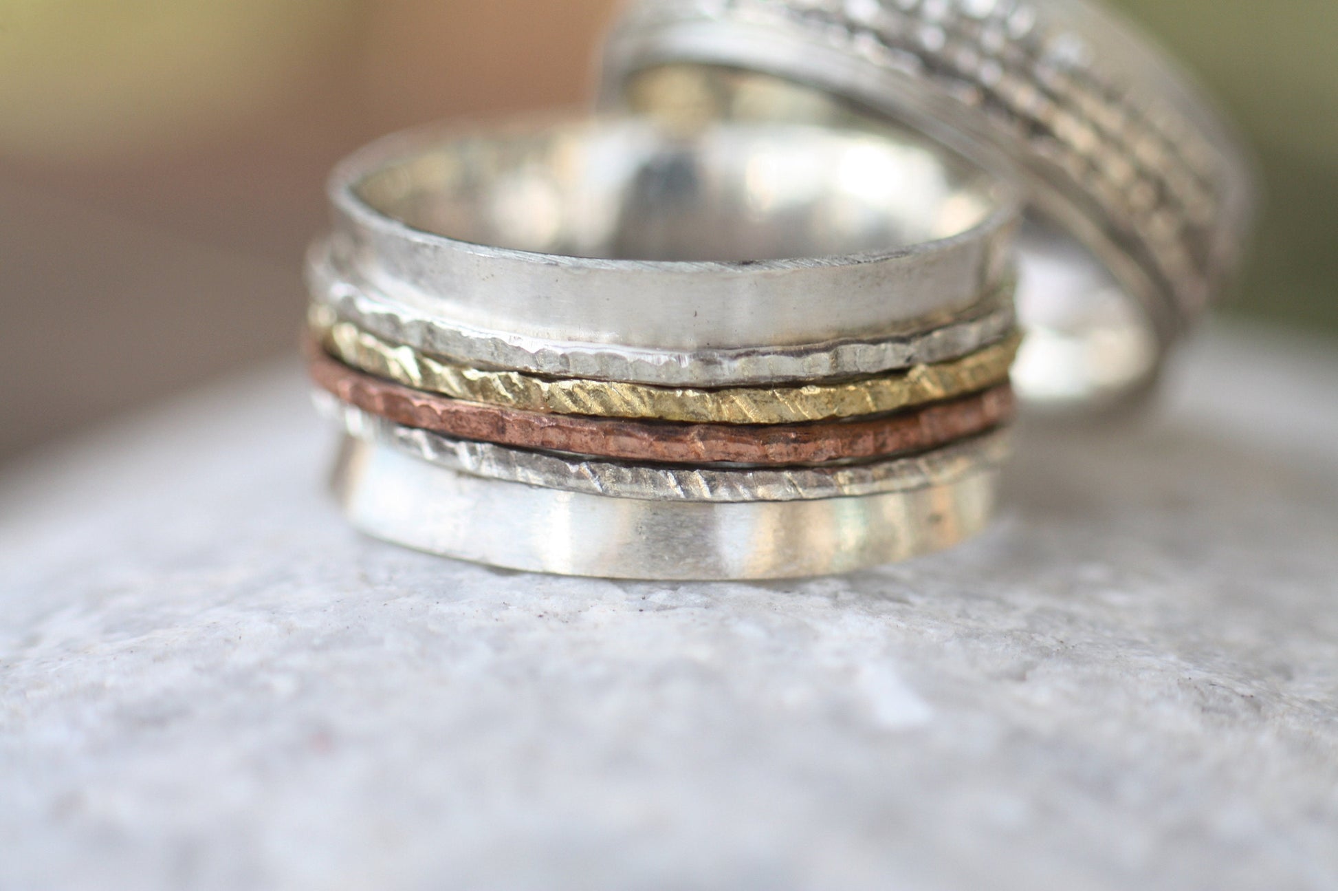 The main band is made of sterling silver with a sterling silver stamp guarantee, while the spinners are composed of copper and brass layers. Measuring approximately 10mm wide and 1mm thick, this ring is a statement piece that is sure to catch everyone's attention. But if you prefer a different width, just reach out to me and I will gladly accommodate your request.