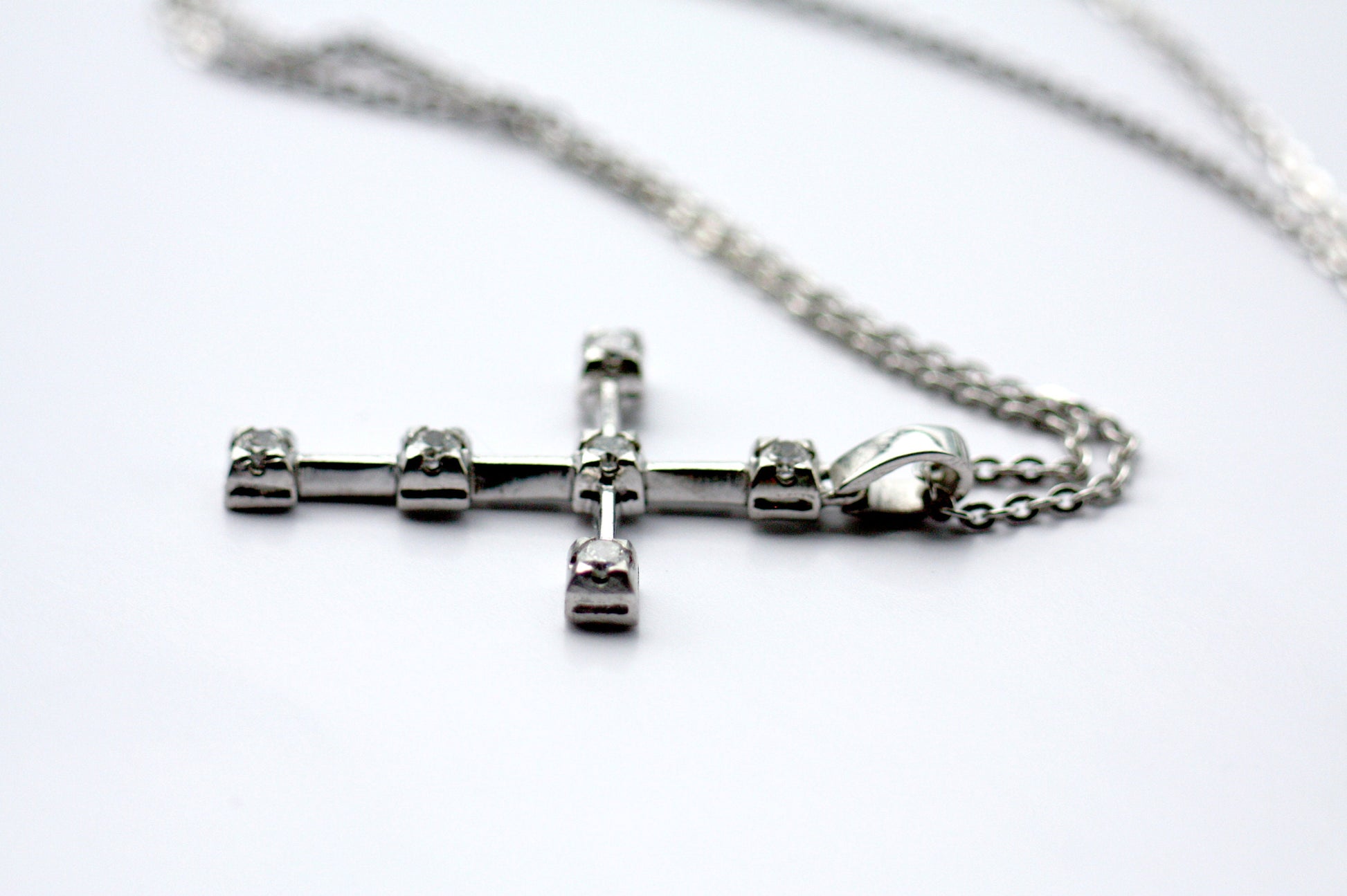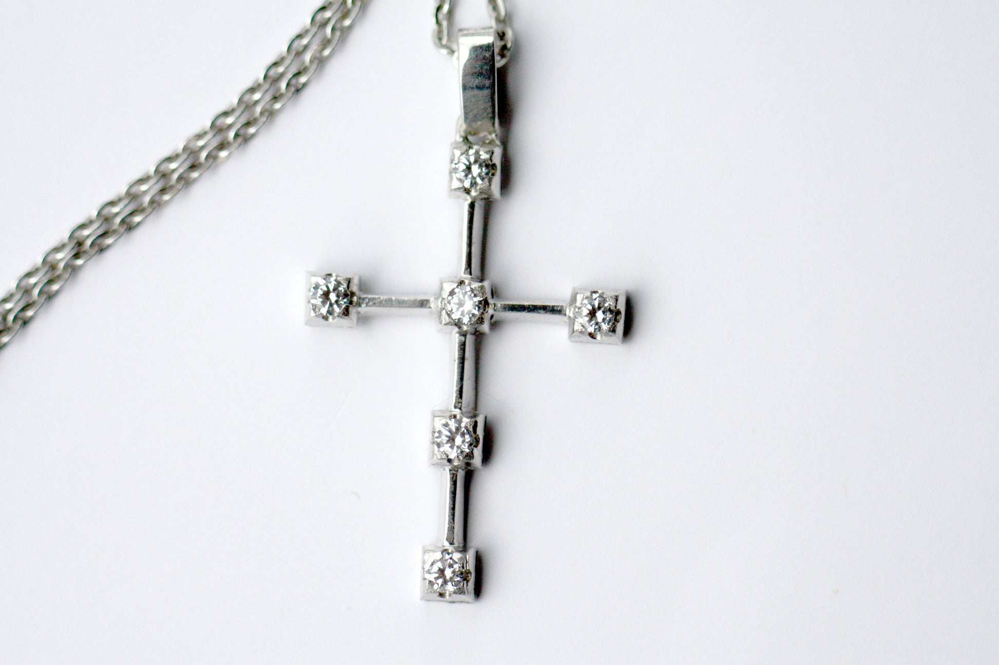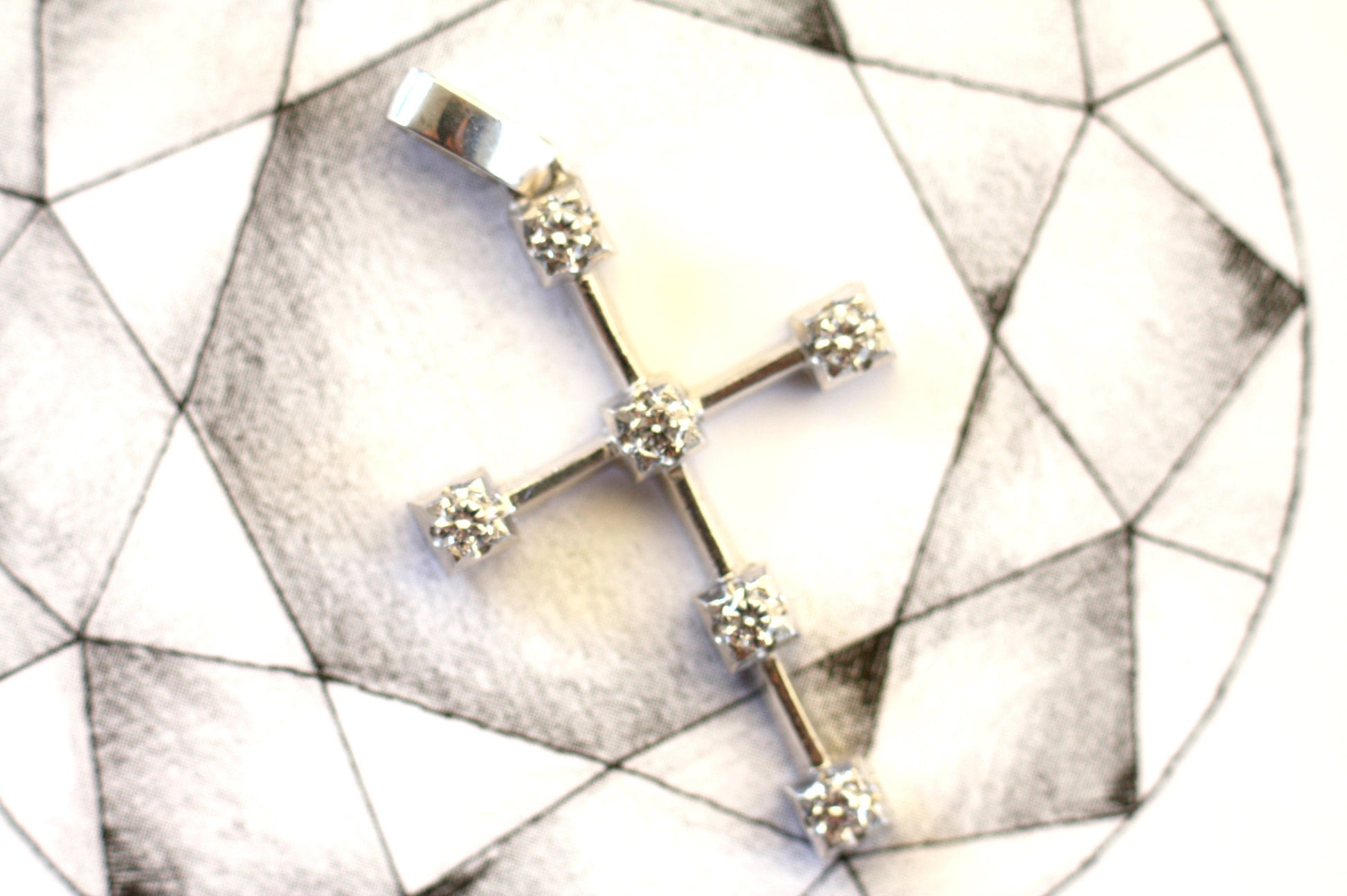 This elegant K18 white gold cross contains 6 round brilliant cut diamonds.The diamonds are VS1 clarity, F colour and 0,32ct total weight.