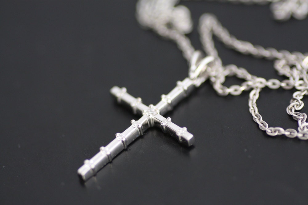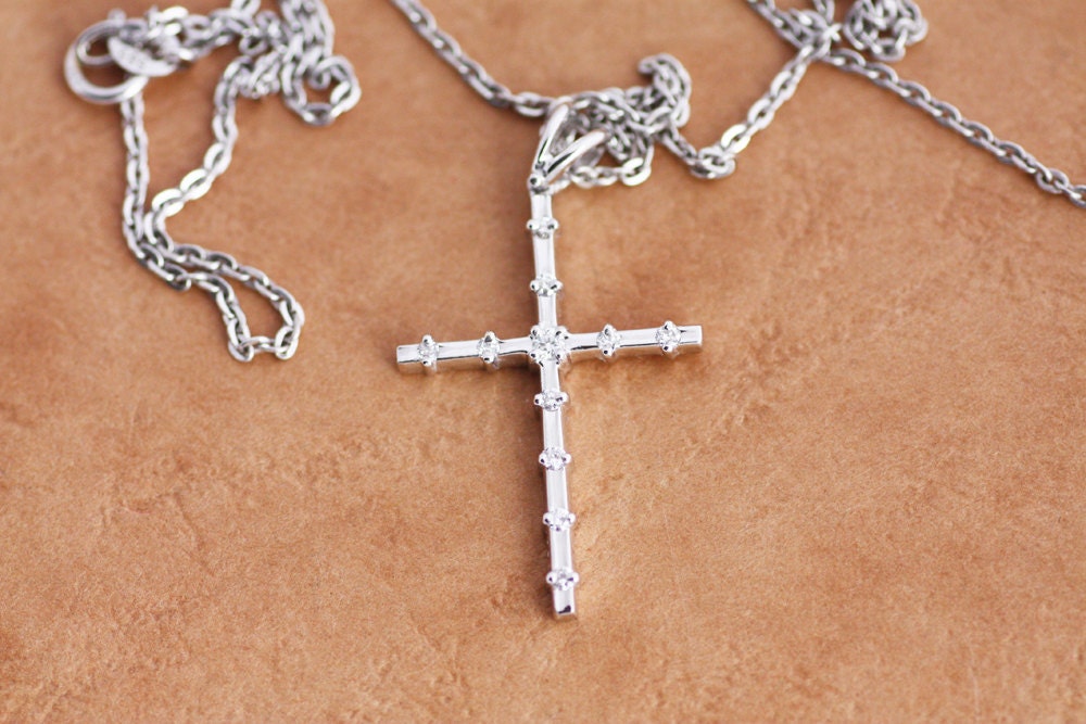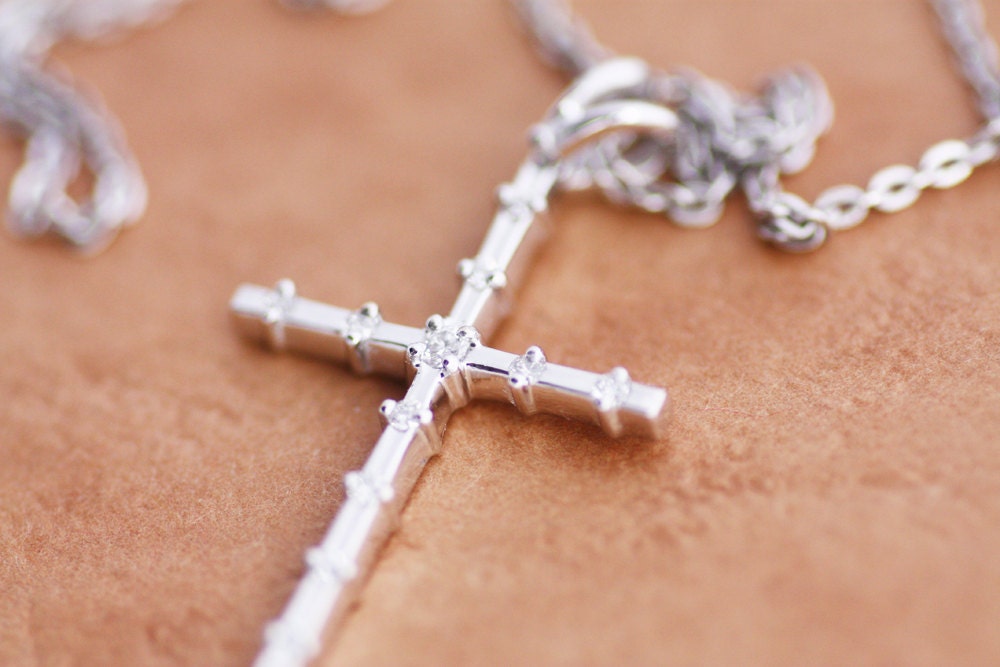 This elegant K18 white gold cross contains 11 round brilliant cut diamonds.The diamonds are VS1 clarity, F colour and 0,15ct weight.