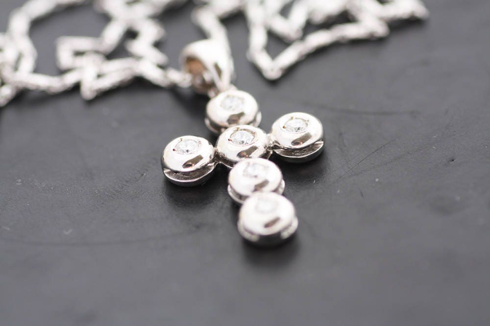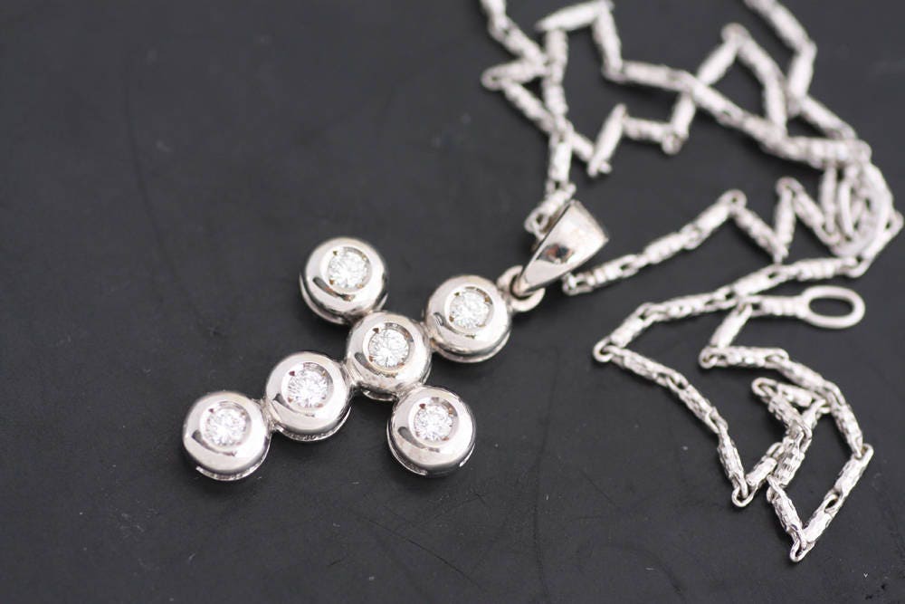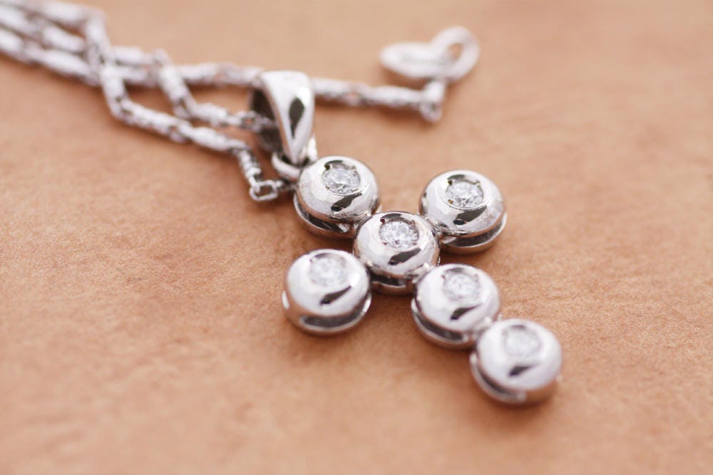 This elegant K18 white gold cross contains 6 round brilliant cut diamonds.The diamonds are VS1 clarity, F colour and 0,07ct weight.