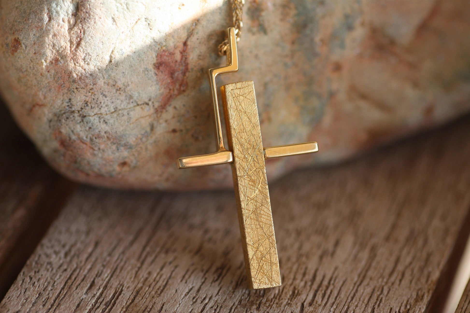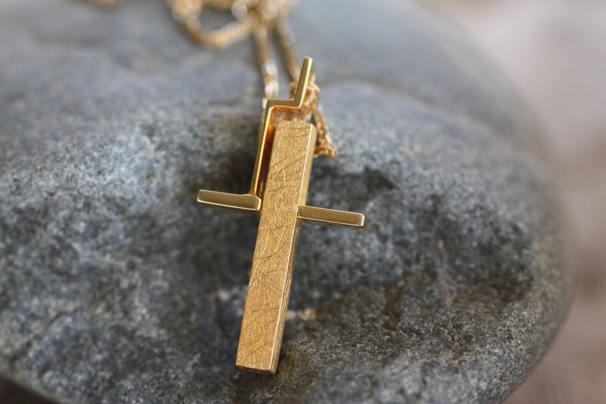 Man's Cross in Yellow Gold, main body textured in a hard brushed finish and shinny the outside.