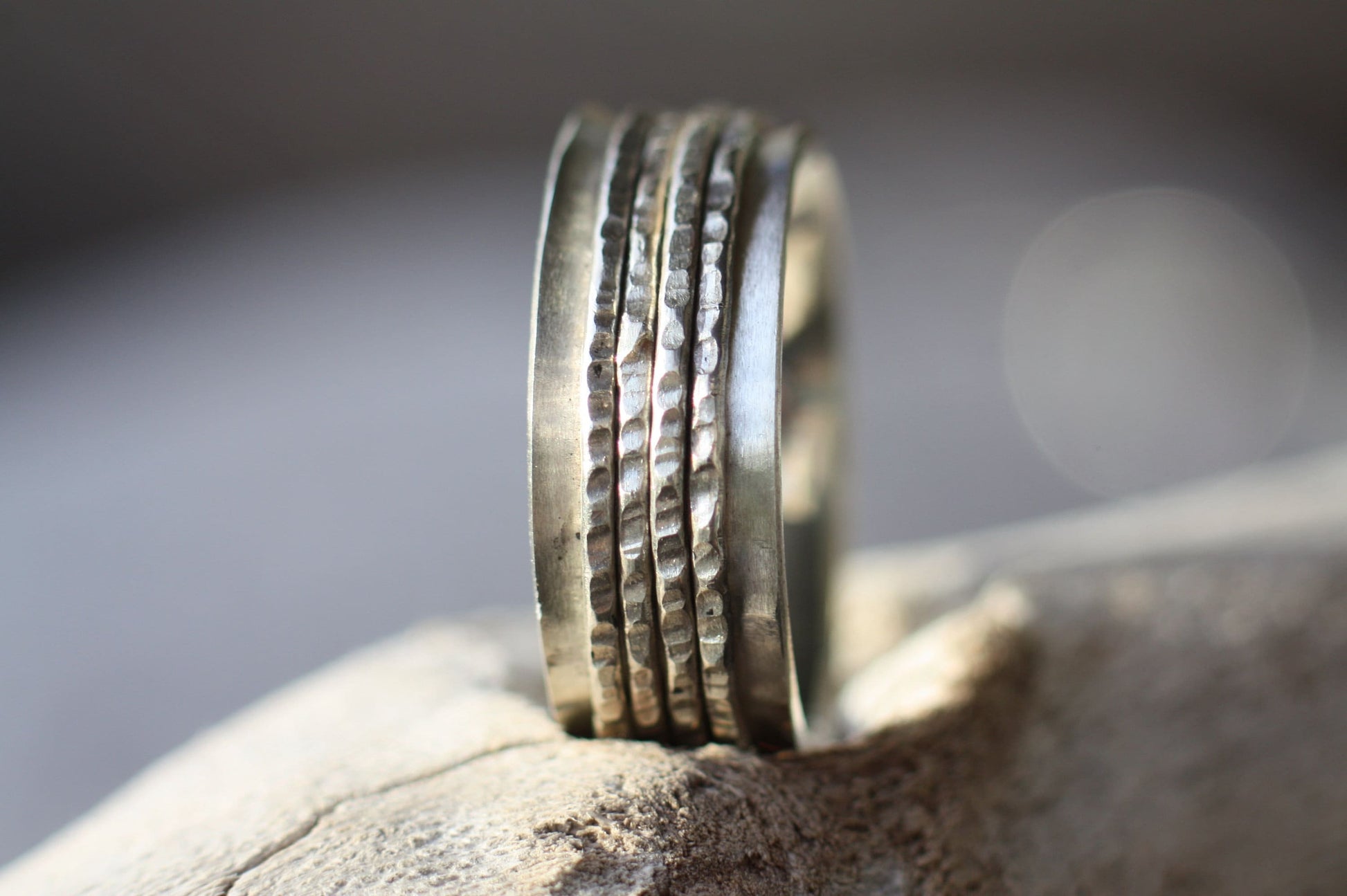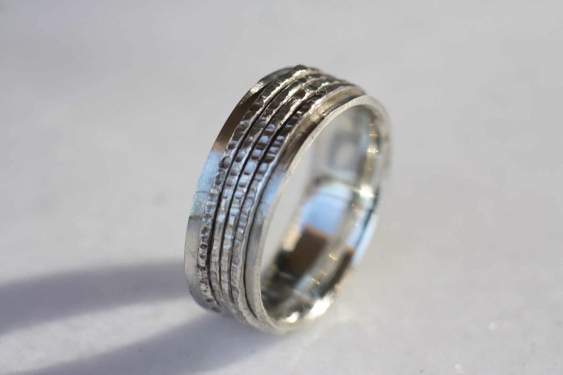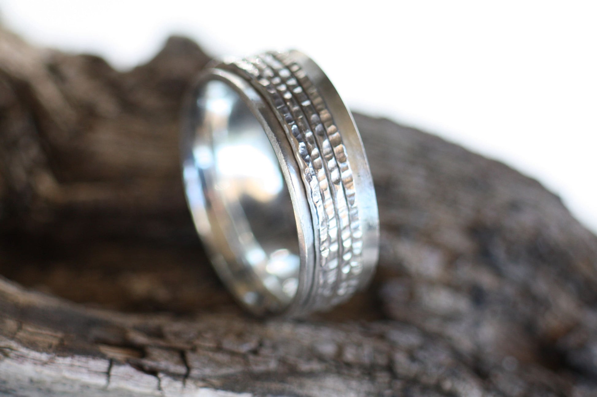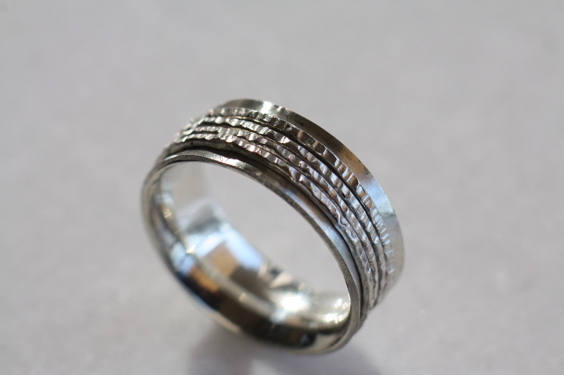 Engraved Handwriting Ring with 4 Spinners - Silver Relief Band for Men or Women