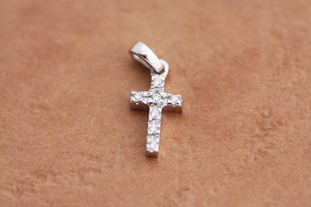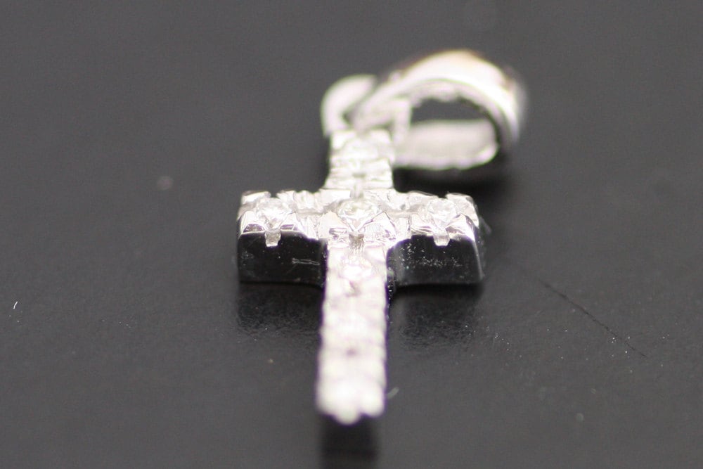 This elegant, small K18 white gold cross contains 7 round brilliant cut diamonds.The diamonds are VS1 clarity, F colour and 0,04ct weight.