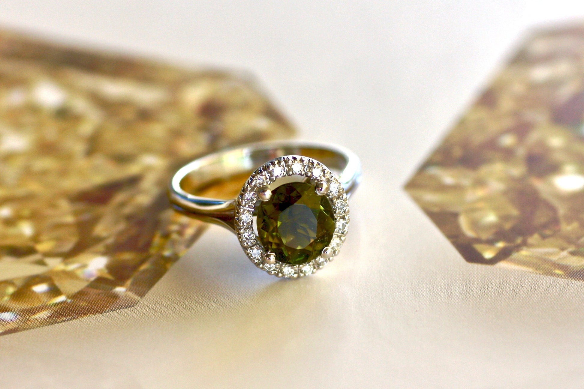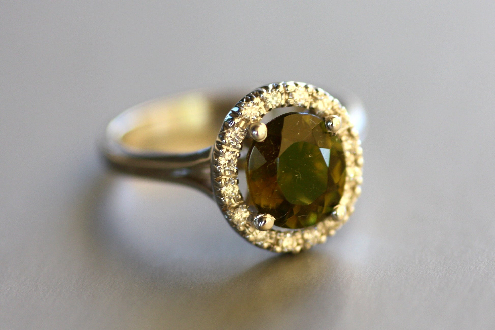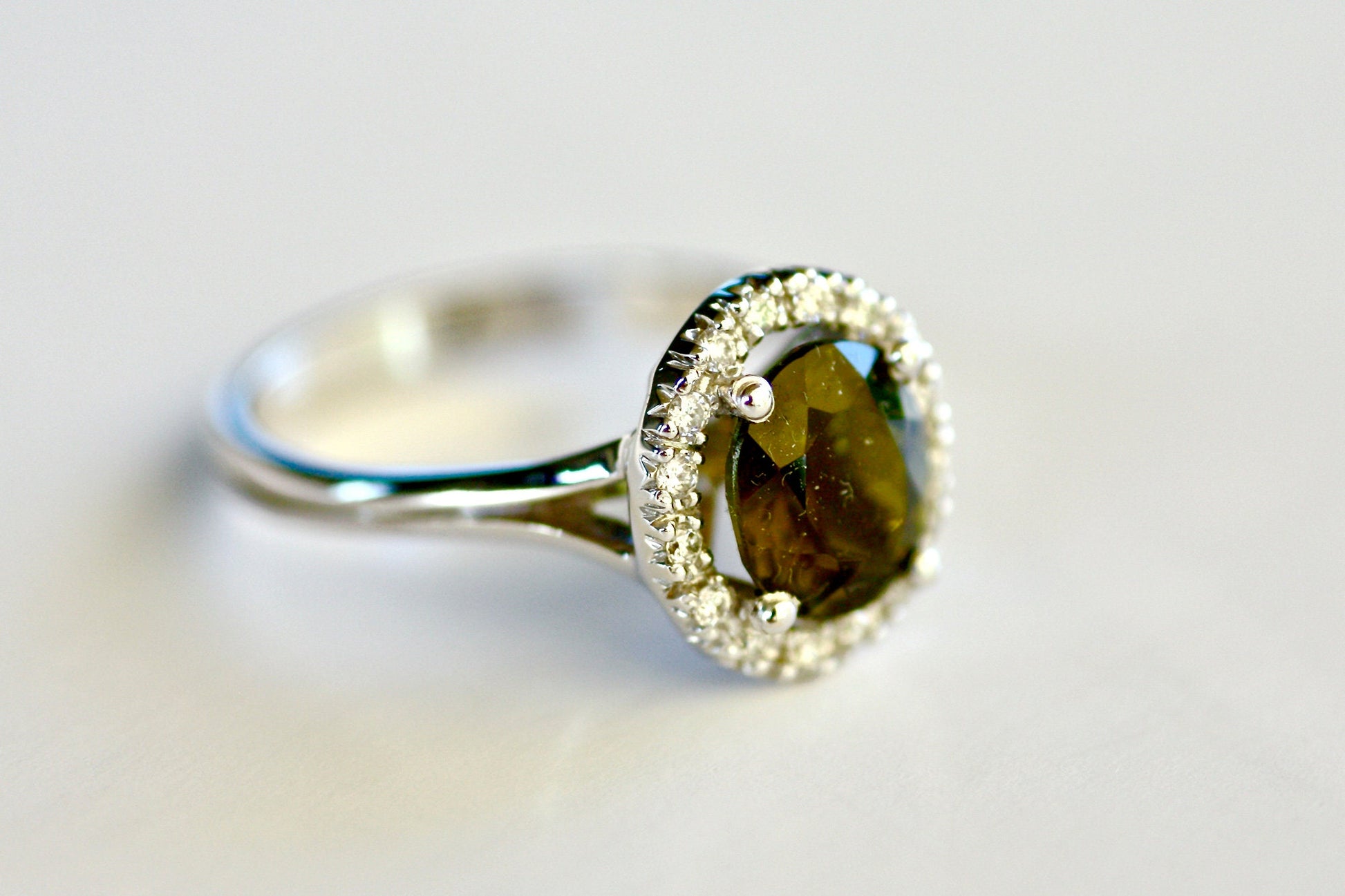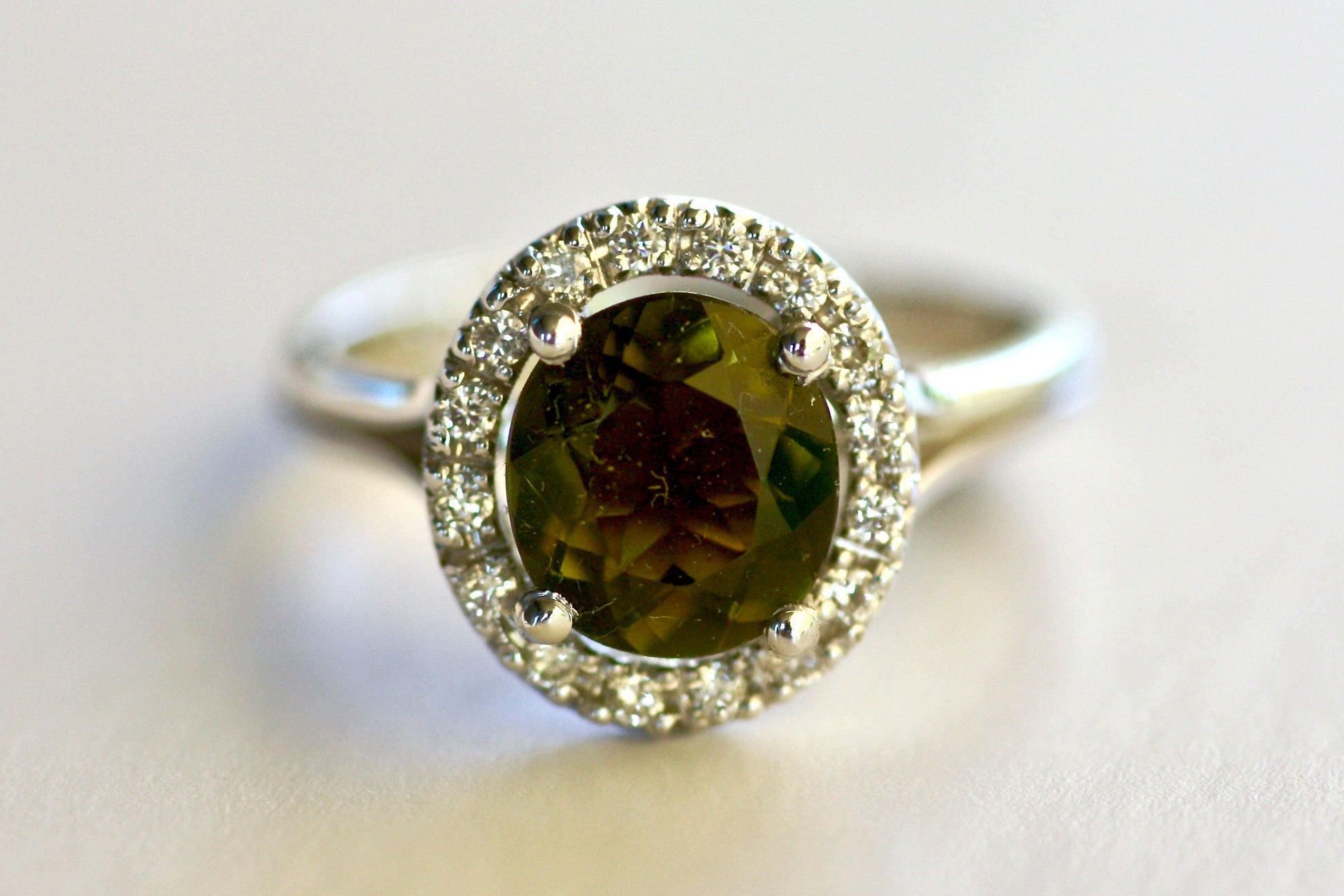 White gold ring with Tourmaline set with diamonds on this plain and simple design easy to wear.