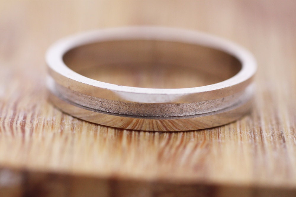 Unique and Modern Wedding Ring with Geometric Pattern, with a polished surface and brushed detailing. Stack it with one or two accent rings.