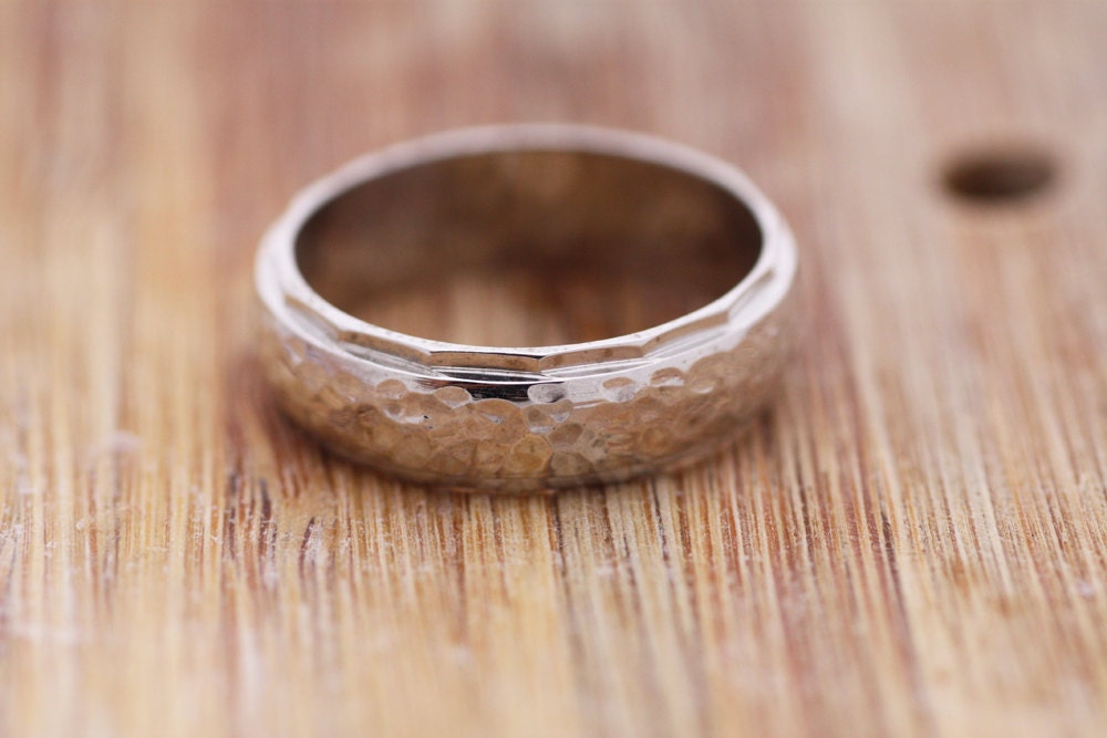 Mens hammered ring, this wedding ring is half-round in profile and made of solid 18K gold, 14K gold 9K or silver. The ring is finished with hammered effect and a shinny finish.