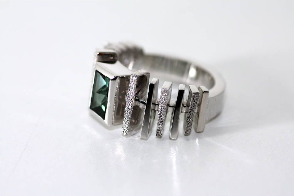 Handmade ring, amazing design, a beautifully handcrafted Tourmaline set on Sterling Silver white-gold plated. Tourmaline Green, weight is 0,76ct and dimensions 7,3x4,6mm, a gemstone that fits perfectly for this amazing and unusual design.