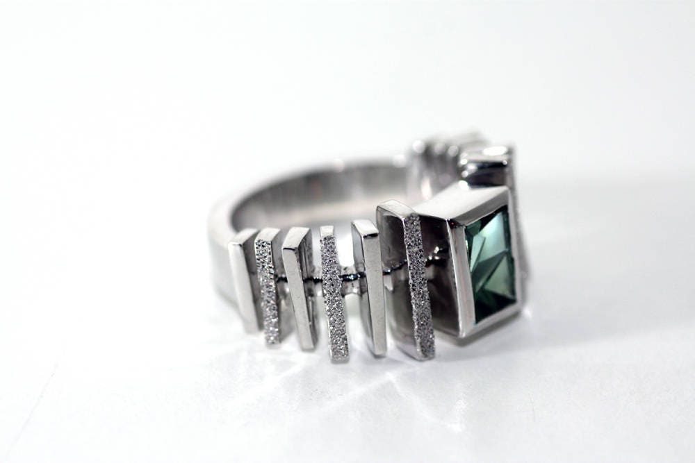 Handmade ring, amazing design, a beautifully handcrafted Tourmaline set on Sterling Silver white-gold plated.
