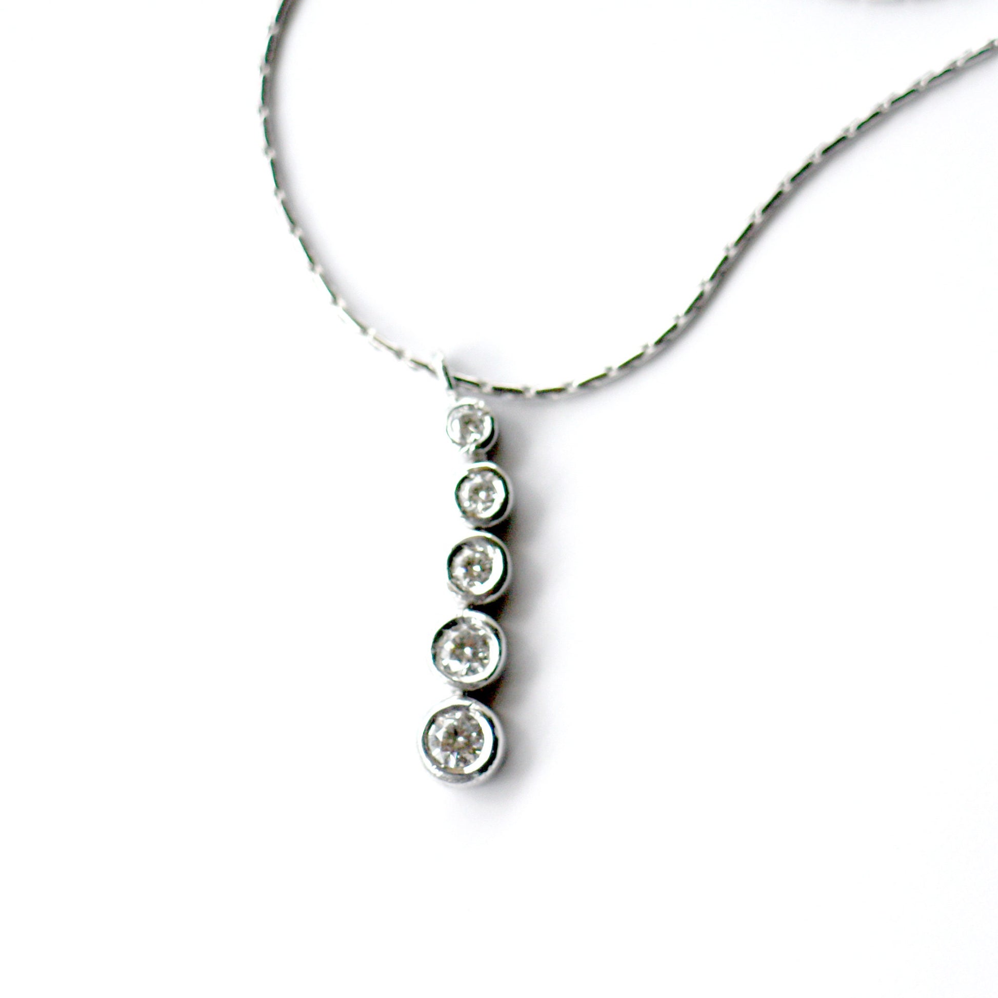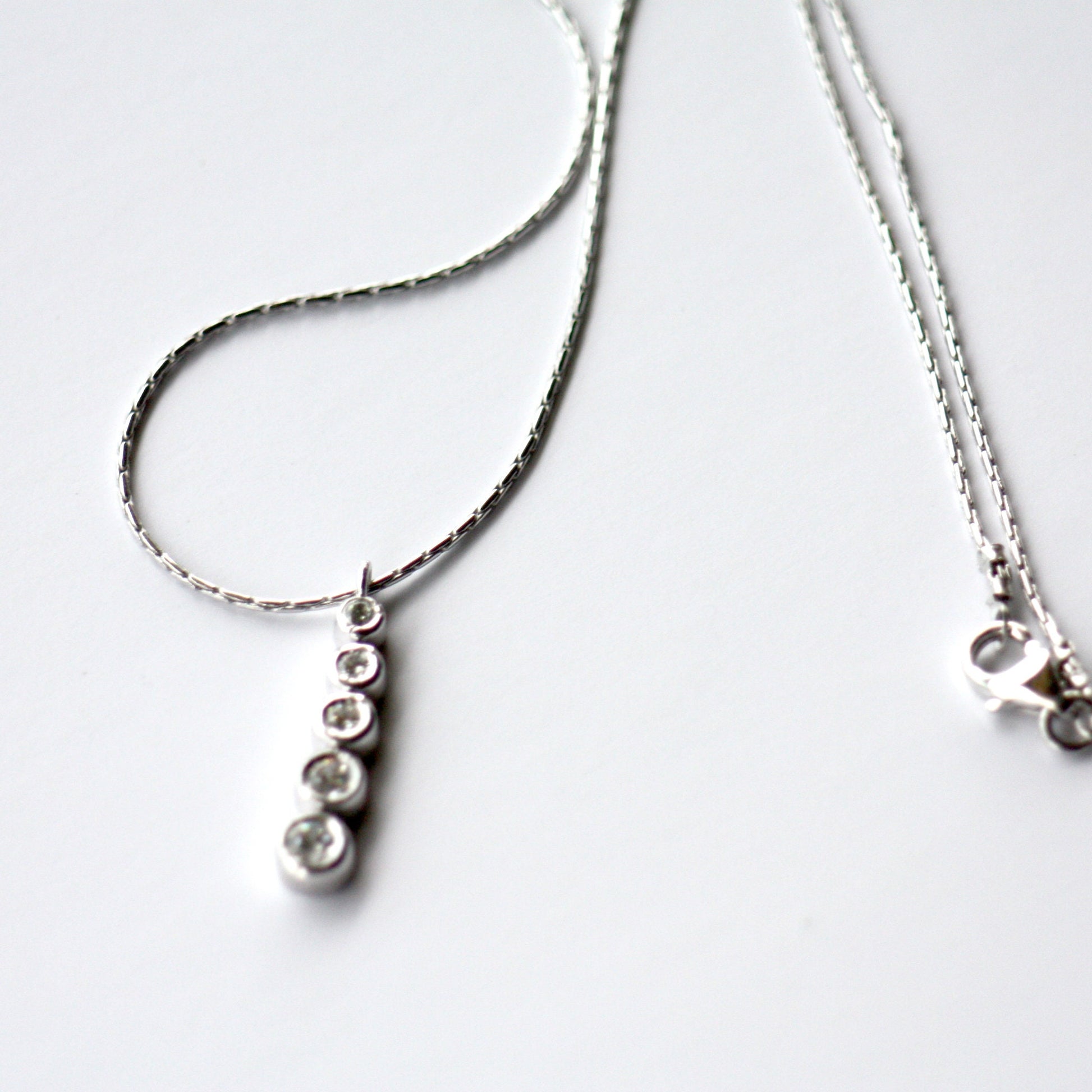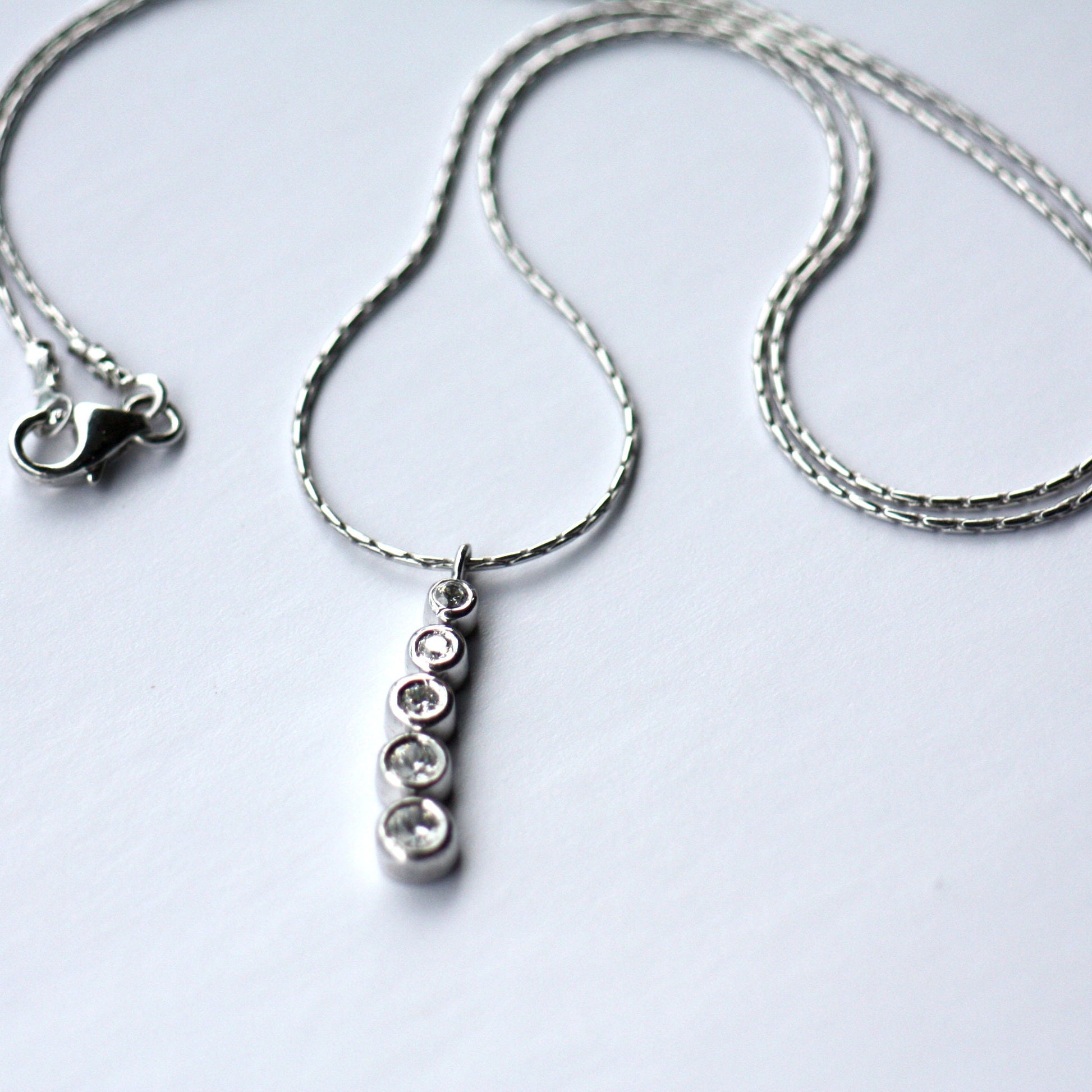 White Gold Linear diamond necklace with a K14 chain. Round brilliant cut Diamonds, starting from 0,02 to 0,06ct, total weight 0,20ct. Diamonds' characteristics are F colour - VS1 clarity and excellent cut. Perfect Engagement Bride Gift or Anniversary Gift