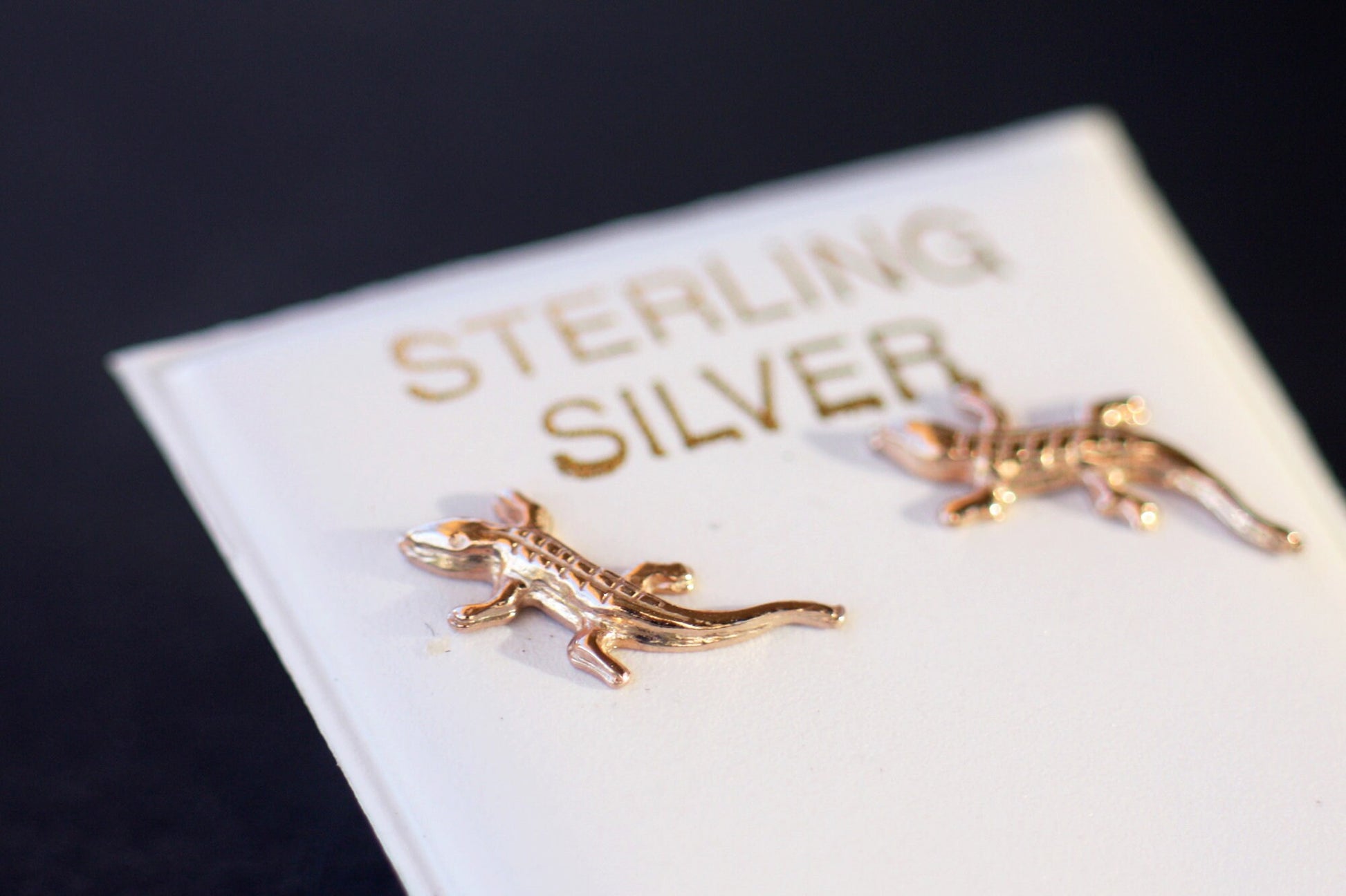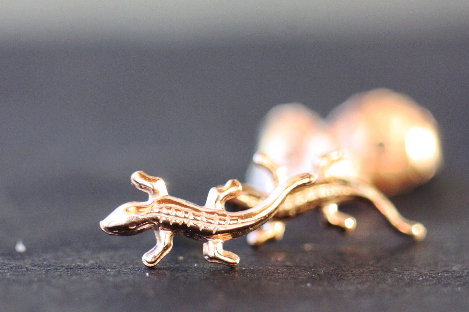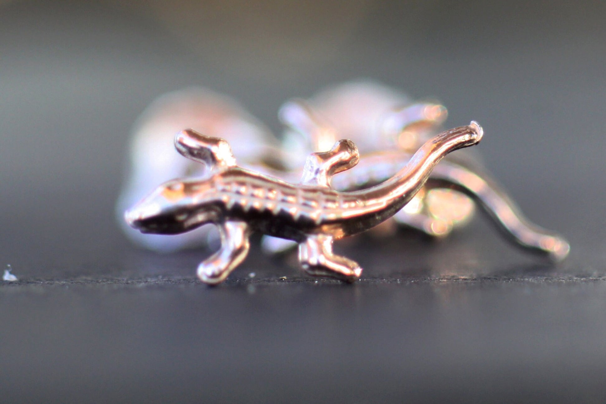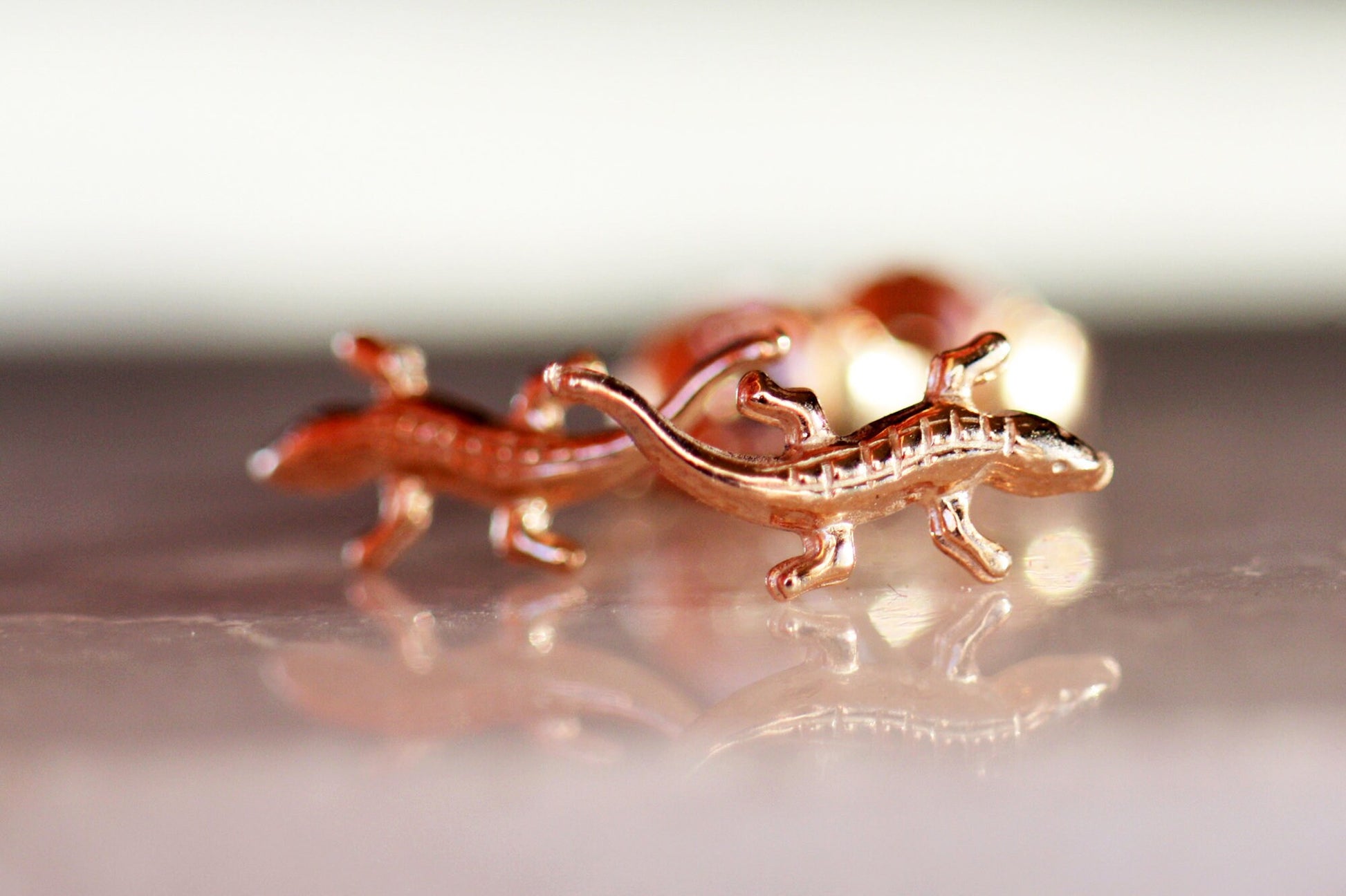 These minimalist studs are perfect for kids who love tiny animal accessories. These lizards earrings are a great gift for a bridesmaid, best friend, or as a treat for yourself. Made with sterling silver and rose gold plating, these hypoallergenic studs are safe for sensitive ears. With a length of 12 mm and a width of 6 mm, these earrings are just the right size for little ears. The rose gold plating adds a touch of elegance to the playful lizard design, making it suitable for both casual and dressy occasions. Thank you for considering these adorable lizard earrings. Make someone (or yourself) happy with this unique accessory by Petros Tezapsidis.
