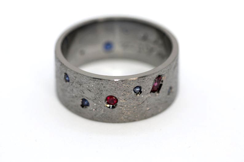 A multi-stone wide brushed ring with Rubies and Blue Sapphires, black-rhodium plated.