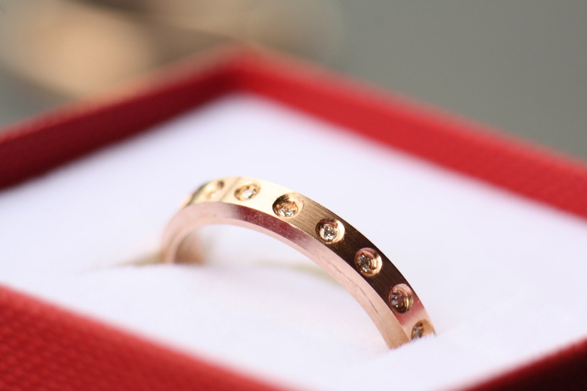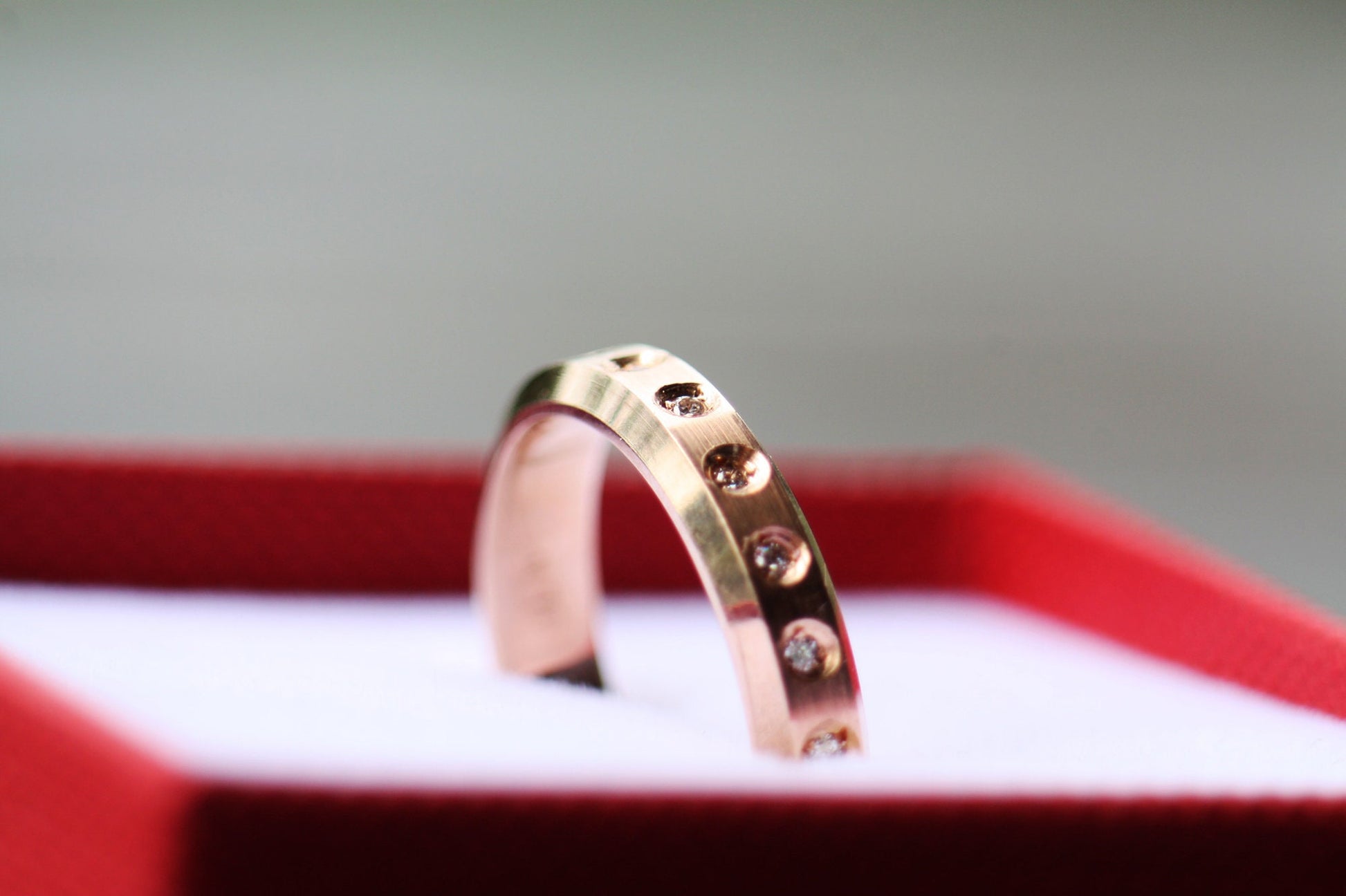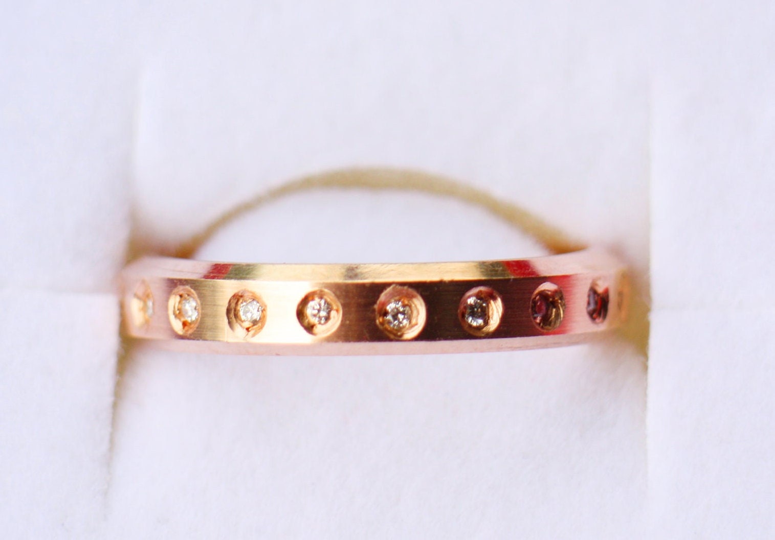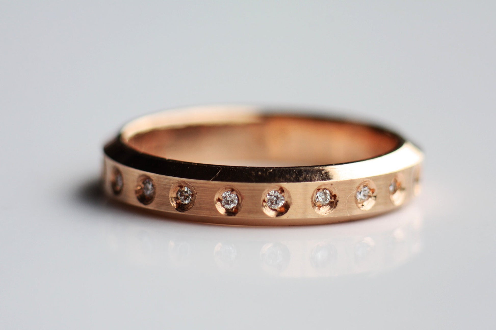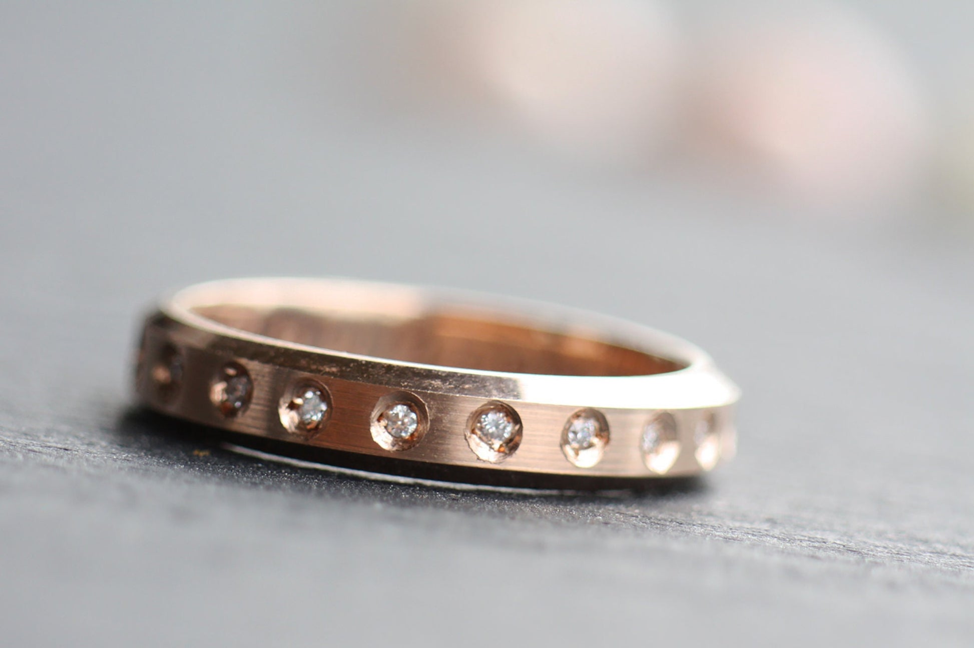 Eternity Gold Diamond ring for women completely inlaid with 20 exceptional diamonds, made of Gold 9K,14K or 18K, excellent finish, originally made at 5.mm wide and 1.4mm thick, but they can be custom made thinner or wider for you. Please contact me for other gemstones