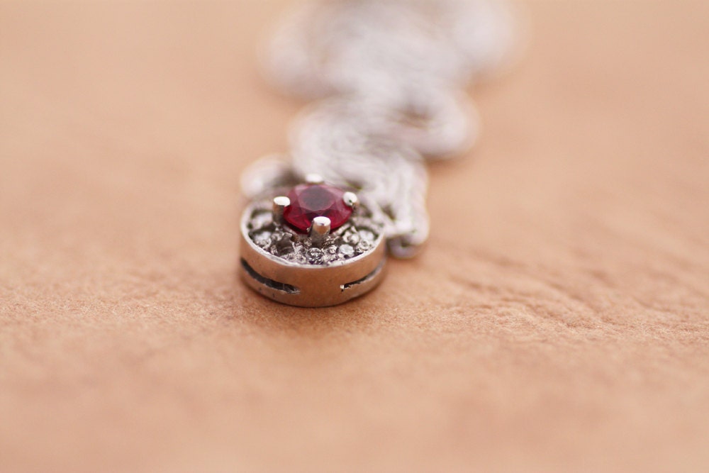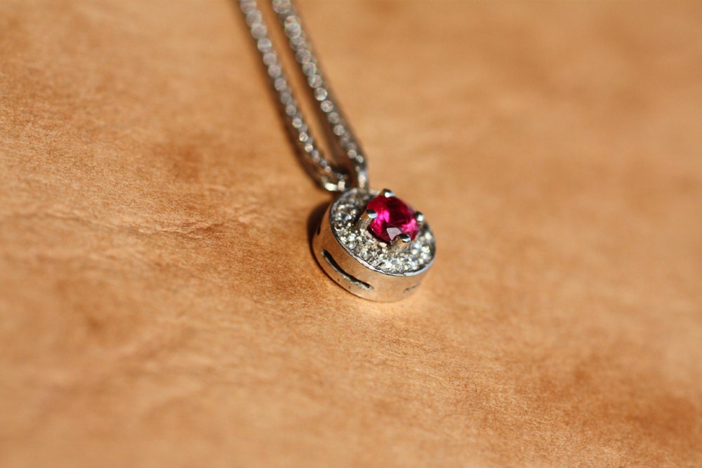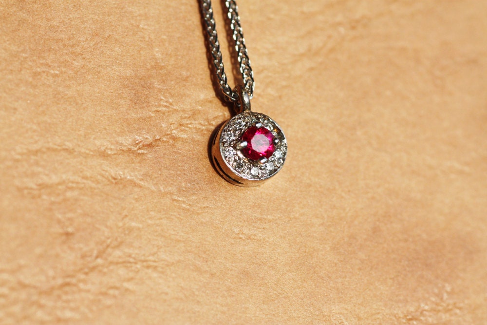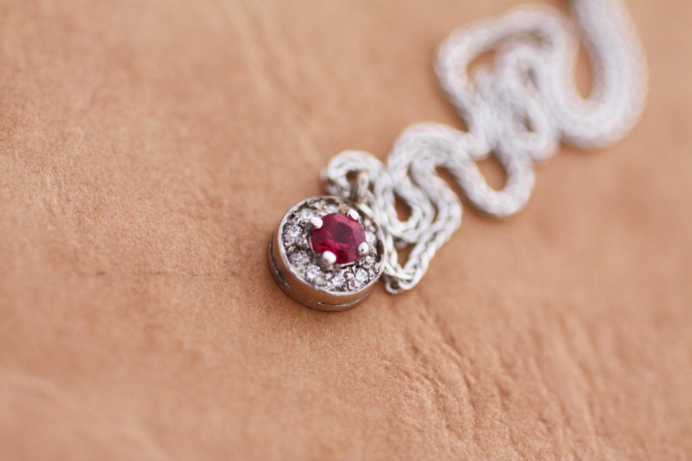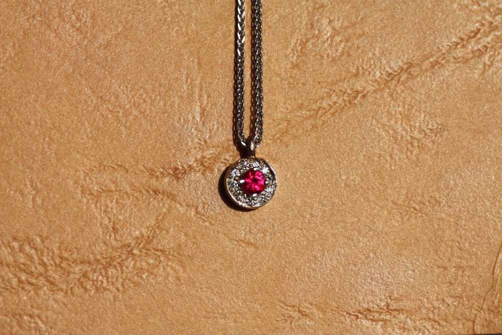 This stunning pendant features a natural ruby weighing 0.15 carats that is beautifully complemented by ten brilliant round diamonds. Crafted from solid 18K white gold, this piece is the perfect way to express your love for someone special, especially if they were born in July. At checkout, you can choose from three different gold colors: White, Yellow, or Rose.