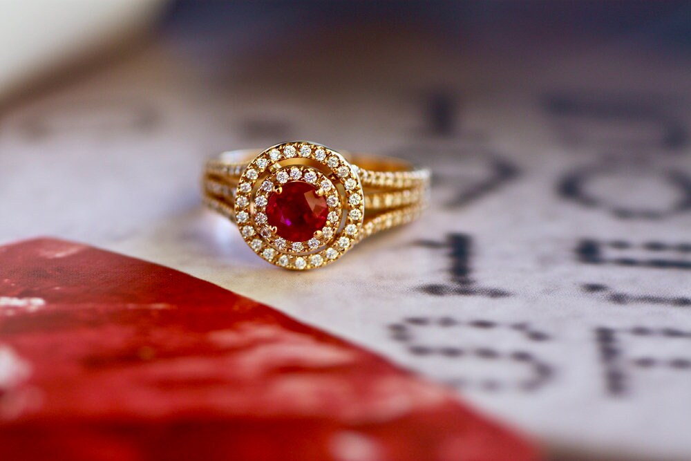 Ruby mounted on a Yellow Halo gold ring surrounded by diamonds.