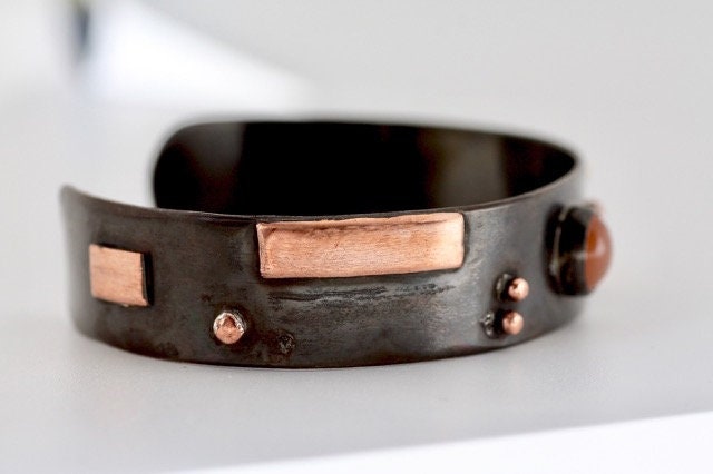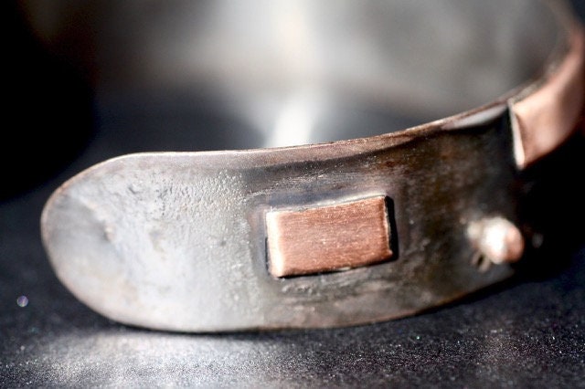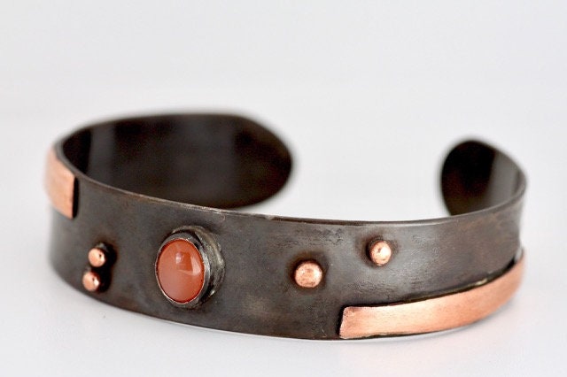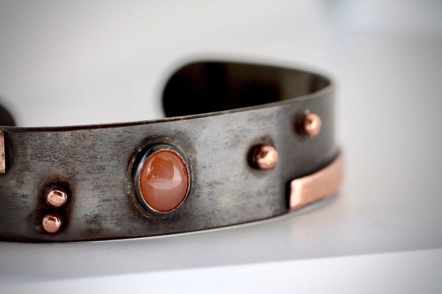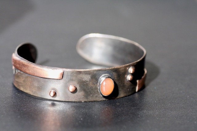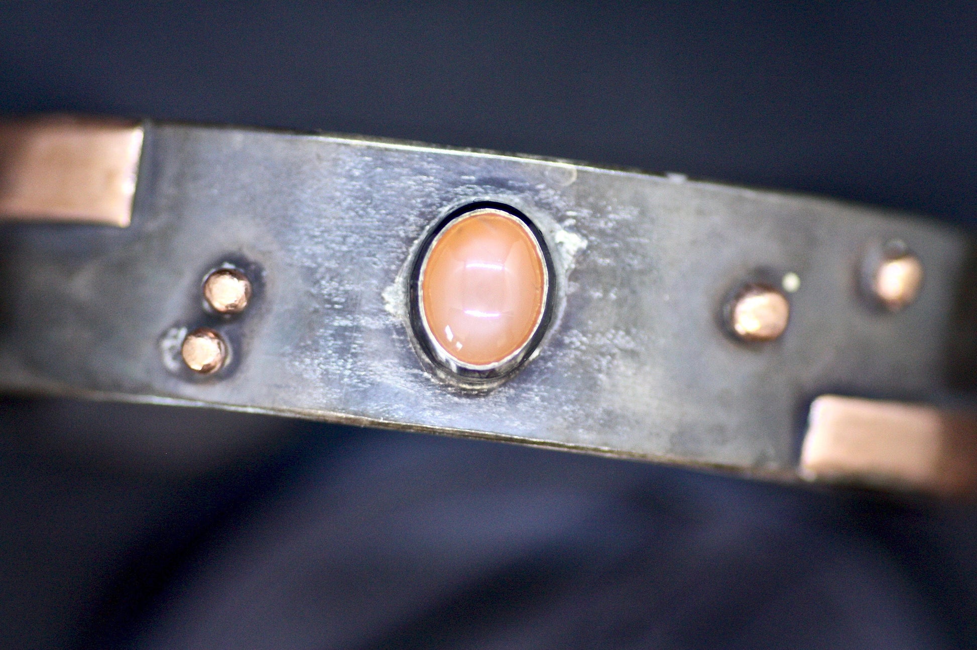 Rustic Sterling Silver and Copper with Peach Moonstone cuff