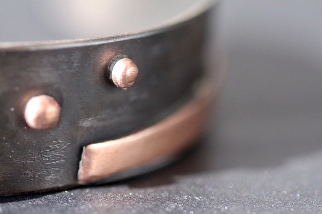 Rustic Cuff bracelet made of Sterling Silver, with copper details and an orange oval Moonstone in the centre. An oval Peach Moonstone 2,5 ct and 7X9mm, beautiful cabochon cut set on Sterling Silver.