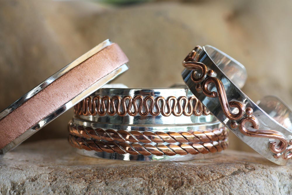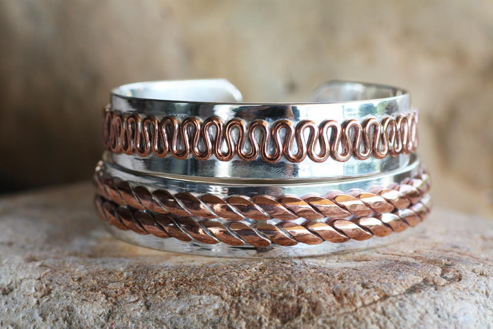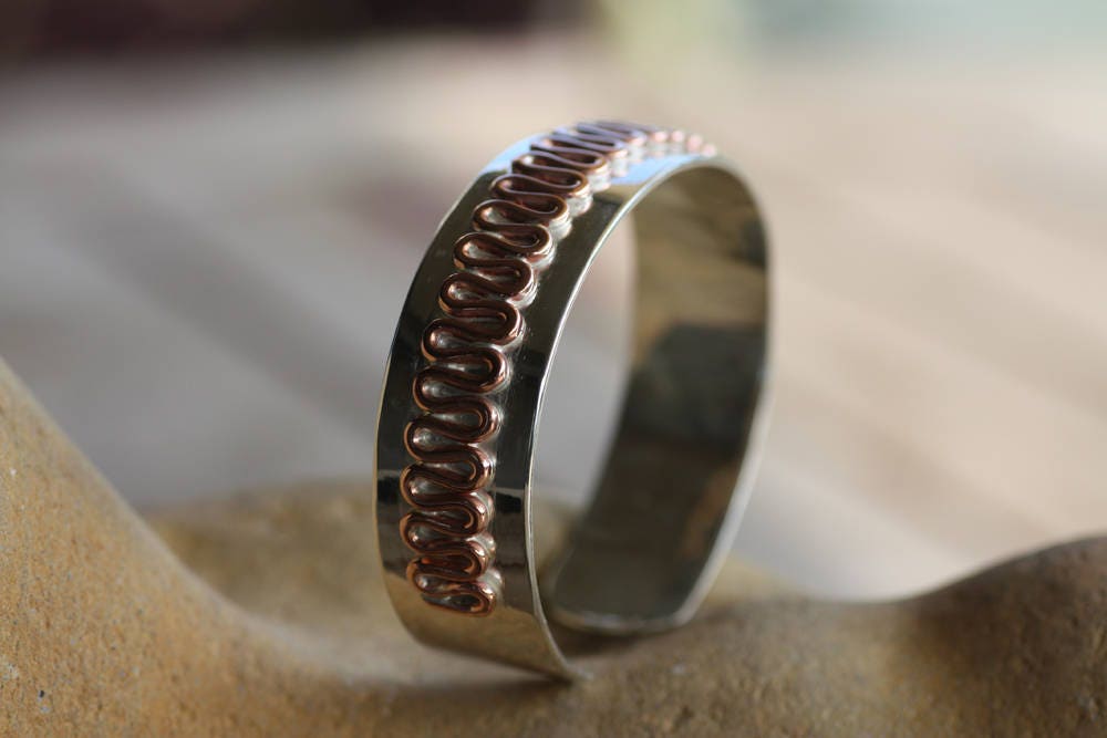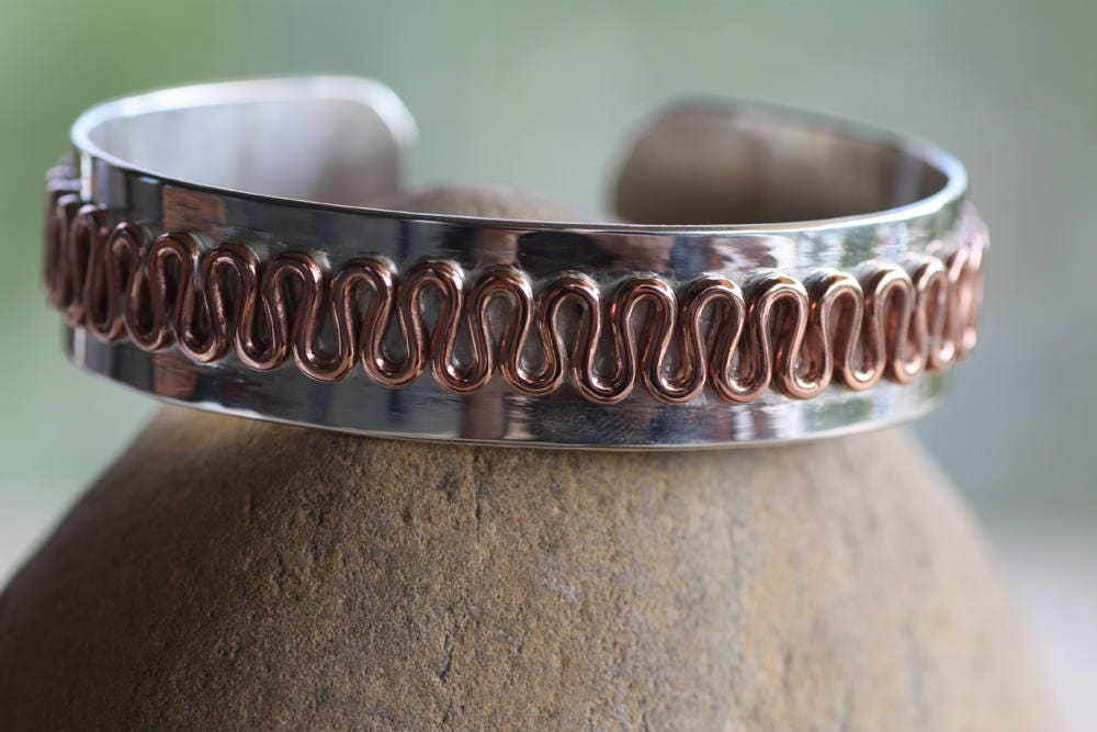 Handcrafted Sterling Silver 950 Cuff with striking copper accents. Flat and wide, this Cuff is comfortable to wear and boasts a unique texture and design. A Sterling Silver 950 stamp ensures superior craftsmanship. This bracelet has a total circumference of 30mm and a width of 1mm (can be adjusted to desired size upon request). The overall size measures 7.75-8.25 inches (19.7-21 cm) with a gap of 1.25 inches (3.2 cm). Every piece is delicately crafted with hand-controlled tools, built upon a family tradition of 95 years of made-to-order jewelry. Quality guaranteed.
