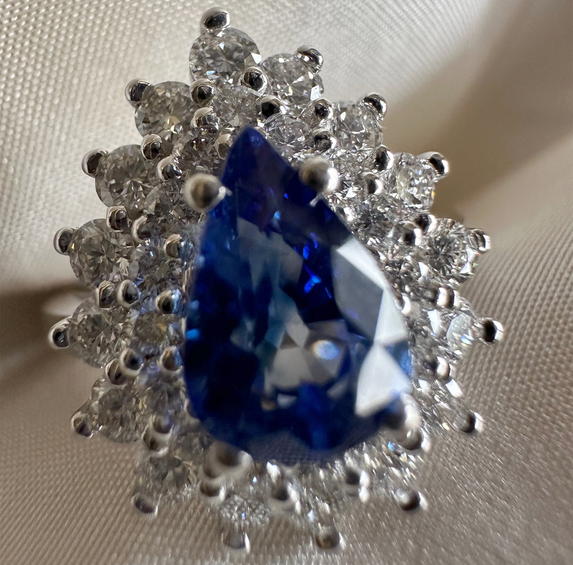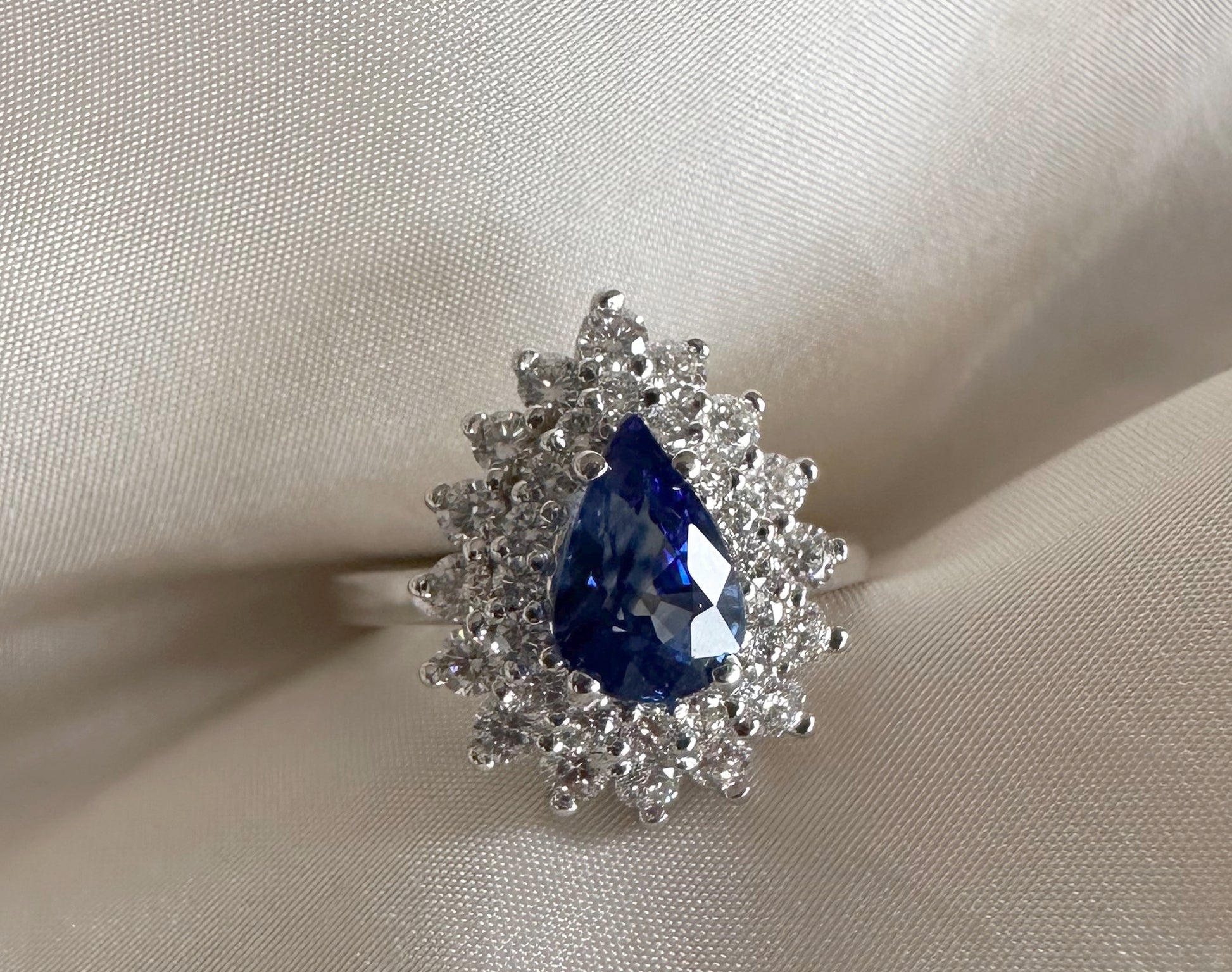 This exquisite engagement ring features a beautifully shaped core, surrounded by a border of 18 sparkling diamonds that highlight the striking blue sapphire at its center. Crafted from K18 white gold, the ring showcases brilliant-cut diamonds with a total weight of 0.80 carats, resulting in a stunning and timeless design. The centerpiece sapphire is of excellent cut and luster, making this high-end jewelry piece truly special.