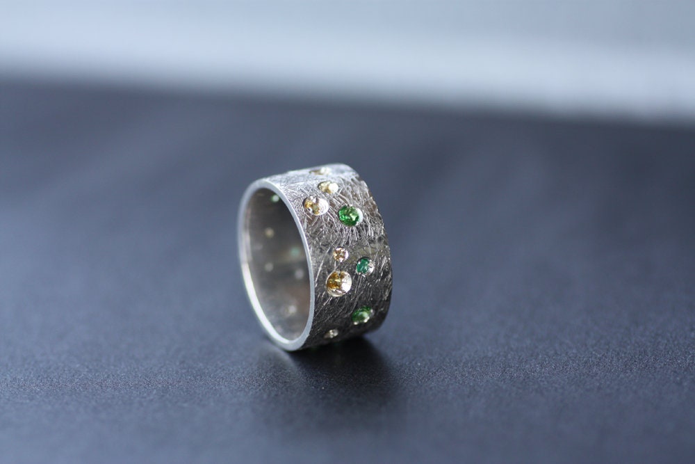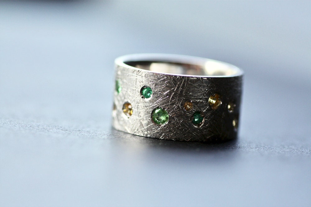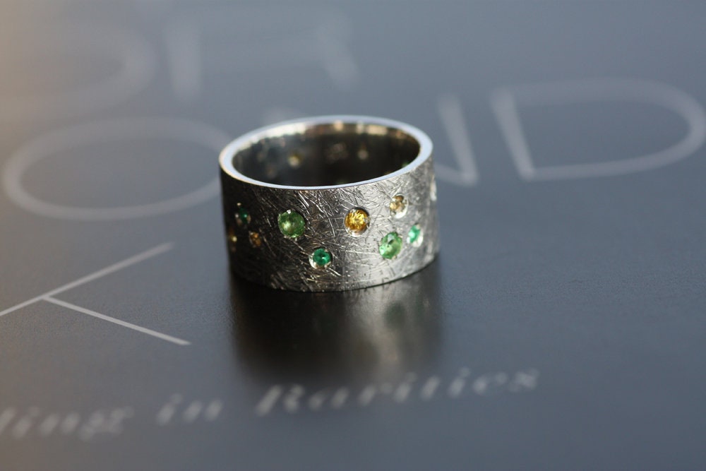 A multi-stone wide diamond brushed band. Yellow sapphires Cognac Diamonds, Tsavorites & Emeralds mounted on Sterling Silver delivering a unique piece of art