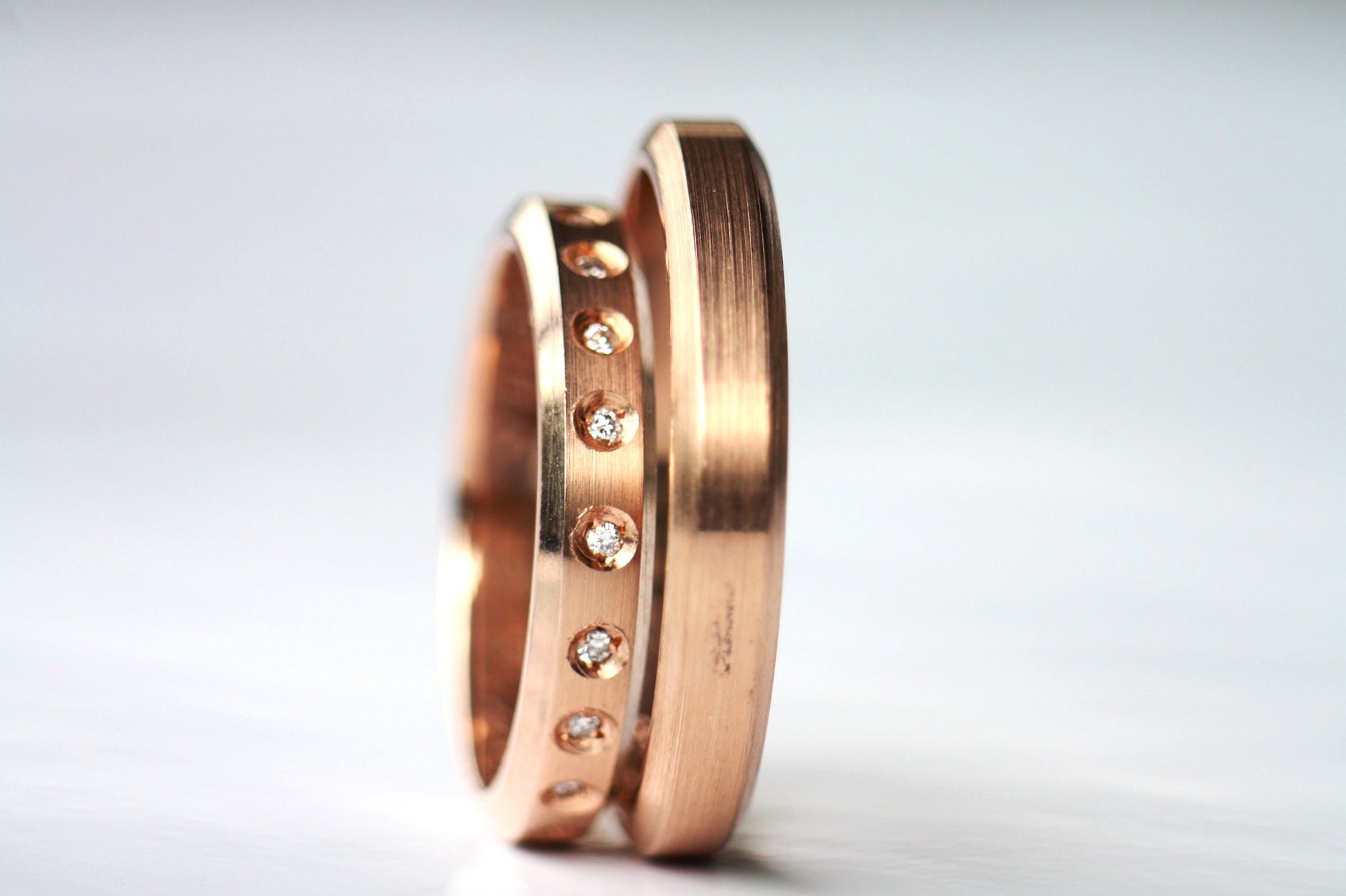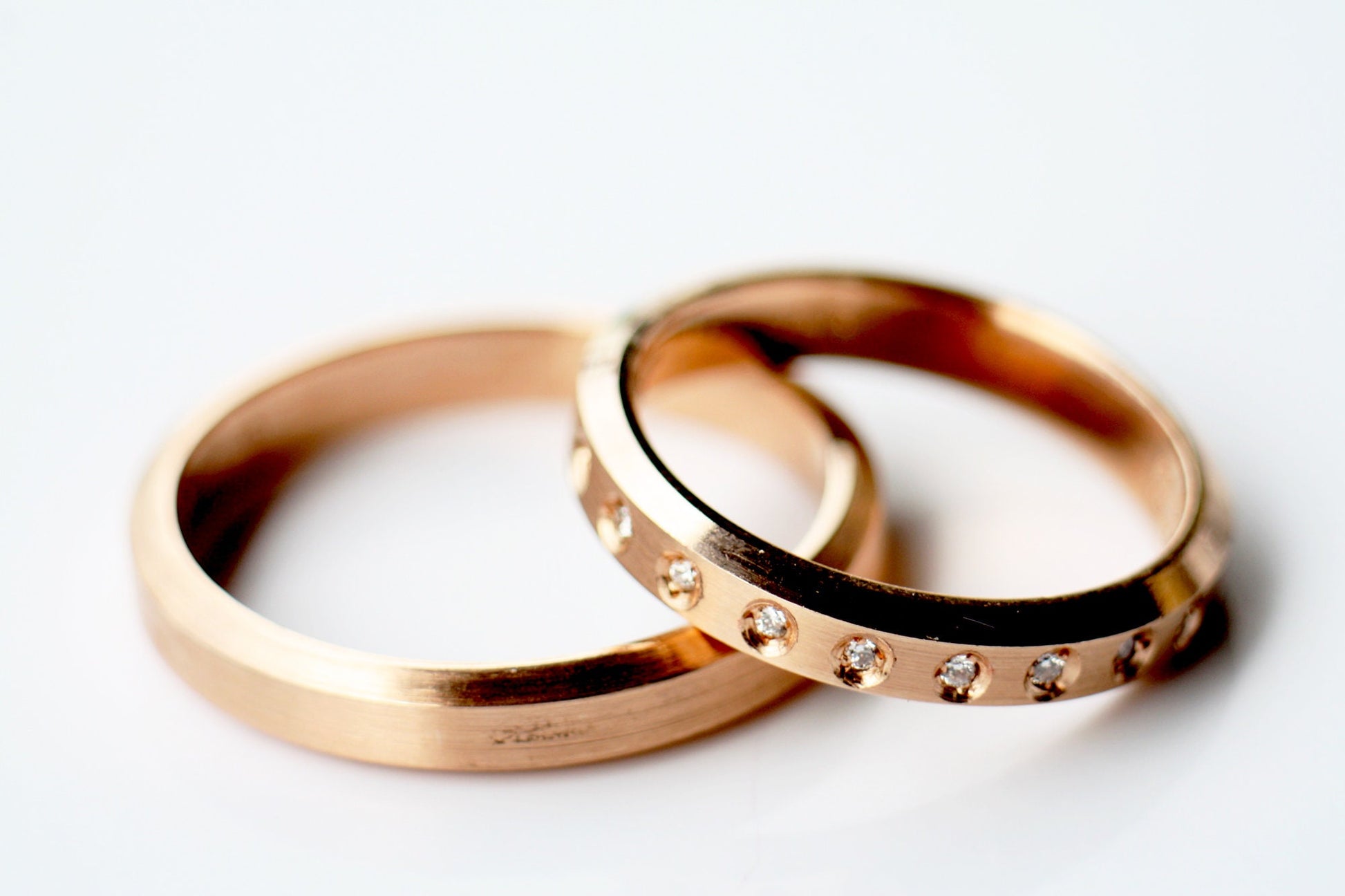 The set includes two rings, that are made of Gold 9K, 14K or 18K, one of which is a plain solid gold ring while the other is an eternity ring completely inlaid with 20 exceptional diamonds. The rings come with excellent finishing and are originally made 5 mm wide and 1.4mm thick. However, we can customize them to be thinner or wider for you according to your preference.