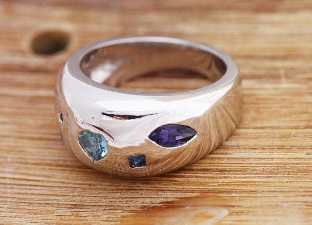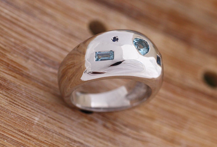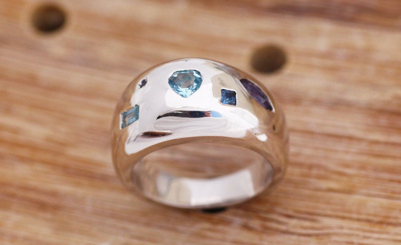 A beautiful wide band ring with several blue precious stones. Wear this unique ring from the morning walk to the special day that you will need "something blue".