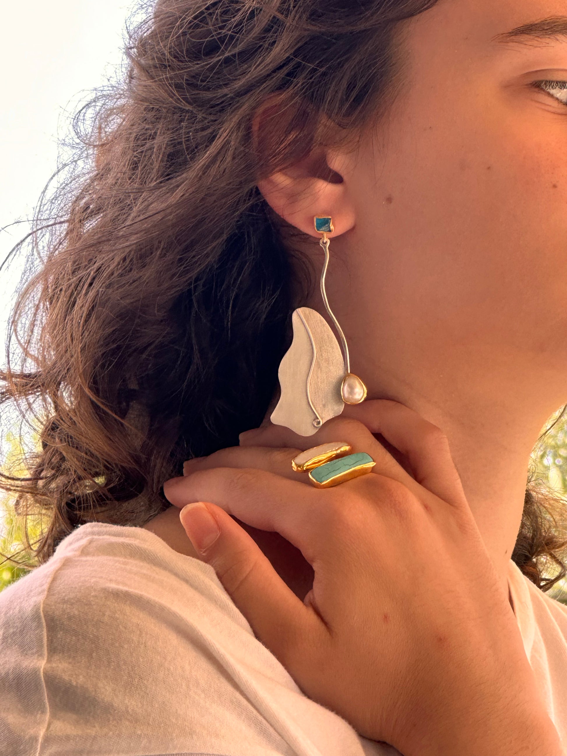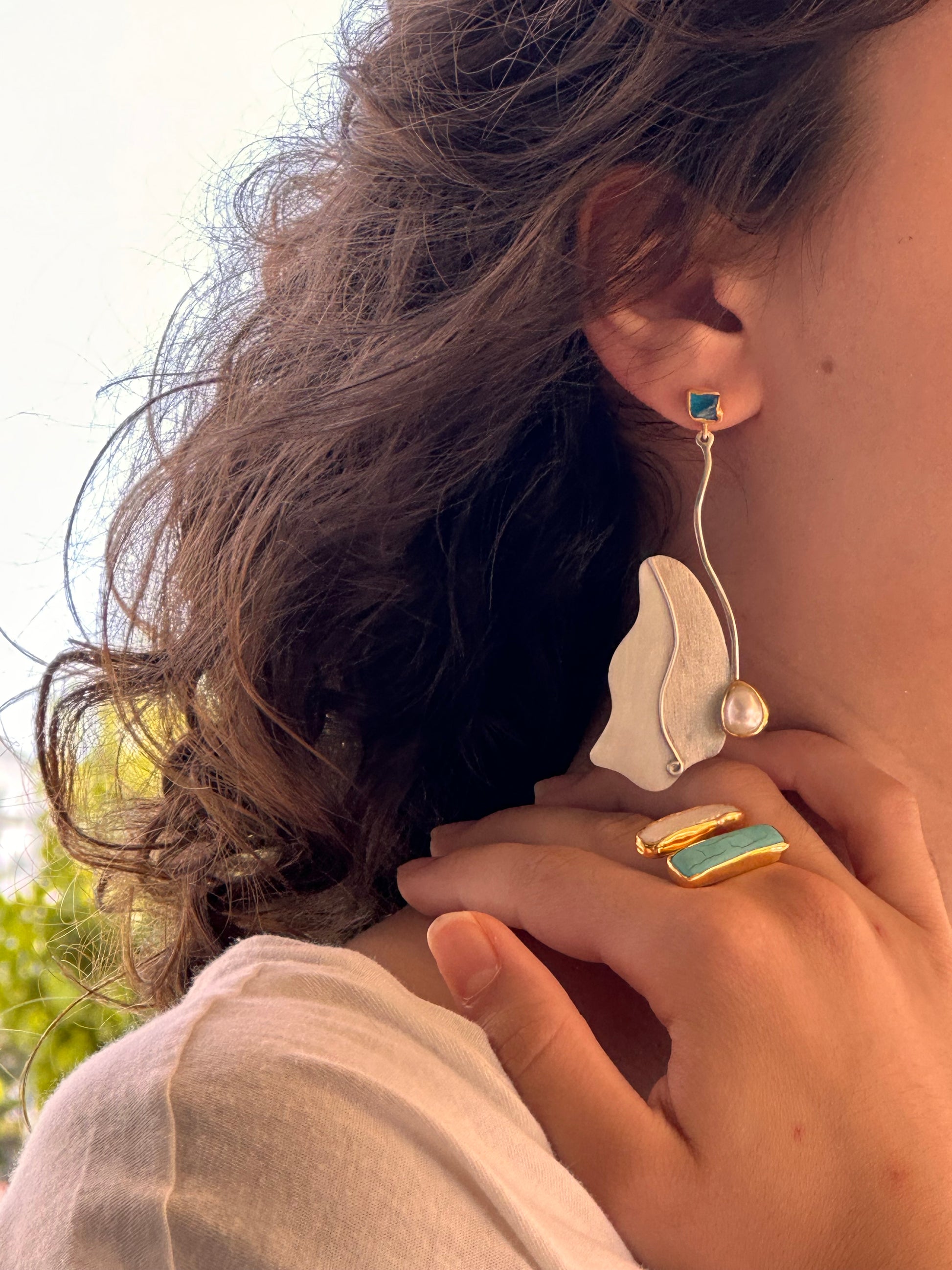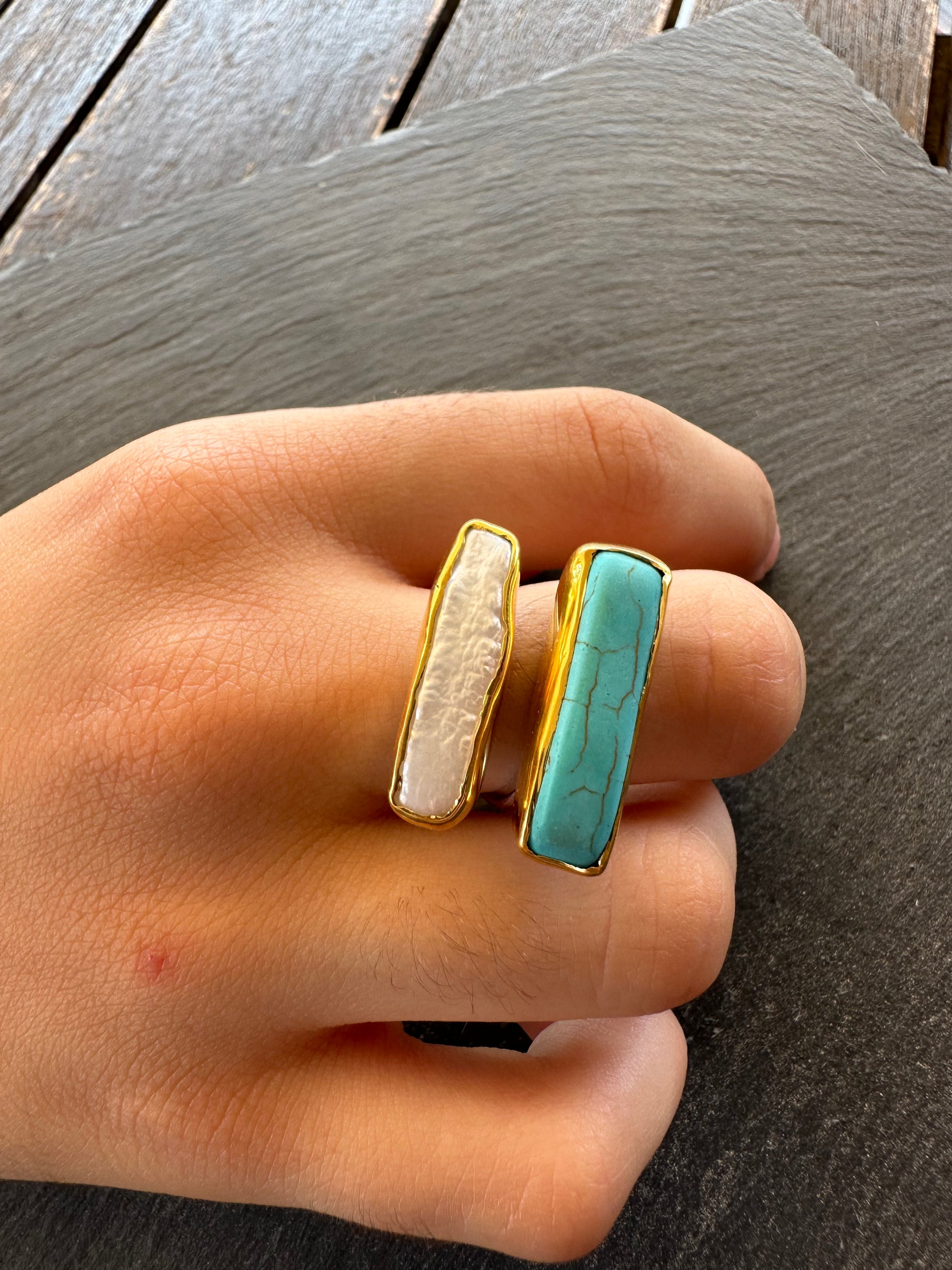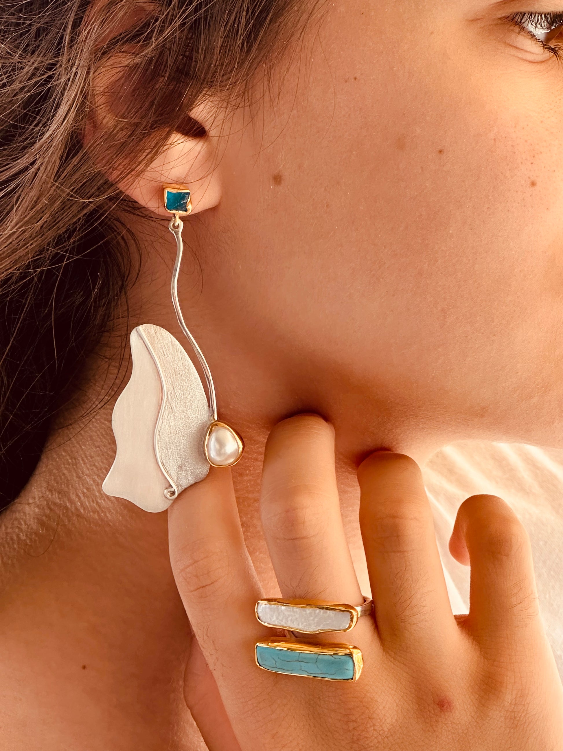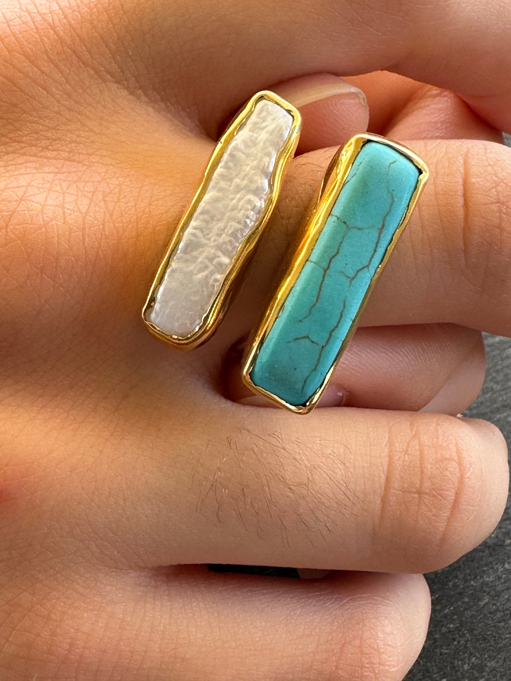 This sterling silver gold-plated ring is exquisitely adorned with a combination of turquoise and mother of pearl, completing the perfect look when paired with the accompanying earrings.