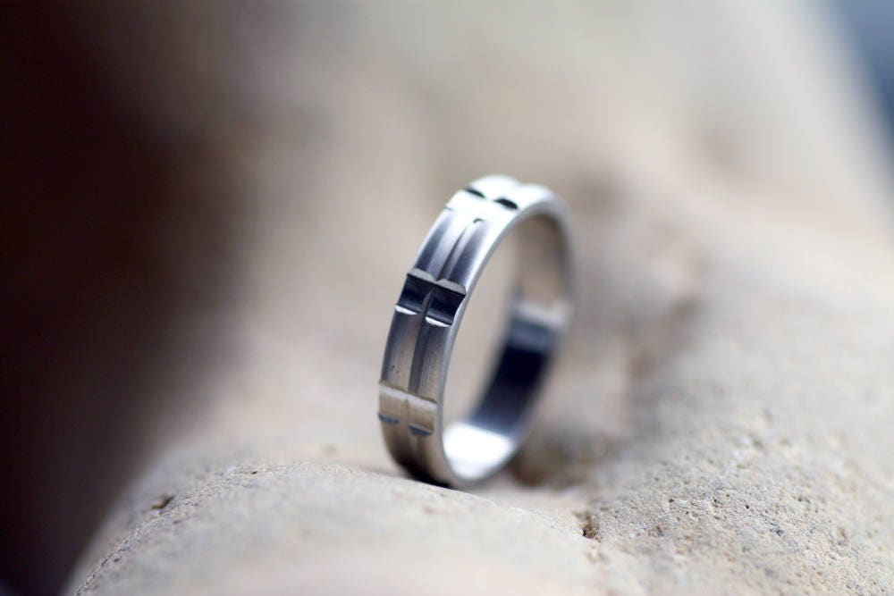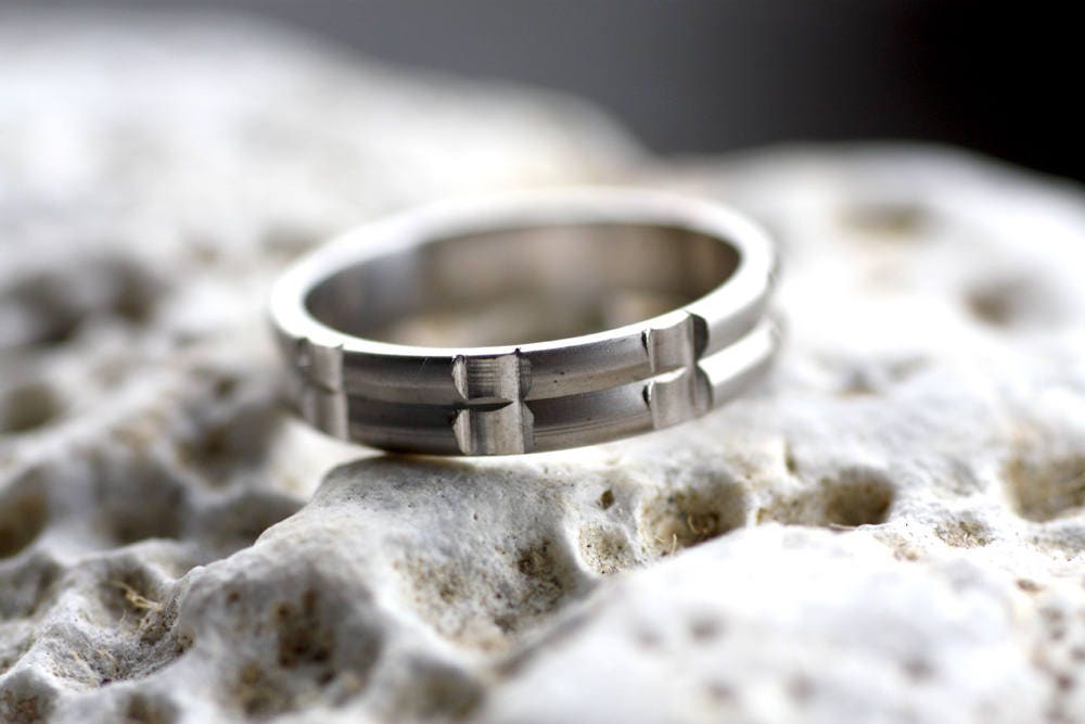 Wedding bands in white gold or sterling silver with simple lines, excellent finish, originally made at 4.5mm wide and 1.4mm thick, but they can be custom-made thinner or wider for you.