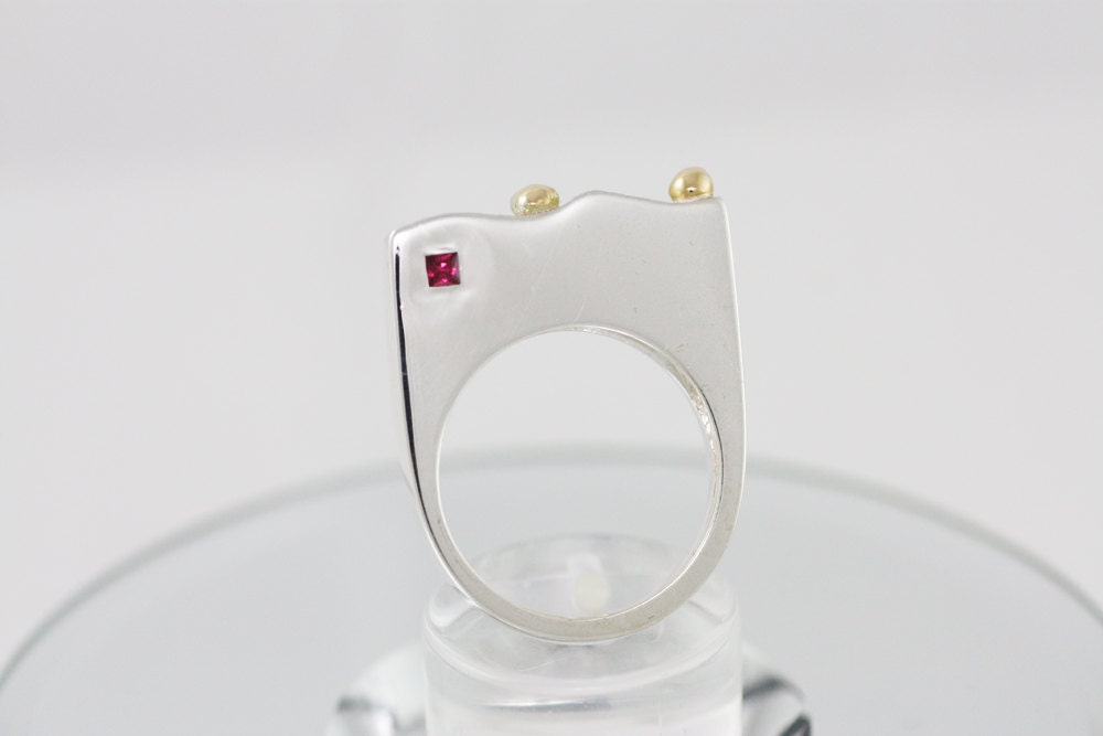 A Sterling Silver ring, a very fine princess cut ruby, mounted on Sterling Silver with a Golden K18 detail make a very interesting combination of high quality materials.