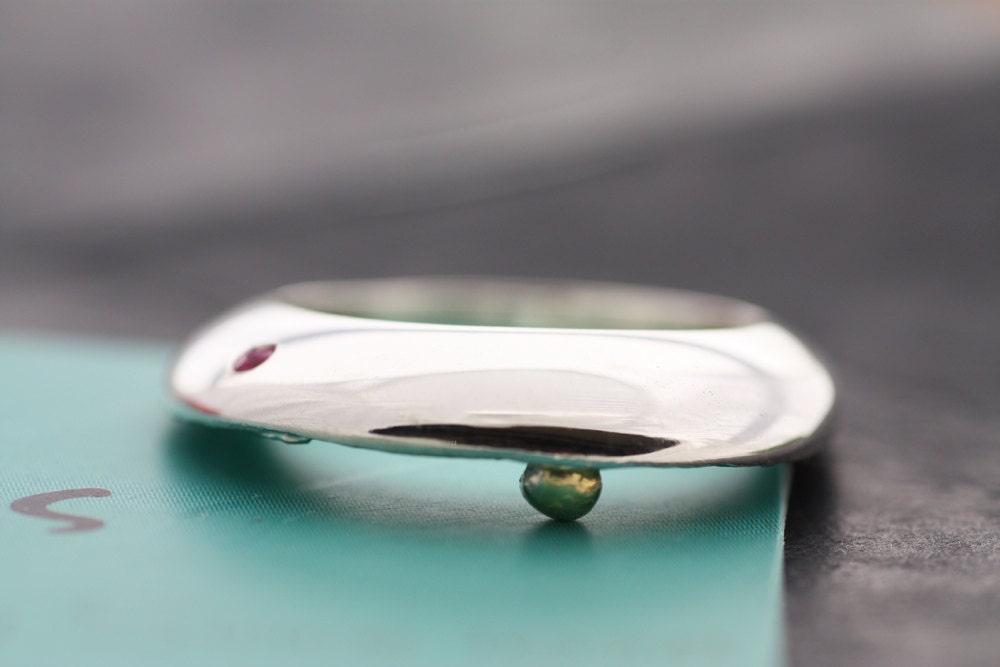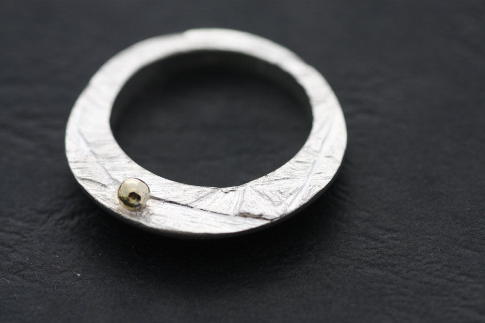 Sterling Silver ring with pink Sapphire and Gold K18. One side is textured and the opposite is carefully polished, 1 sphere of Gold K18 on the side and a very fine round pink sapphire 0,02 ct set on the polished side apart a top quality combination.
