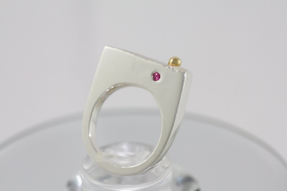 Silver ring with pink Sapphire and Gold K18 detail, Birthday ring for her, April Birthstone.