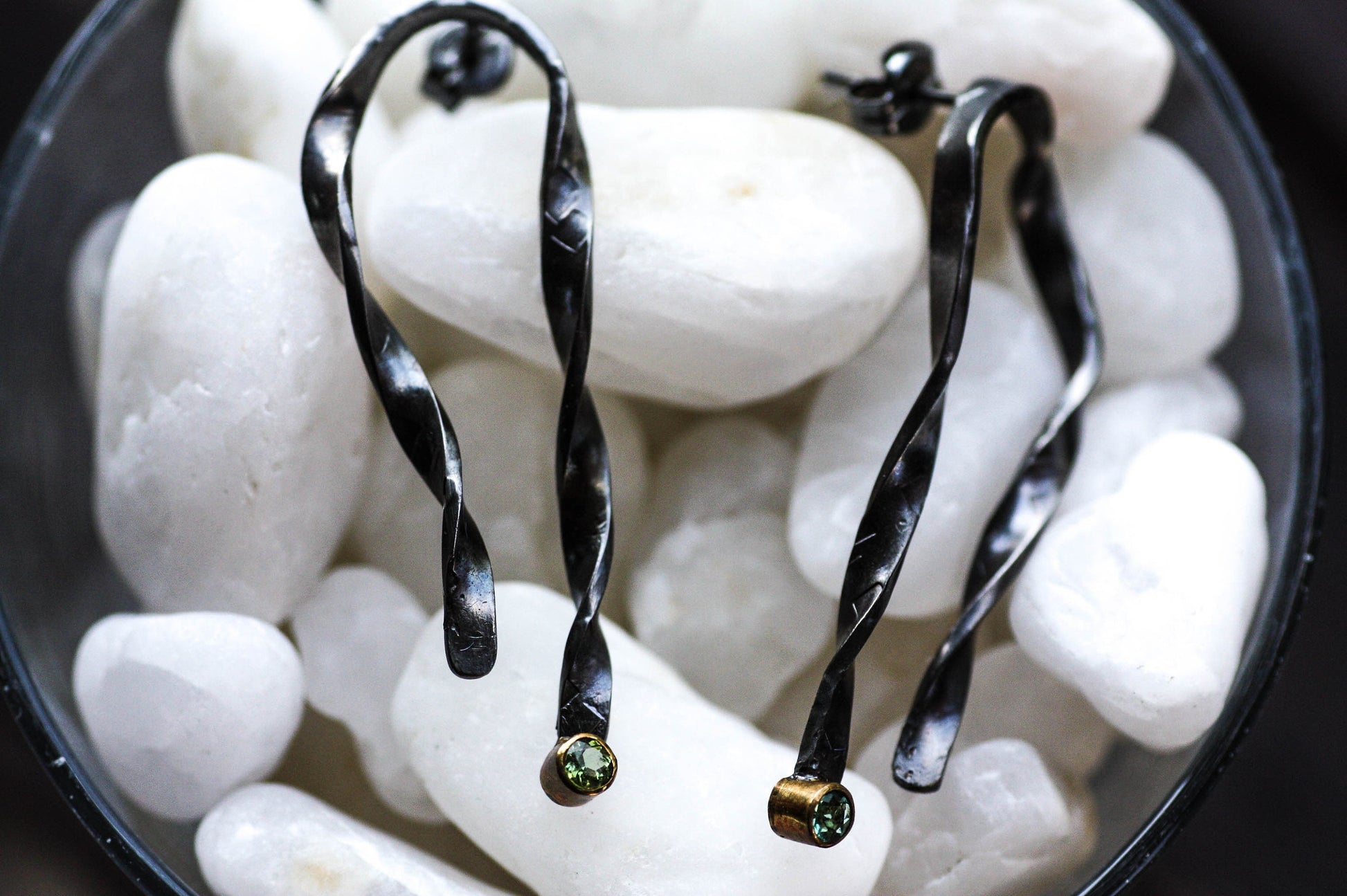 Mismatch lightweight earrings, Two beautiful round greenish Tourmalines with different hues set on Sterling Silver yellow gold plated. The main part is Black Rhodium plated giving a strong contrast.