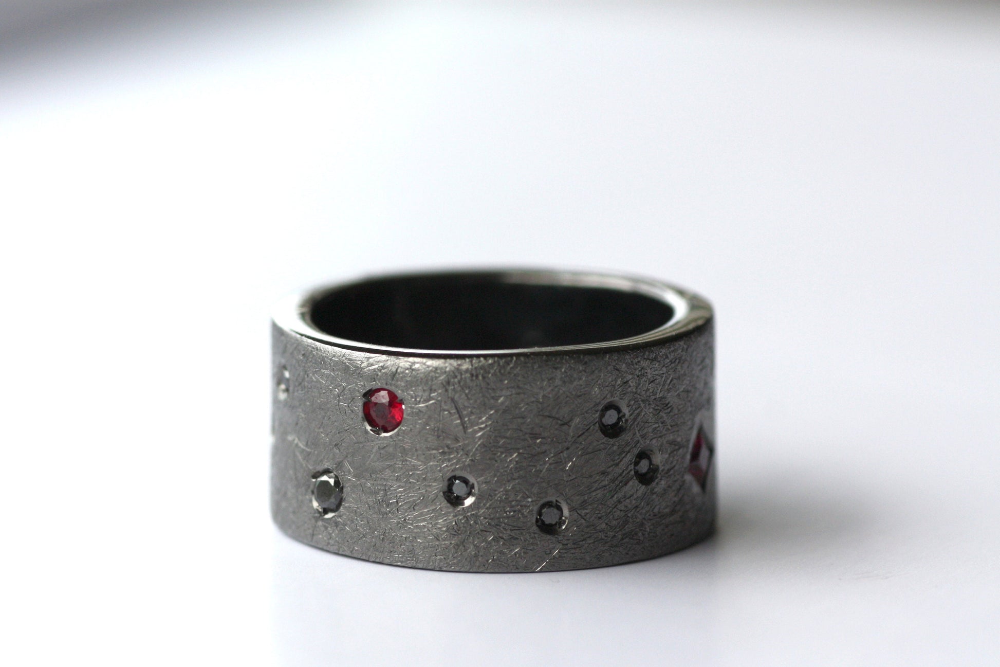 A multi-stone wide diamond brushed band. Tsavorite & Emeralds mounted on Sterling Silver deliver a unique piece of art. A beautiful cocktail band with a diamond brushed finish, white gold plated.